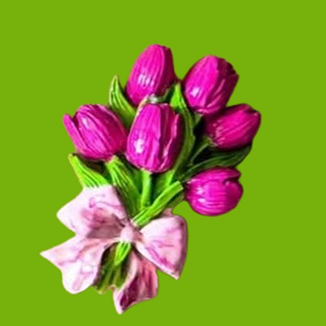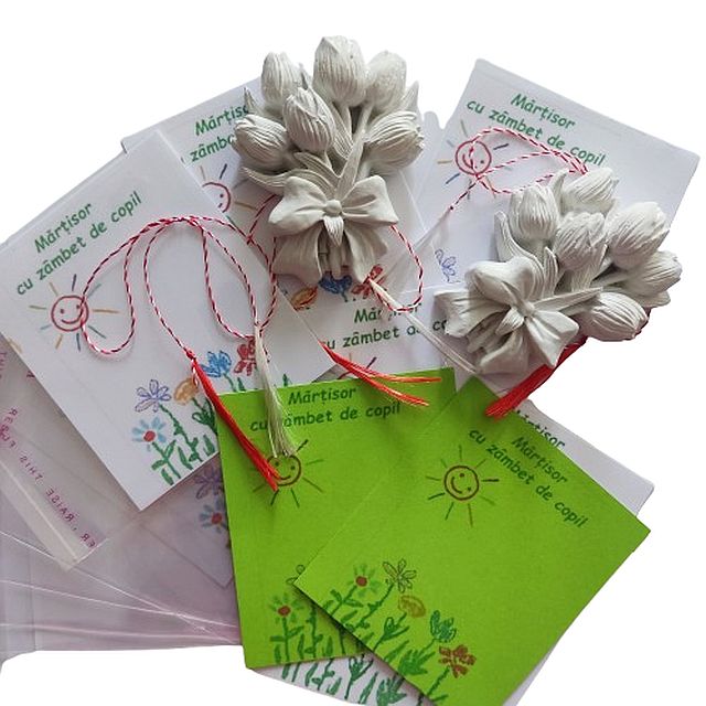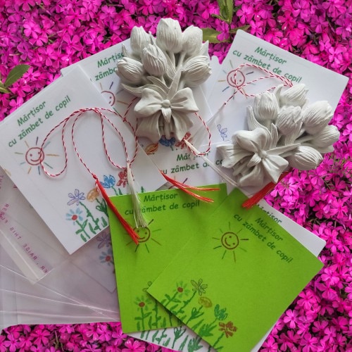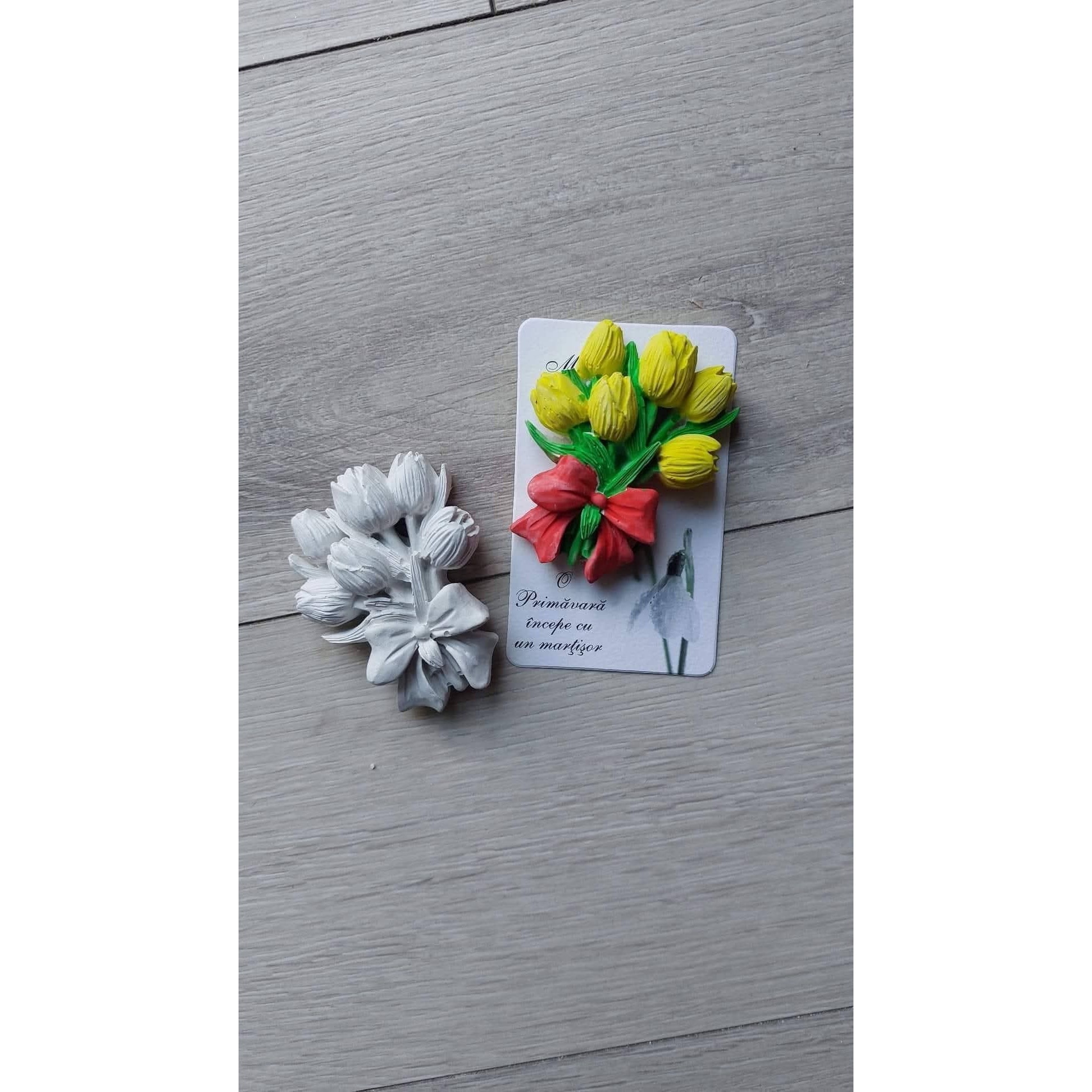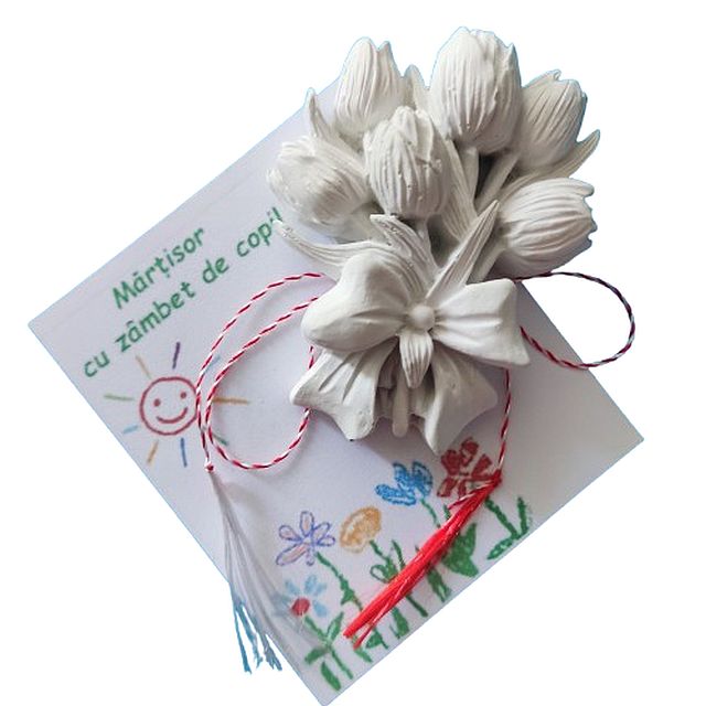 Figurina Ipsos de pictat - Martisor - Buchet lalele cu snur, cartonas si ambalaj, dimensiuni cuprinse intre 6, 5-5 cm