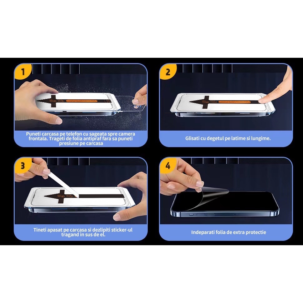 | Continut pachet | - 2 servetele, unul umed unul uscat pentru curatare Kit montare Instructiuni montaj 1 Banda adeziva praf 1 Folie Protectie 2 x Sticker indepartare praf |