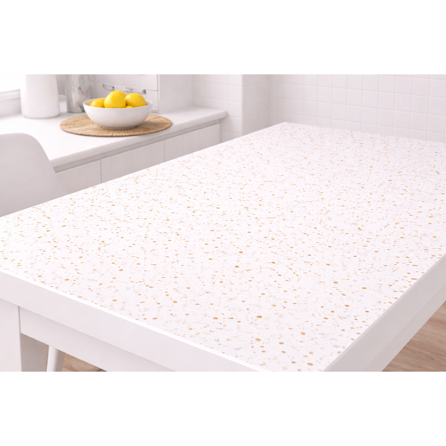 Folie protectie masa PVC siliconat transparent cu model terrazzo alb cu insertii aurii si argintii, 60 x 100 cm, 0, 6 mm, impermeabila, flexibila, usor de curatat