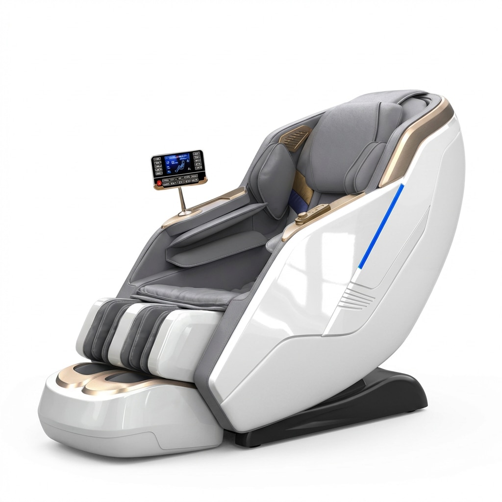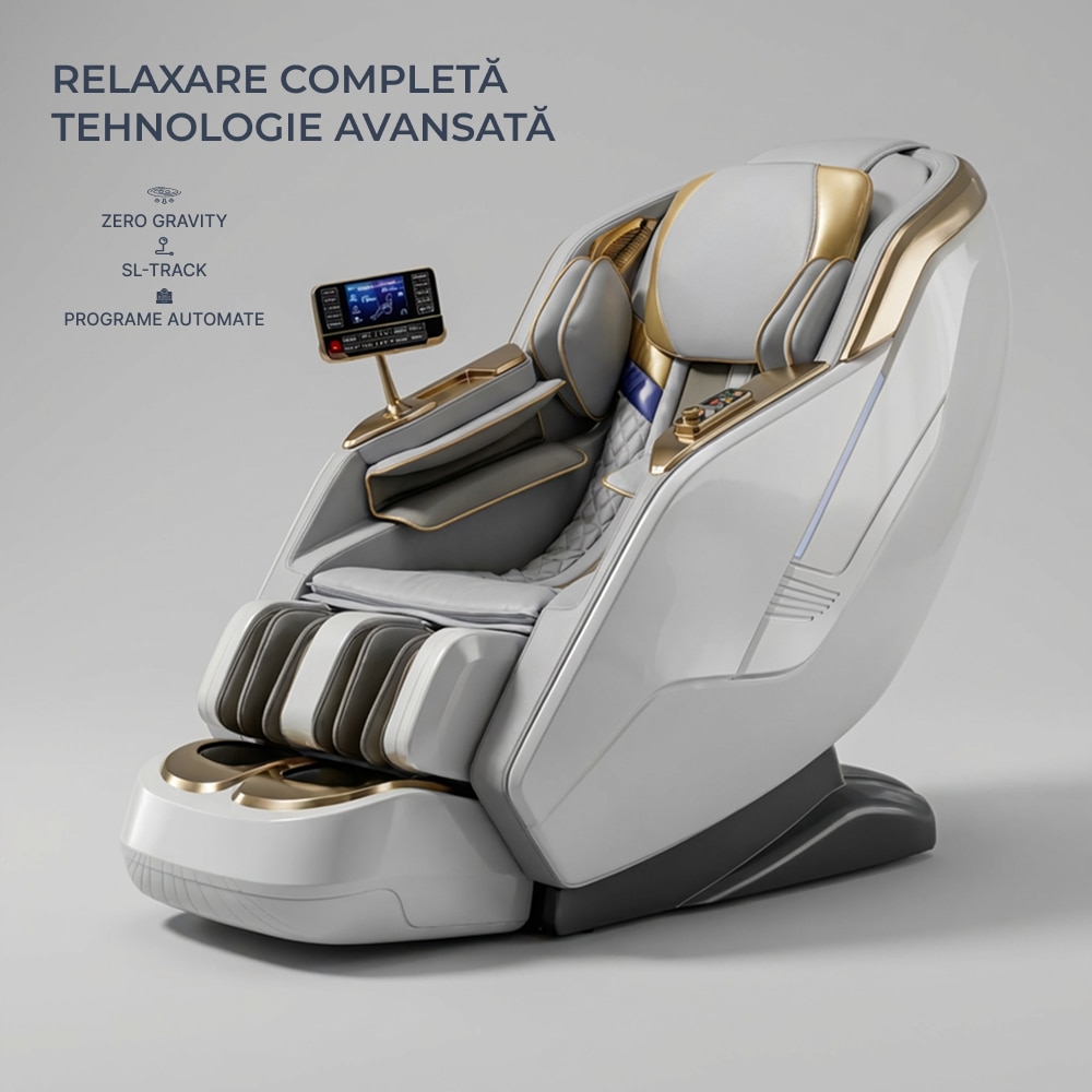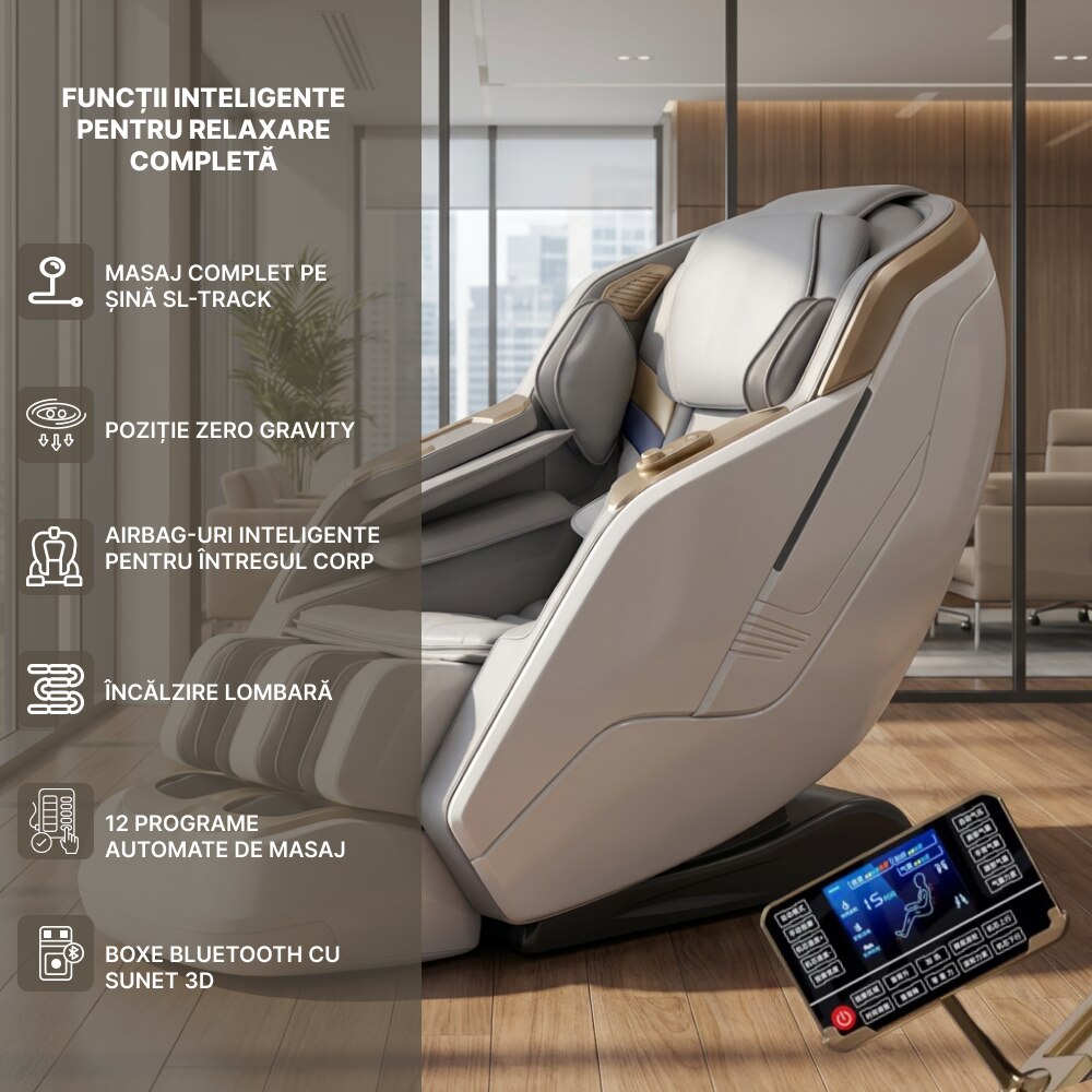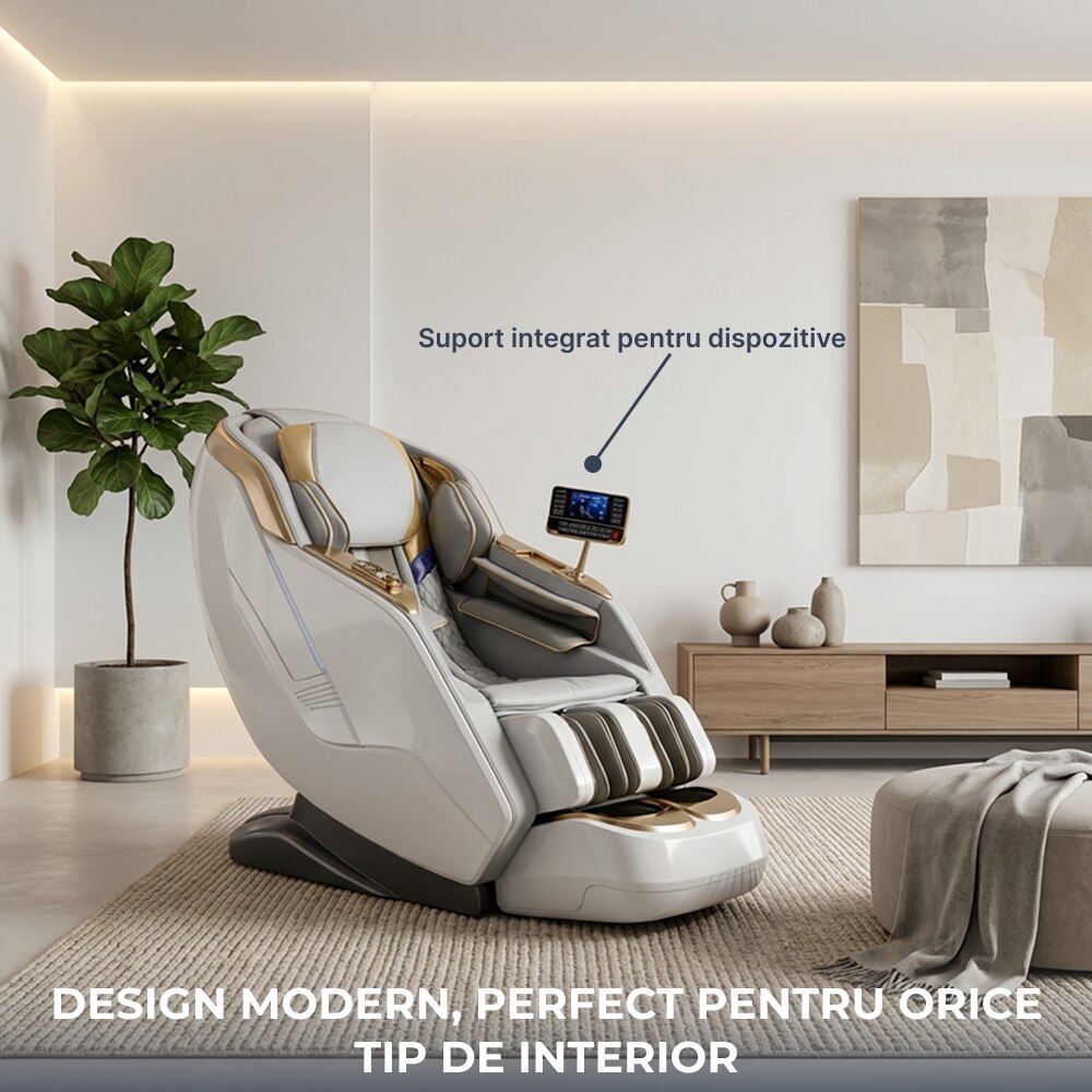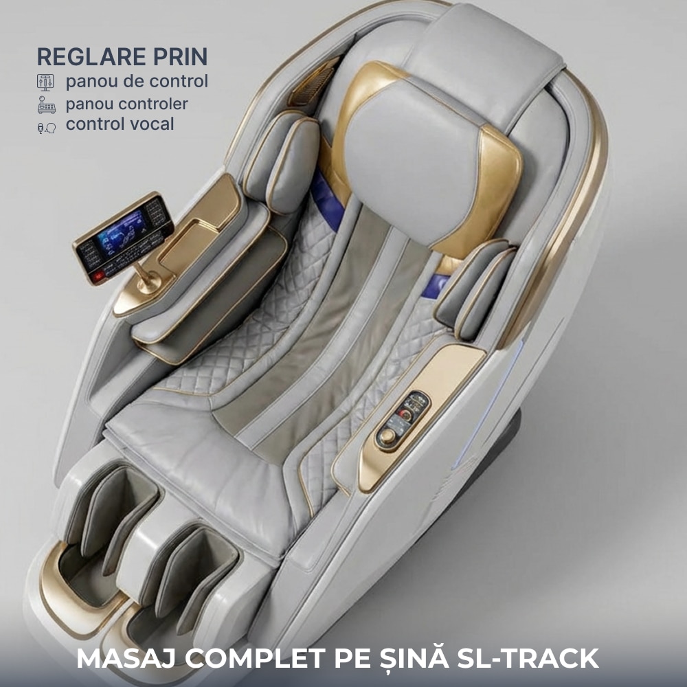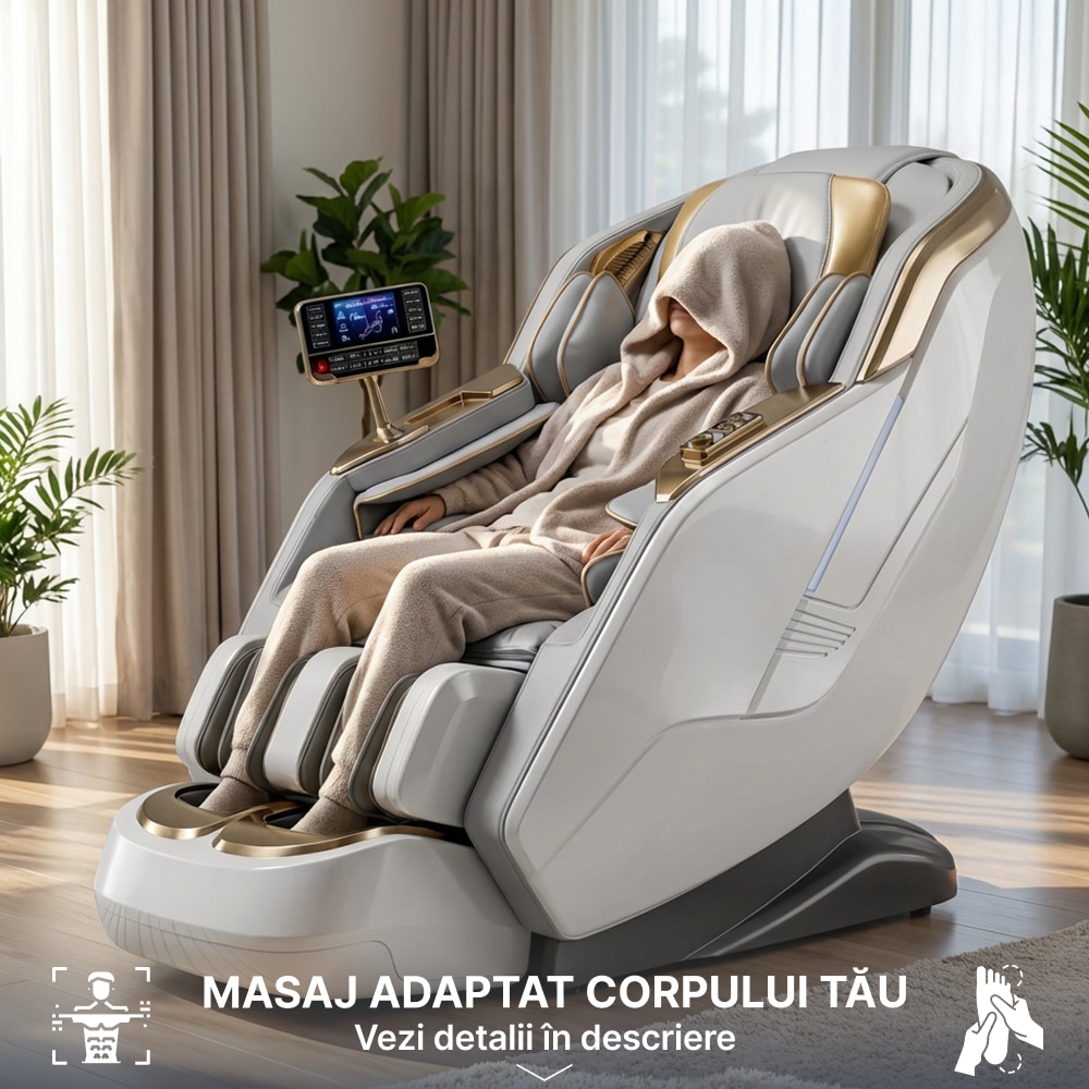 Fotoliu Masaj, TOPSCAUNE® HONORIUS, Masaj 4D cu Airbag Full Body, Zero Gravity, Incalzire Lombara Reglabila, Control Vocal AI, Ecran Tactil LCD, Bluetooth, Programe Automate, Suport Picioare Extensibil, Piele Ecologica Premium, Alb/Gri