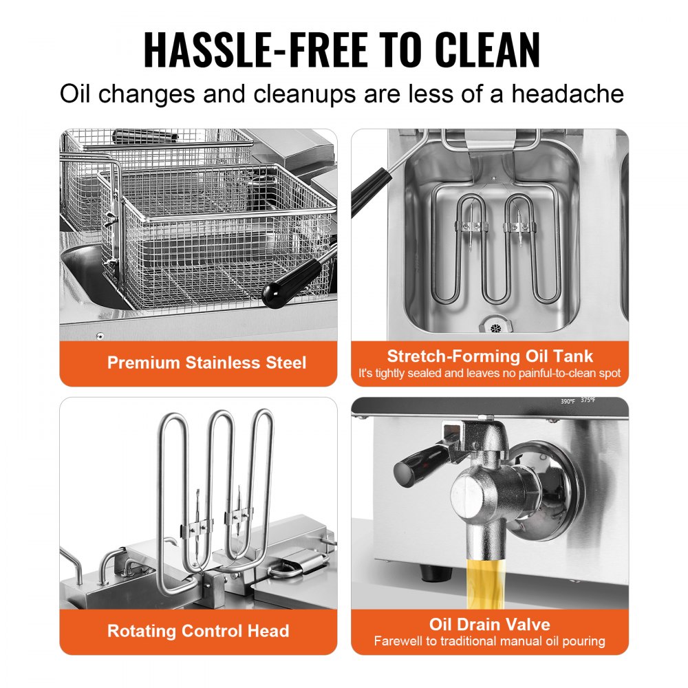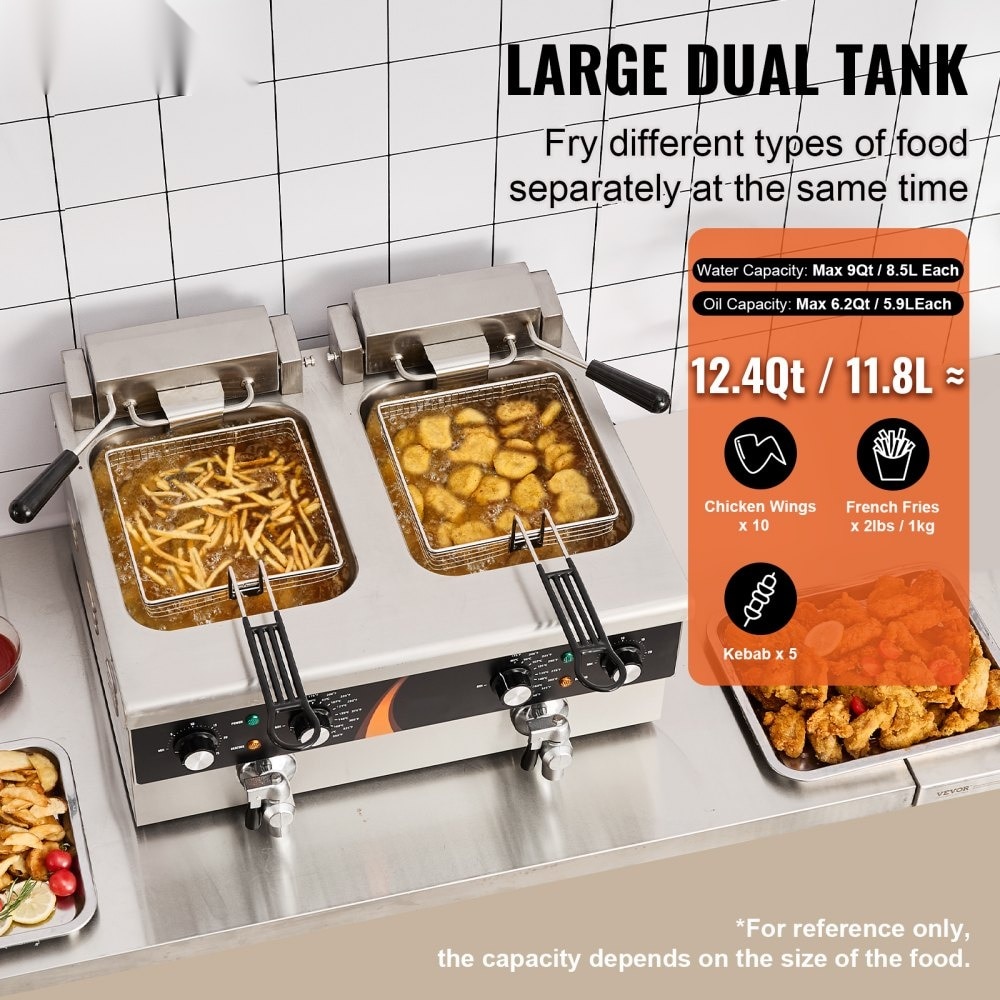 Aceasta friteuza electrica comerciala iti ofera o capacitate generoasa, fiind echipata cu doua rezervoare separate de ulei (capacitatea de apa: maxim 9 Qt / 8,5 l fiecare, capacitatea de ulei: maxim 6,2 Qt / 5,9 l fiecare). Poti folosi friteuza pentru a praji diferite tipuri de alimente separat, mentinand astfel gustul autentic al fiecaruia. Perfecta pentru delicatese, tarabe cu mancare, baruri de fast-food si evenimente speciale.
