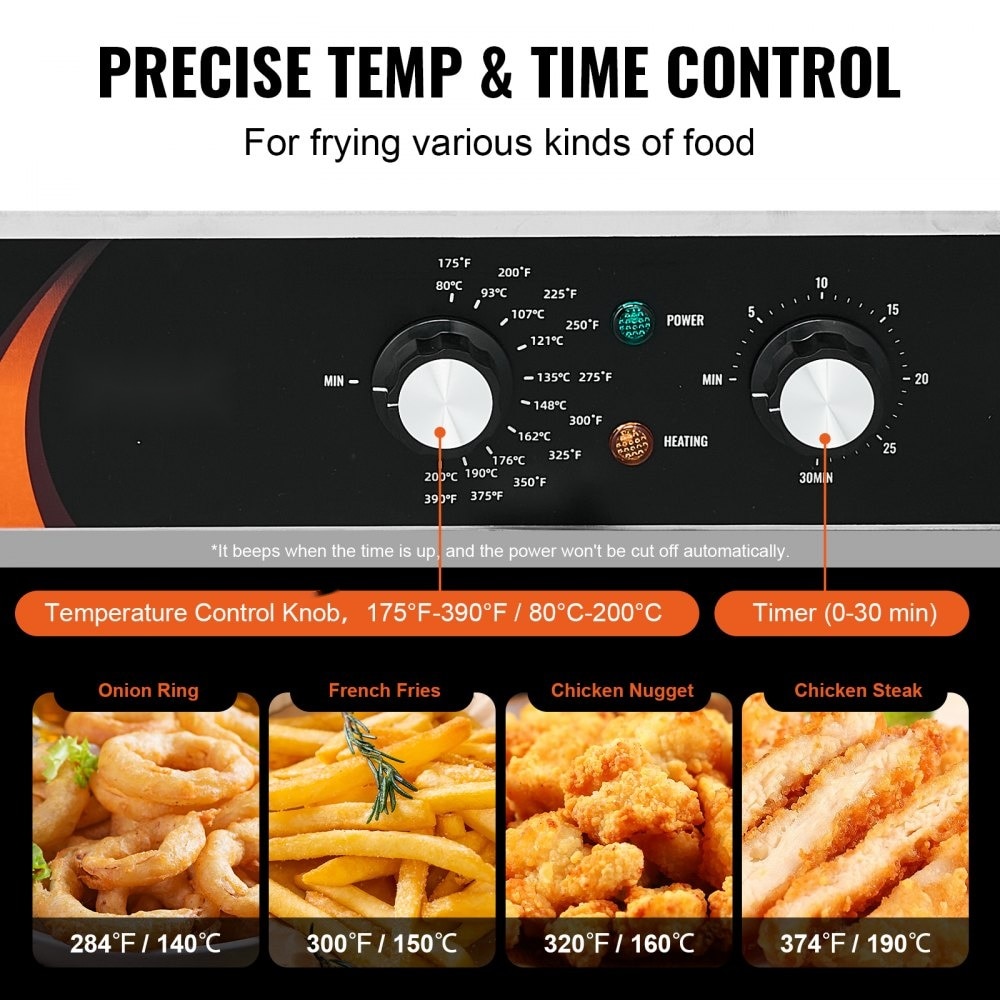 Controlul temperaturii si al timpului este usor cu aceasta friteuza electrica. Poti regla temperatura intre 80 si 200 °C (175 °F pana la 390 °F) cu usurinta. Indiferent de situatie, vei fi pregatit sa gatesti! Friteuza se opreste automat daca temperatura depaseste 230°C (446°F) sau daca regulatorul de temperatura nu functioneaza corect. De asemenea, este prevazuta cu un temporizator, astfel incat sa nu ratezi nicio etapa a gatitului.