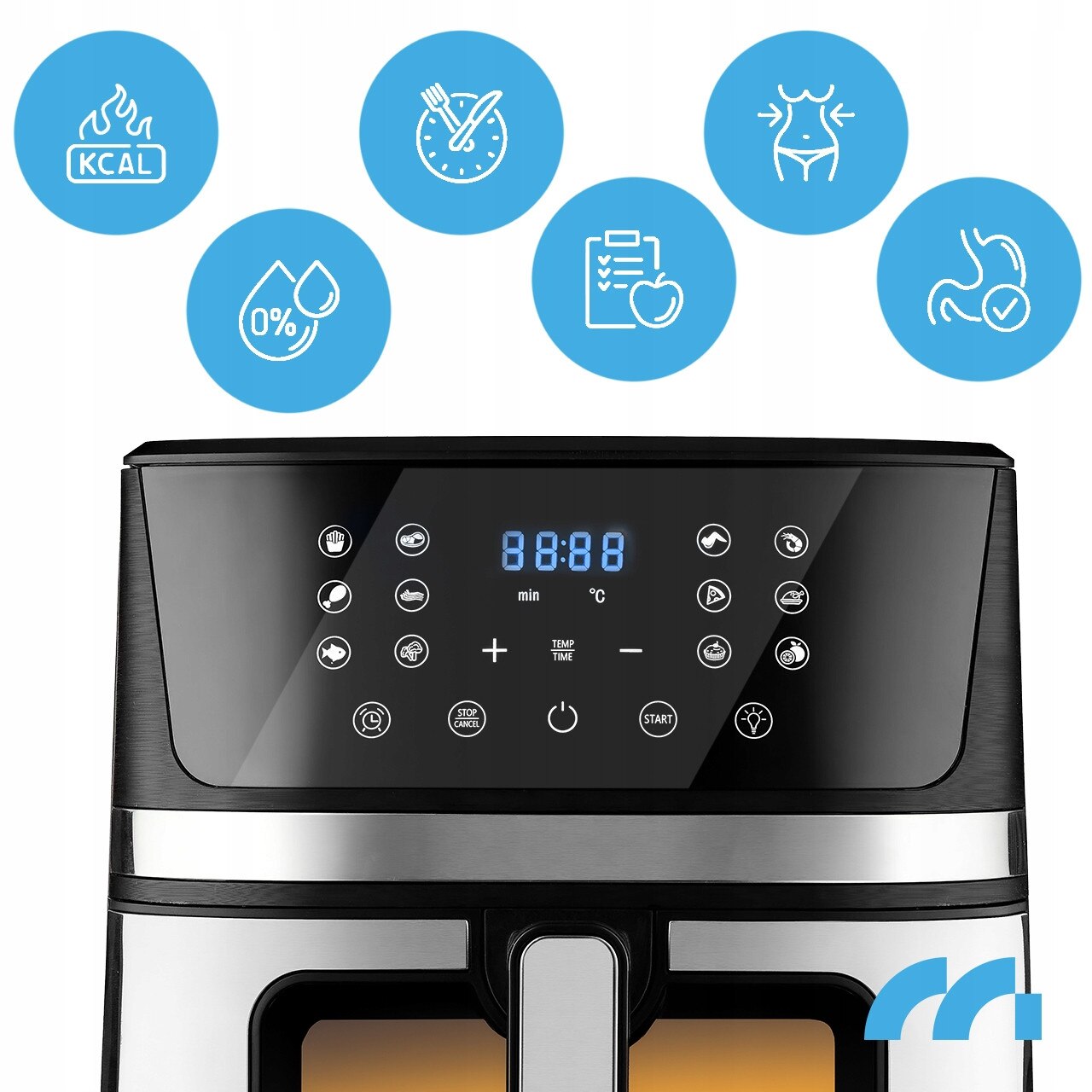 Permite monitorizarea comodă a procesului de gătire fără a fi necesară deschiderea aparatului. Datorită iluminării încorporate, puteți controla în permanență gradul de rumenire a mâncării, ceea ce asigură rezultate perfecte și minimizează pierderile de căldură.