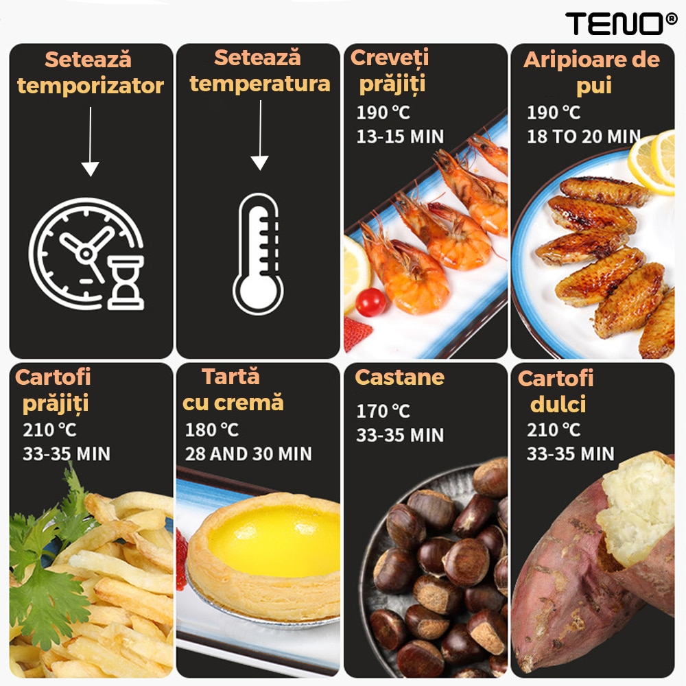 Friteuza Fara Ulei Air Fryer Teno®, 100 hartii de copt cadou, tehnologie smart sensing, programe smart chef automate, afisaj digital, capacitate 6 L, tehnologie de eliminare a grasimii, functie de pastrare la cald, tensiune alimentare 220 V, culoare negru