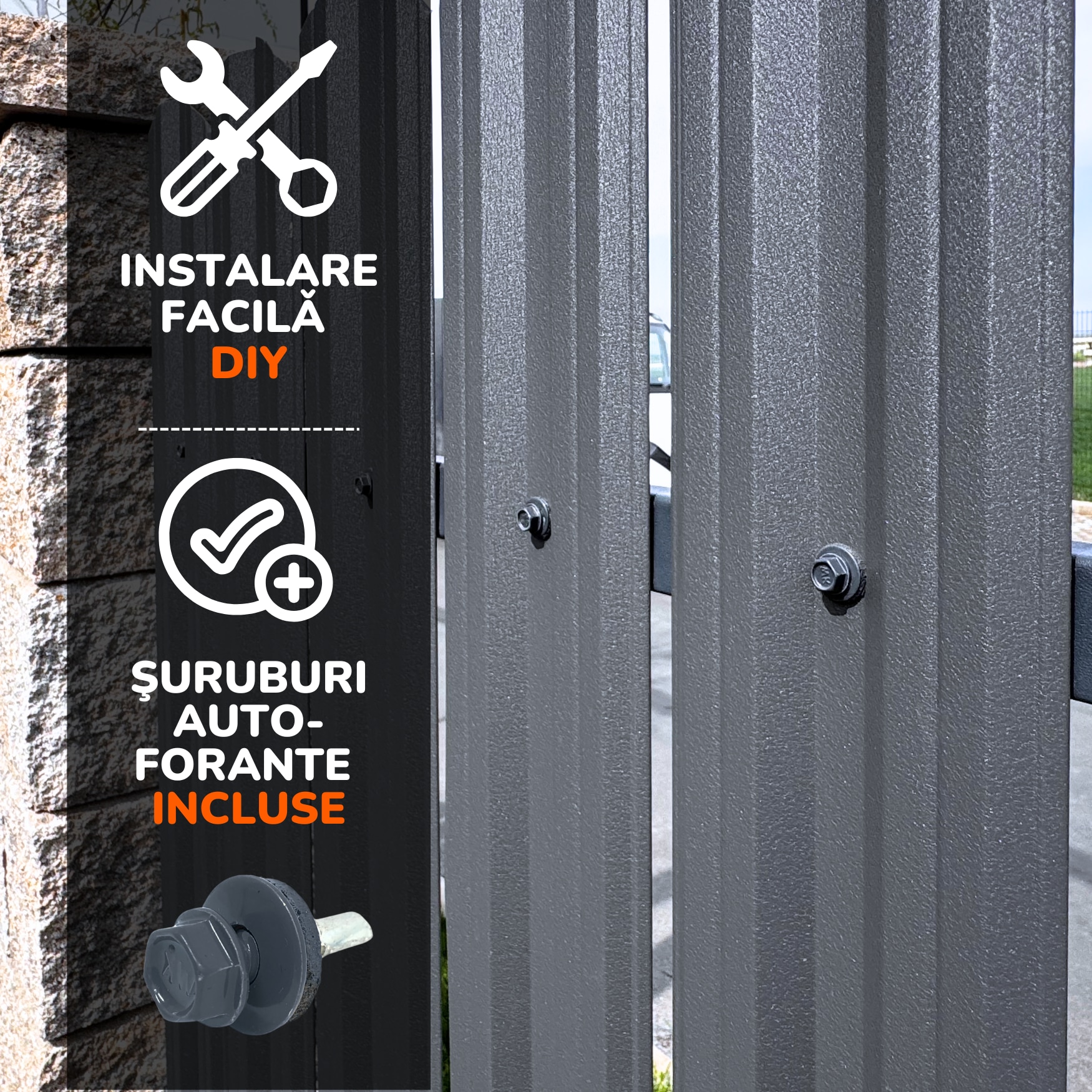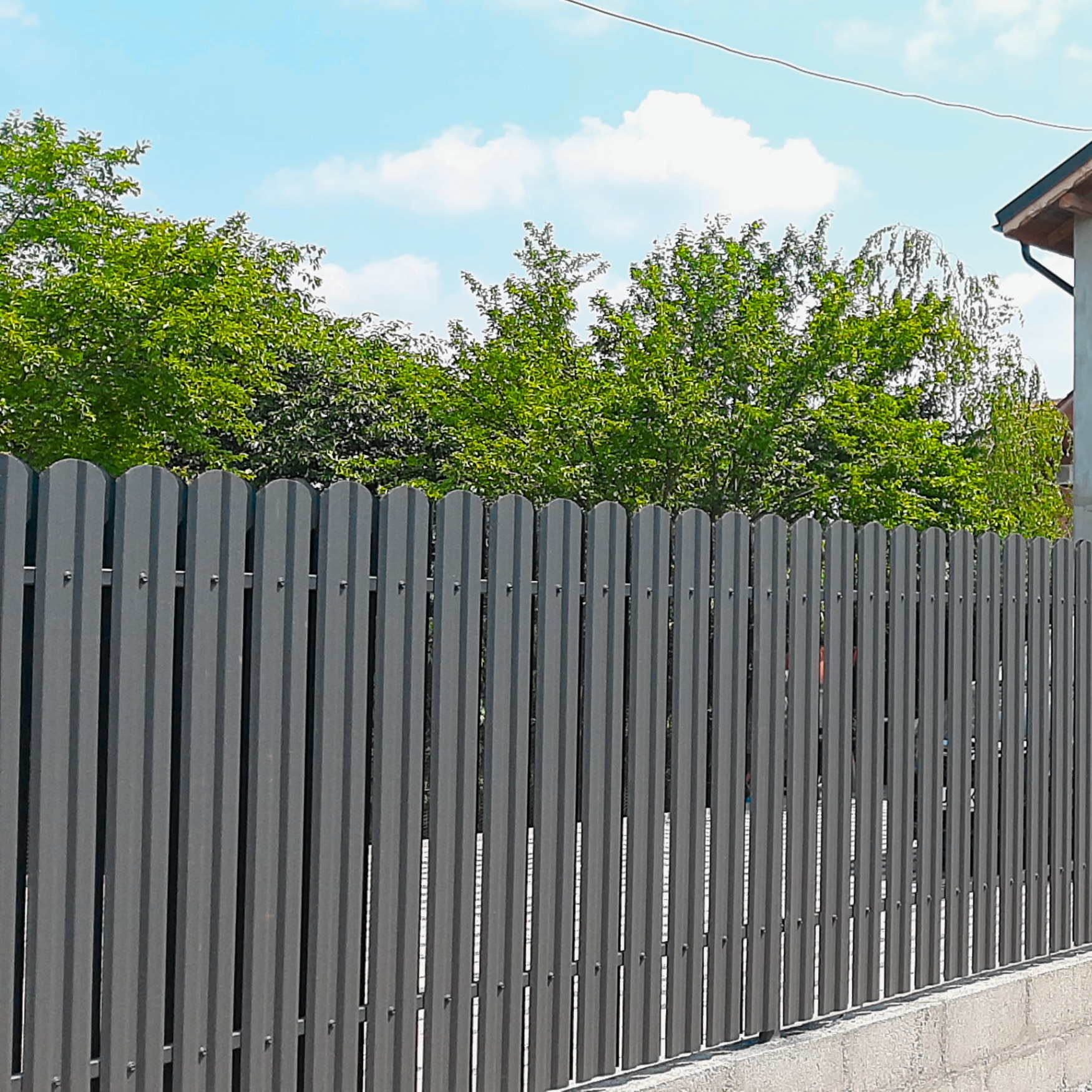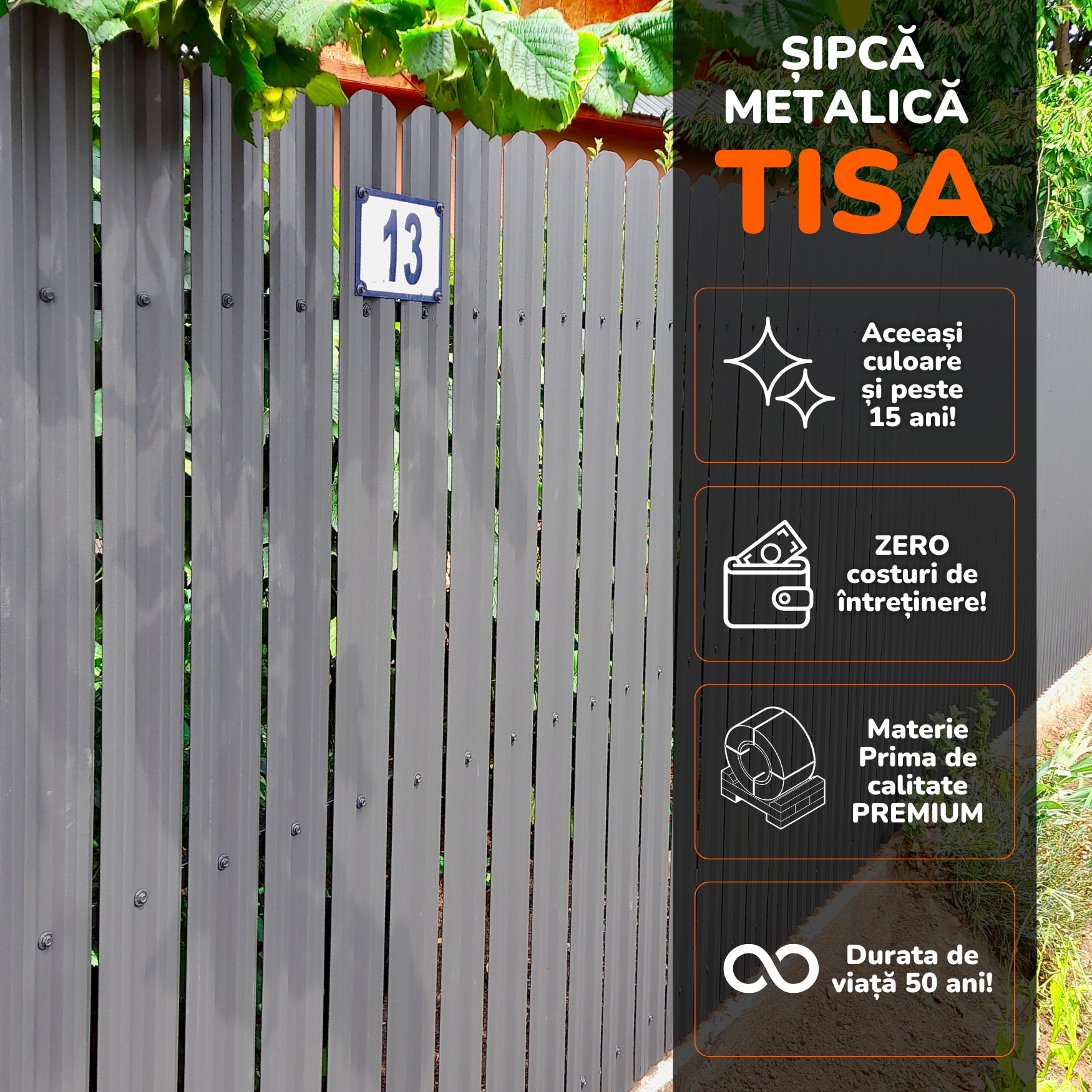 • 25 de sipci metalice TISA – suficiente pentru aprox. 3 metri de gard, daca se respecta o distanta recomandata de 1 cm intre sipci. • 50 de suruburi autoforante – pentru 2 prinderi pe fiecare sipca.