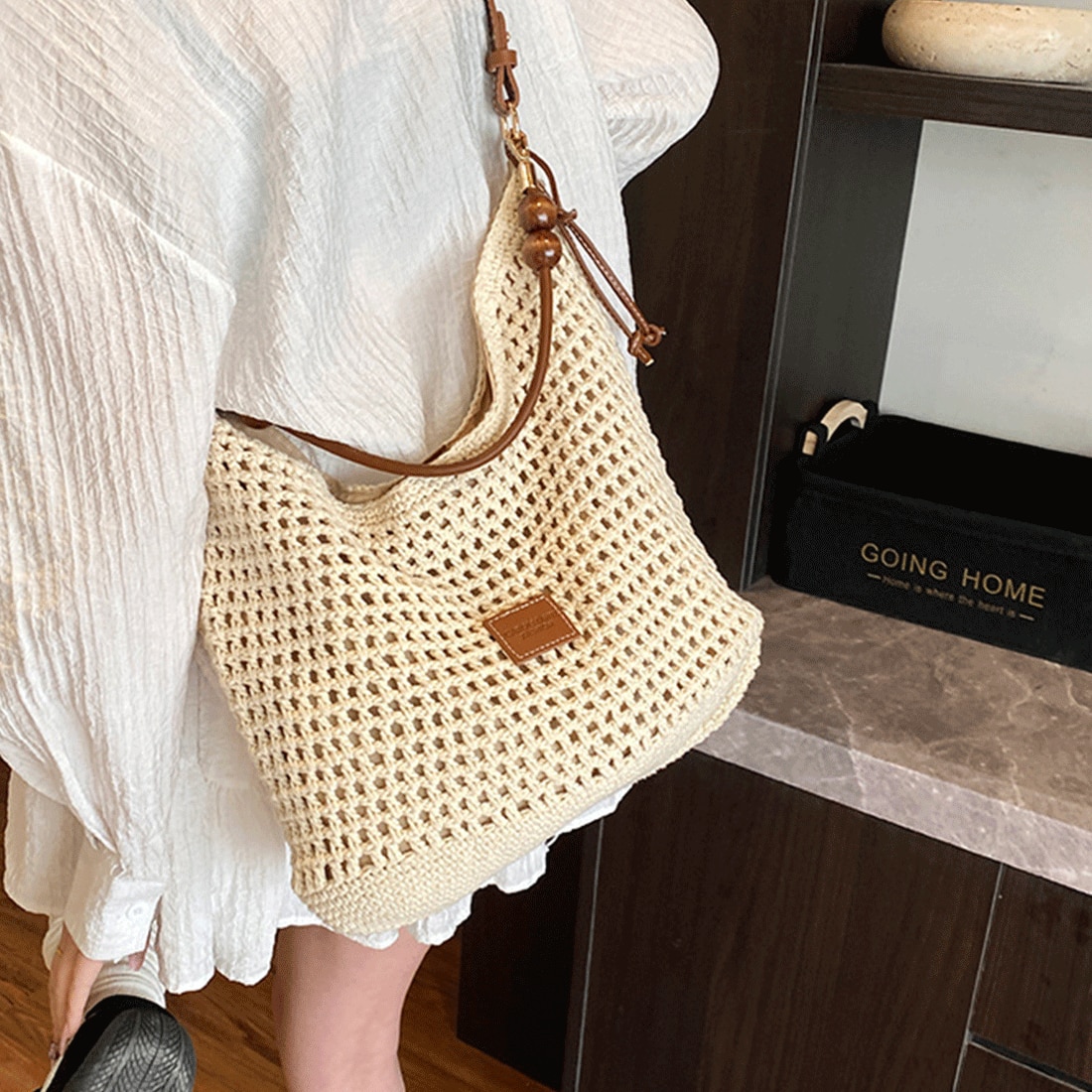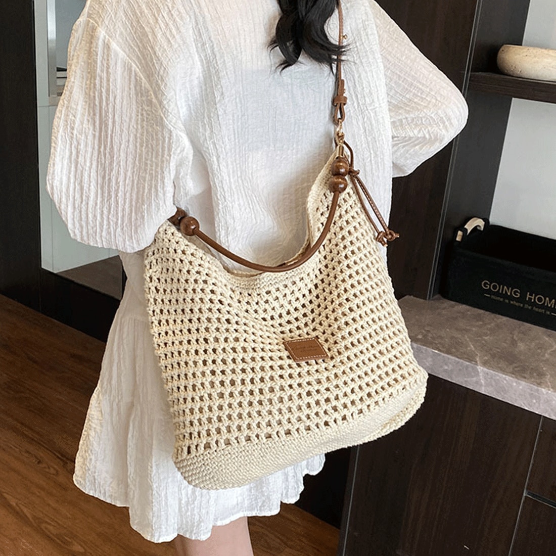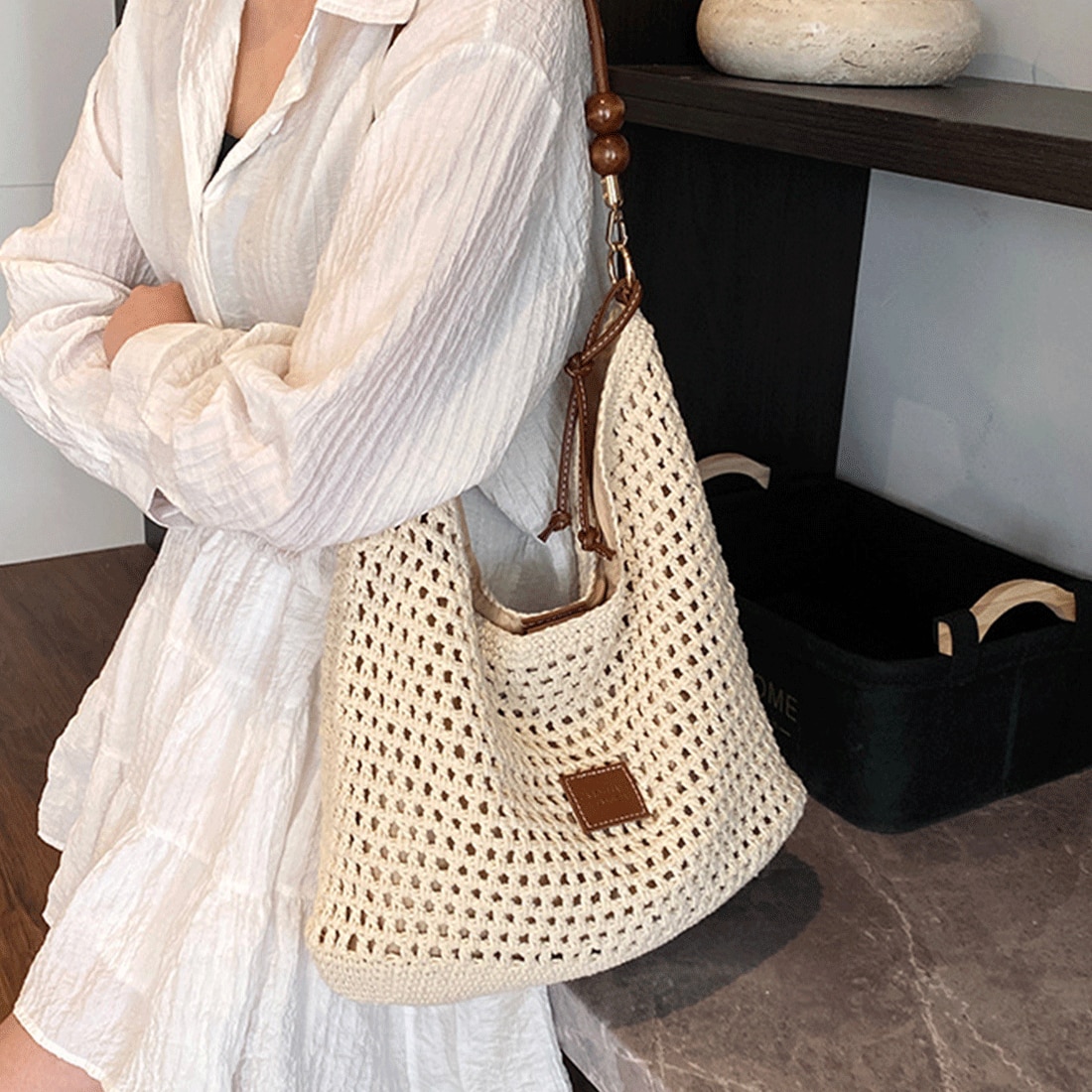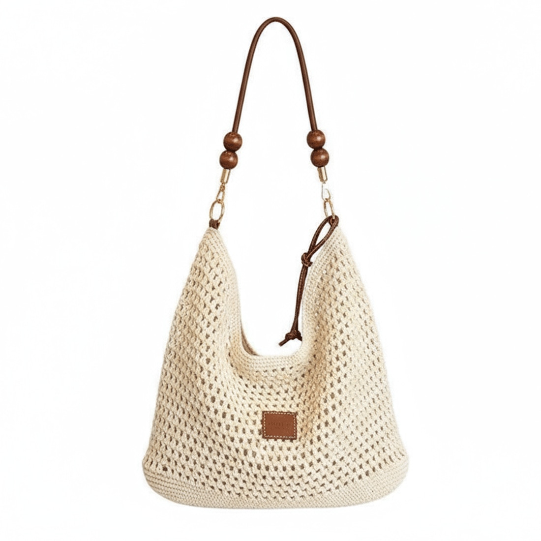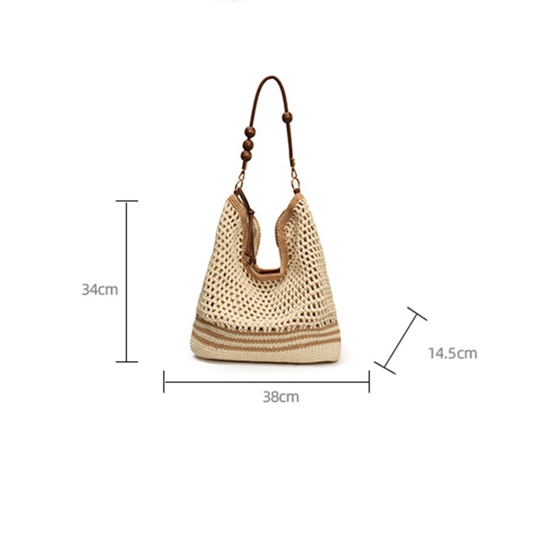 PriStyle - Geanta Dama de Umar, din Material Textil Crosetat, Model Casual Boho Chic, Ideala pentru Vara, Plaja sau Oras, cu Detalii din Lemn, Crem Deschis