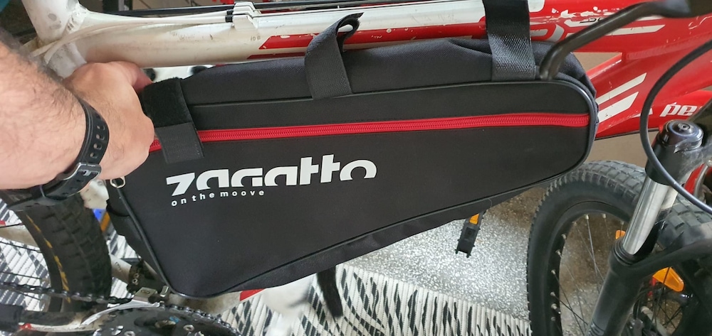 Geanta de bicicleta triunghiulara mare, Zagatto®, Negru/Rosu, Universala, Unisex, Multifunctionala, 3 elemente de fixare, Fermoar reflextorizant, Impermeabila, Usoara, Spatioasa, Nylon/Poliester, 40x23x7 cm, 4.5L, ZG792