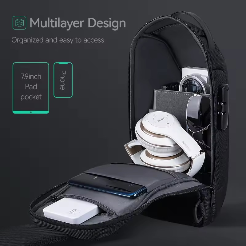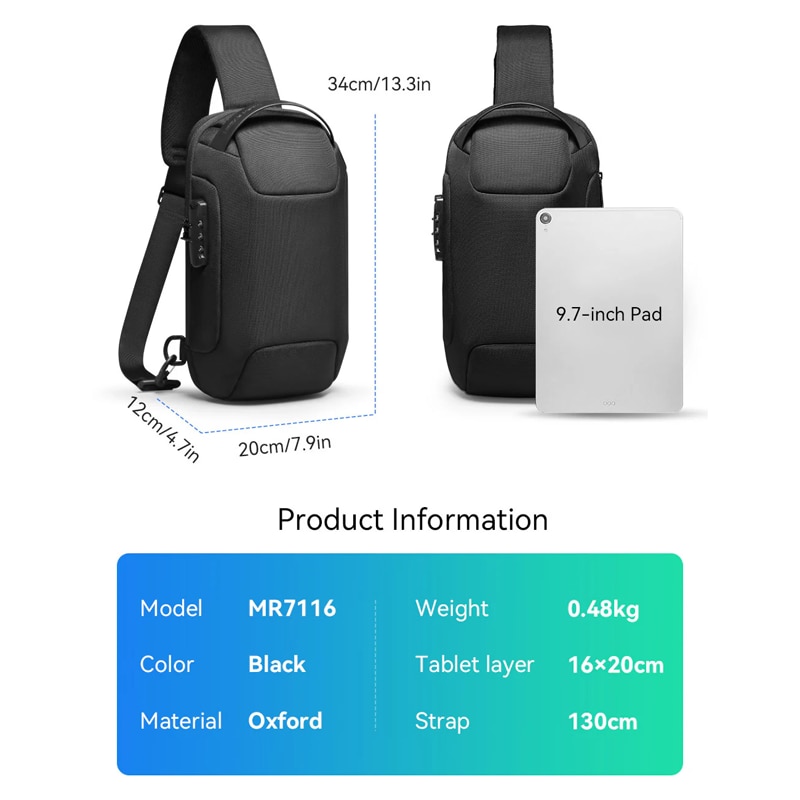 Geanta pentru piept/umar, Mark Ryden, sistem antifurt, material oxford impermeabil, port USB, structura multi divizata, compatibila cu tableta 9.7 inch, o singura curea, unisex, culoare negru