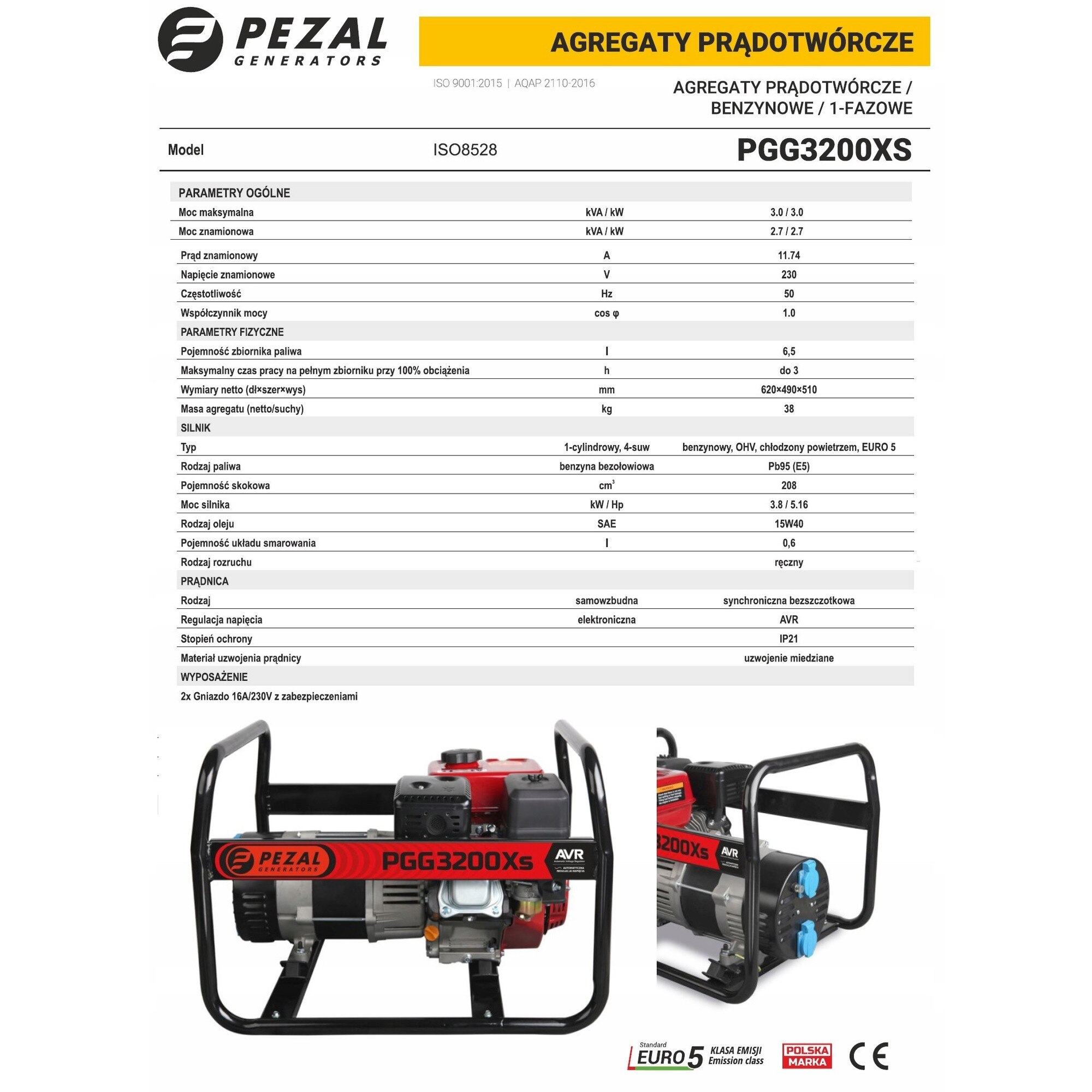 Generator electric PGG3200XS, 3.0 kVA, motor pe benzina, sistem stabilizare tensiune AVR, dimensiuni compacte