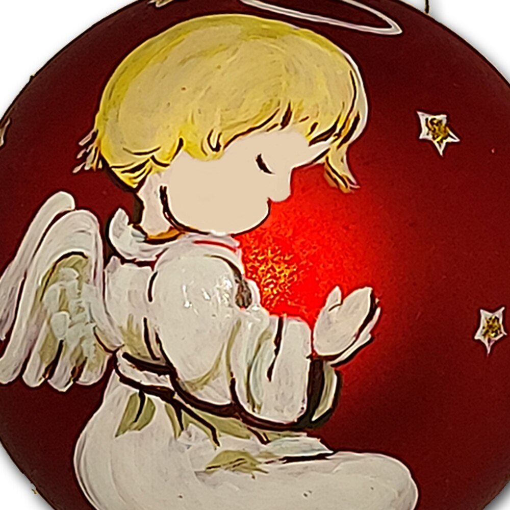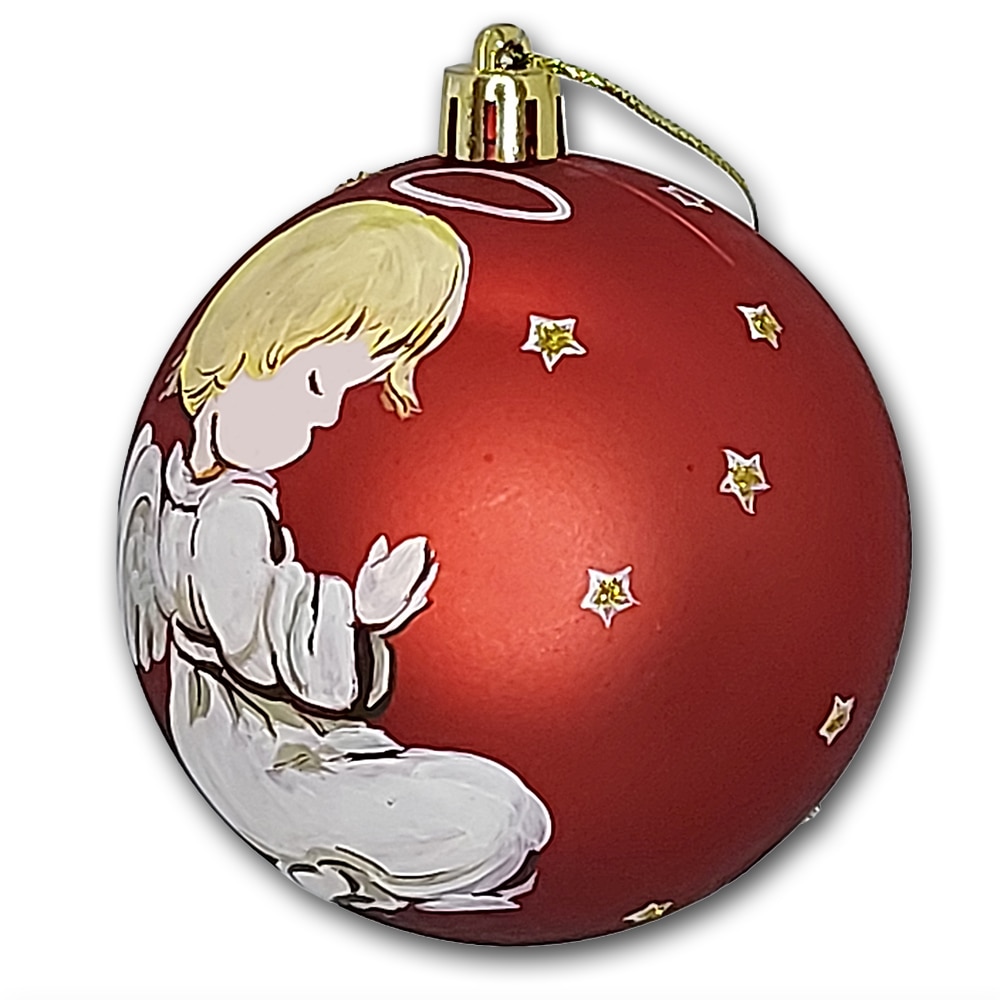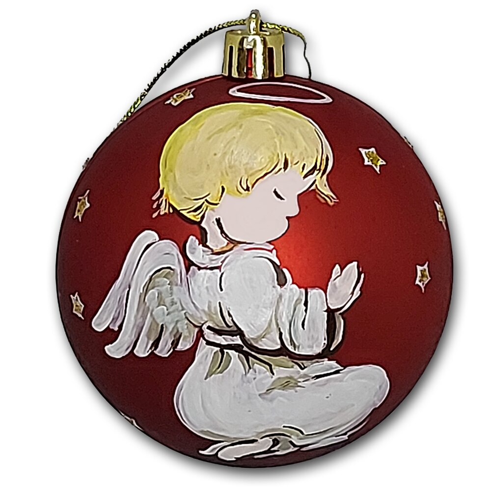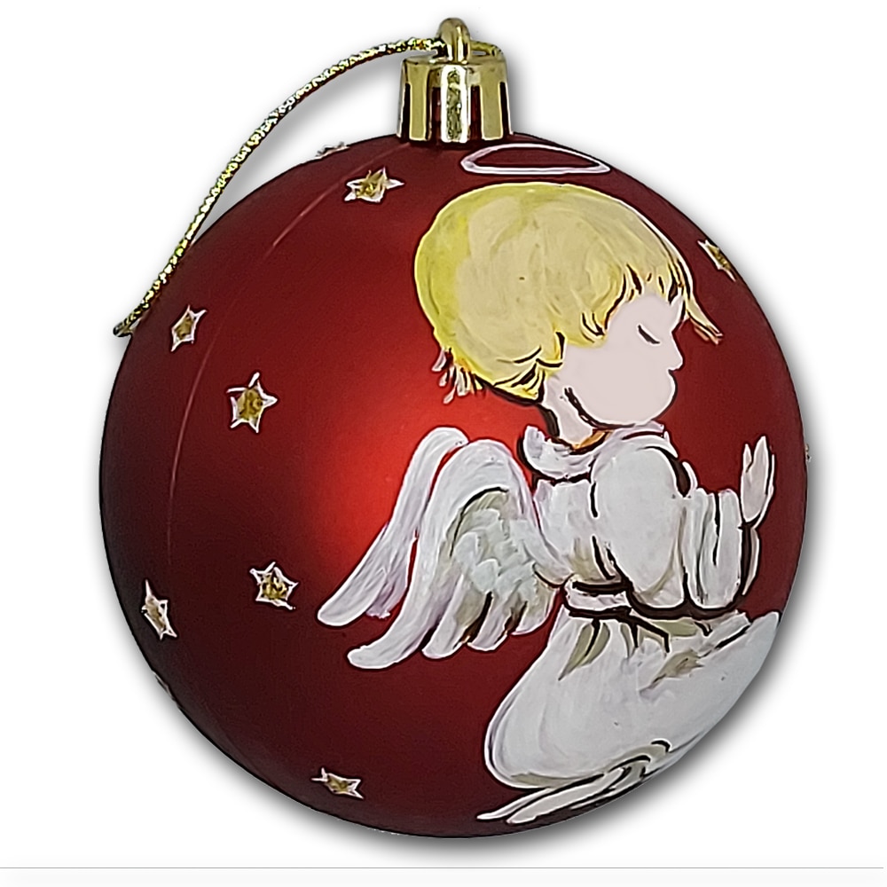 Globulet ArtDeco pentru bradul de Craciun, din plastic rosu cu Ingeras in rugaciune, pictat manual in culori acrilice, diametrul de 8cm