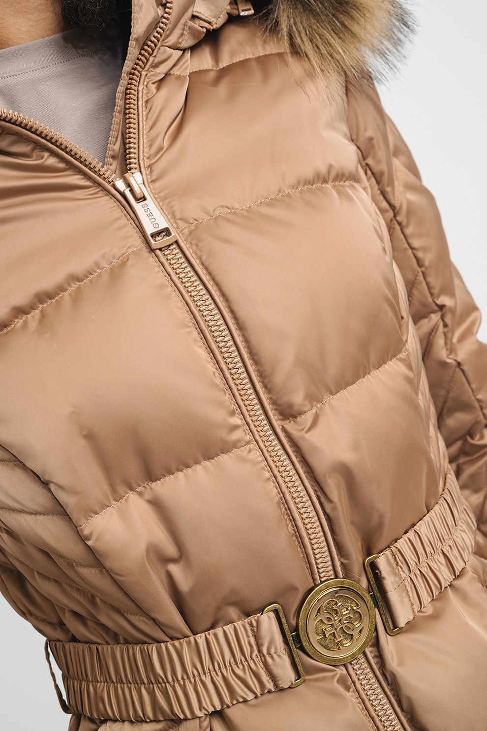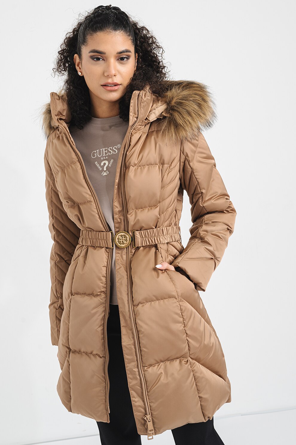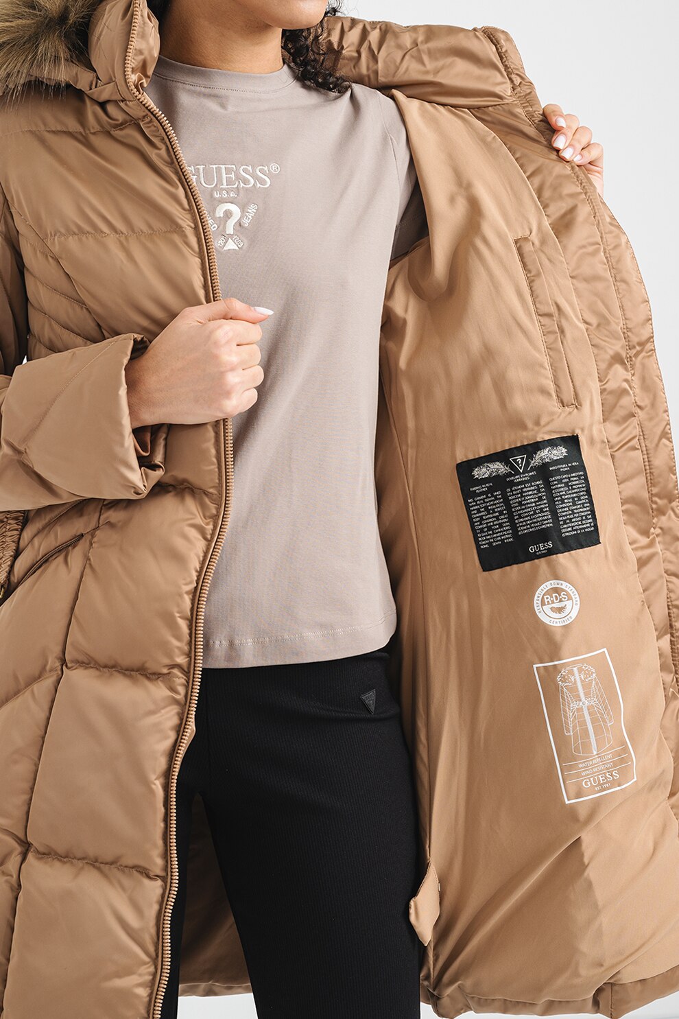 GUESS - Geaca cu umplutura cu puf, gluga si aspect matlasat, Bej