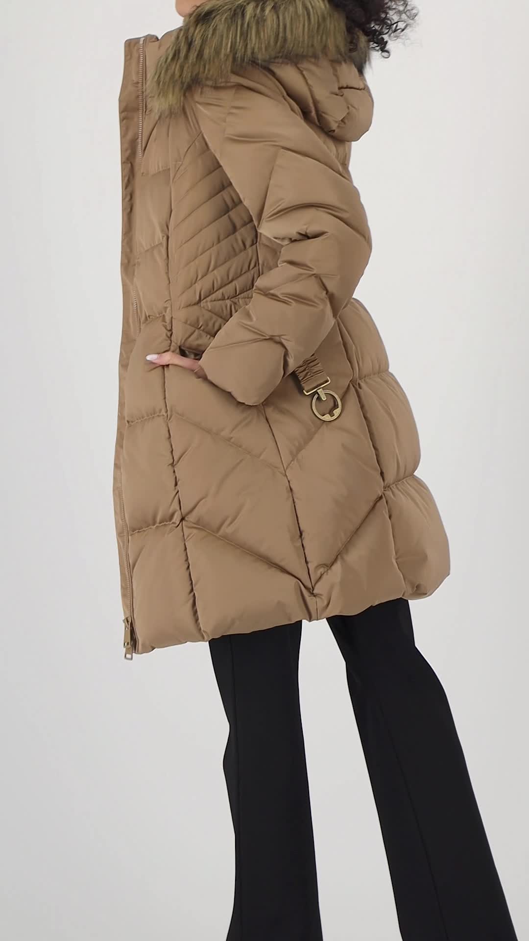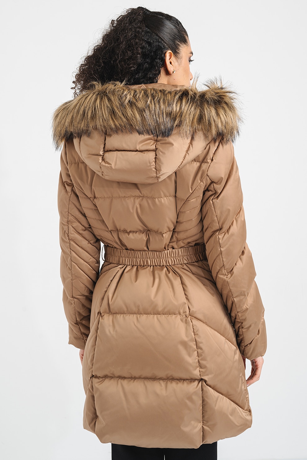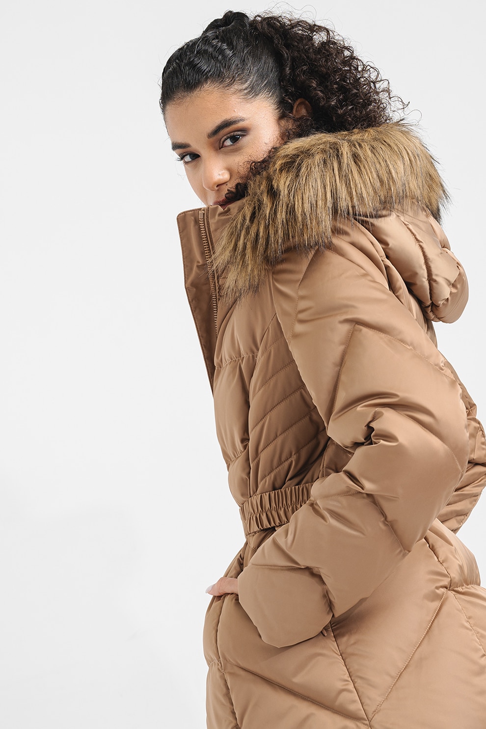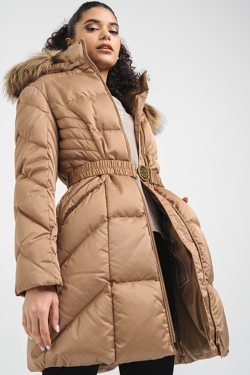 GUESS - Geaca cu umplutura cu puf, gluga si aspect matlasat, Bej