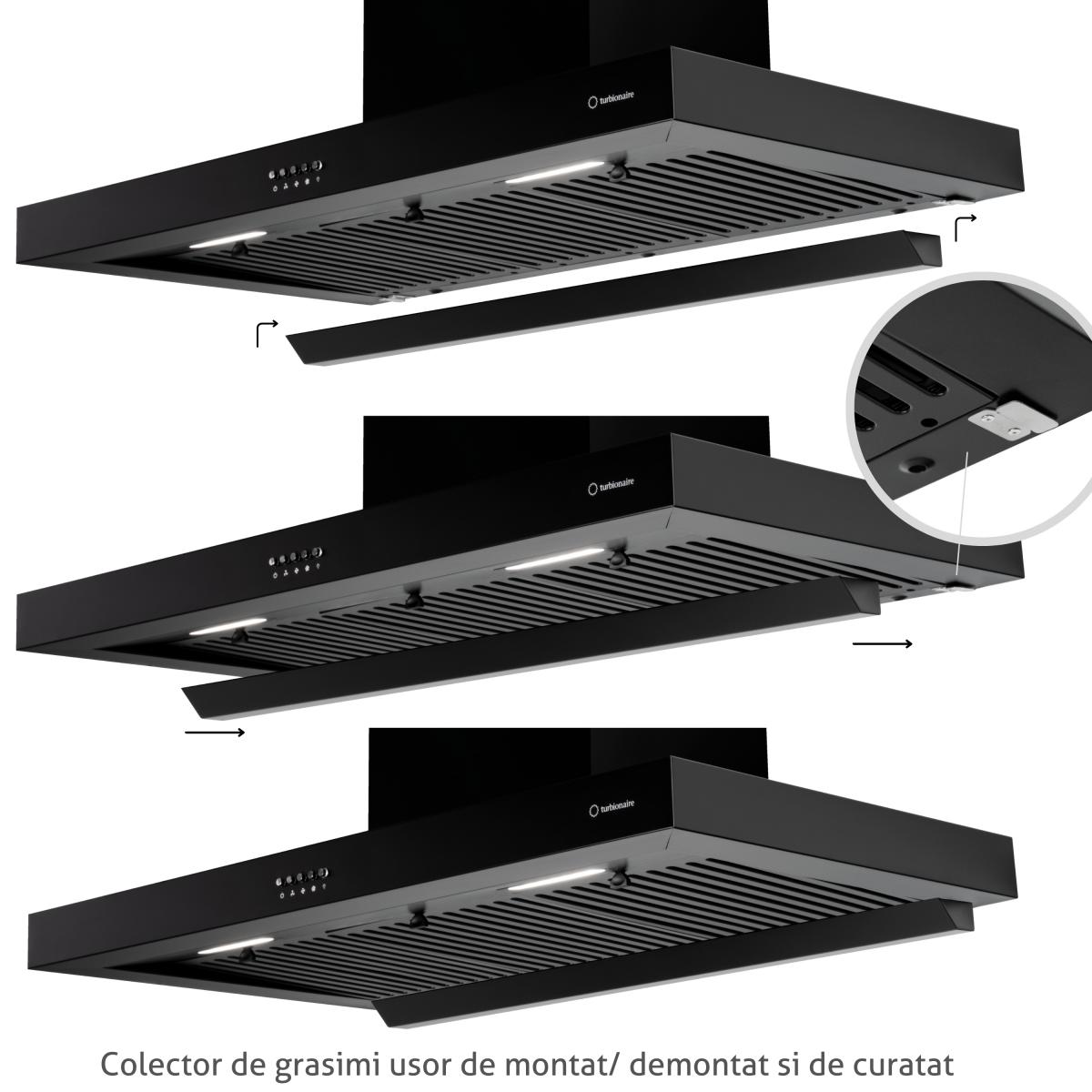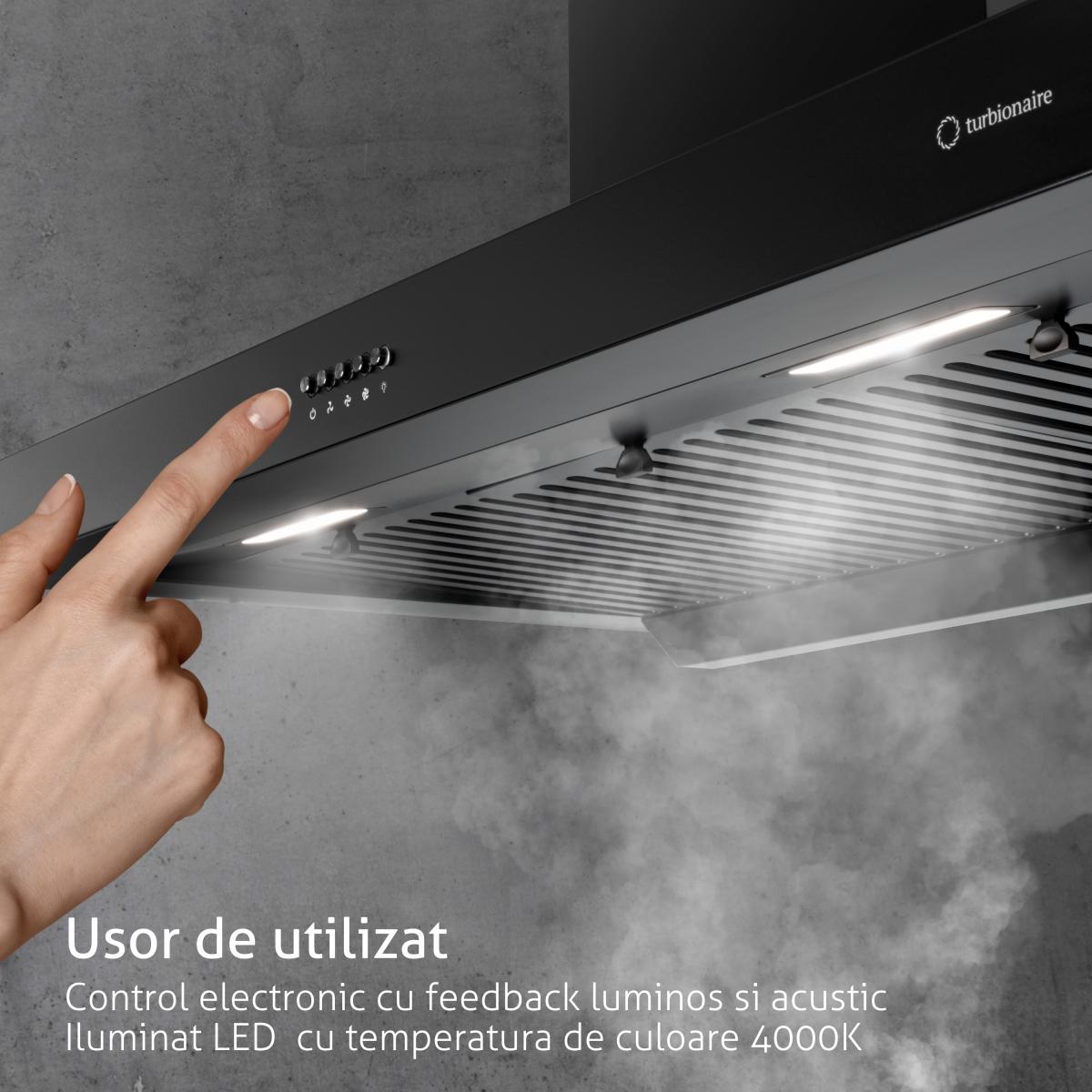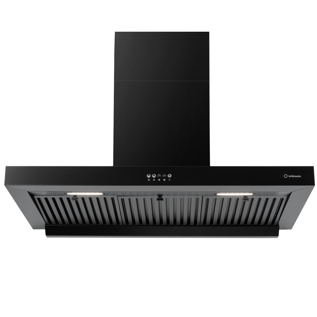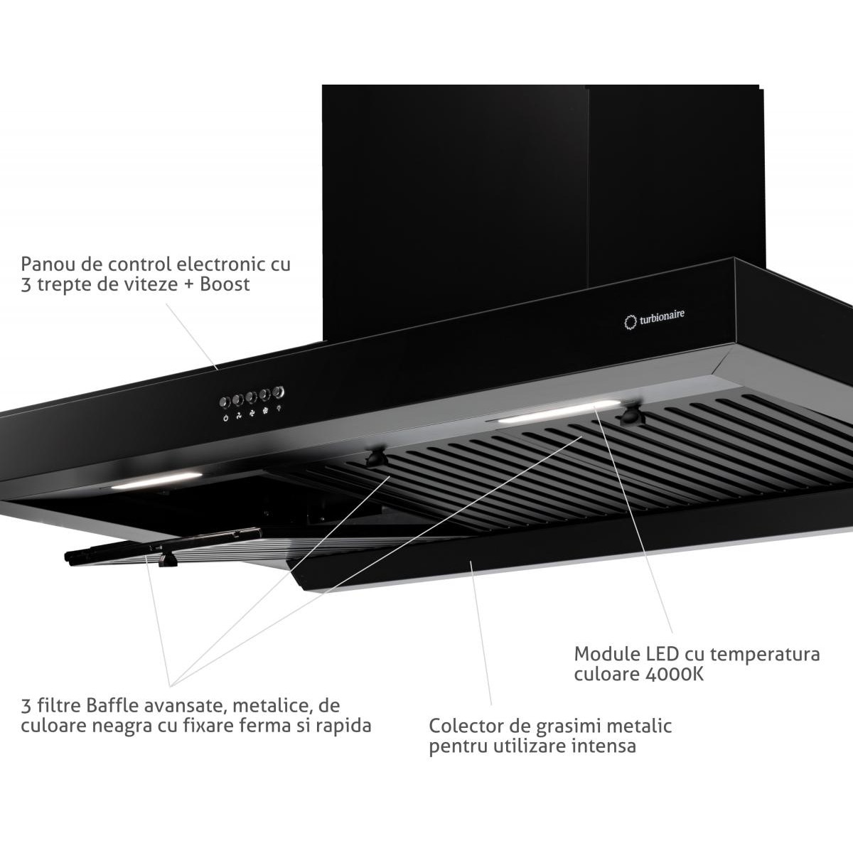 Hota de perete Turbionaire Chef 90 Wall Pro Black, Motor brushless 800 mc/h, Clasa A++, Colector de grasimi, Filtre Baffle Avansate, Control electronic, Iluminare LED 4000K, 3 viteze + Boost, Negru