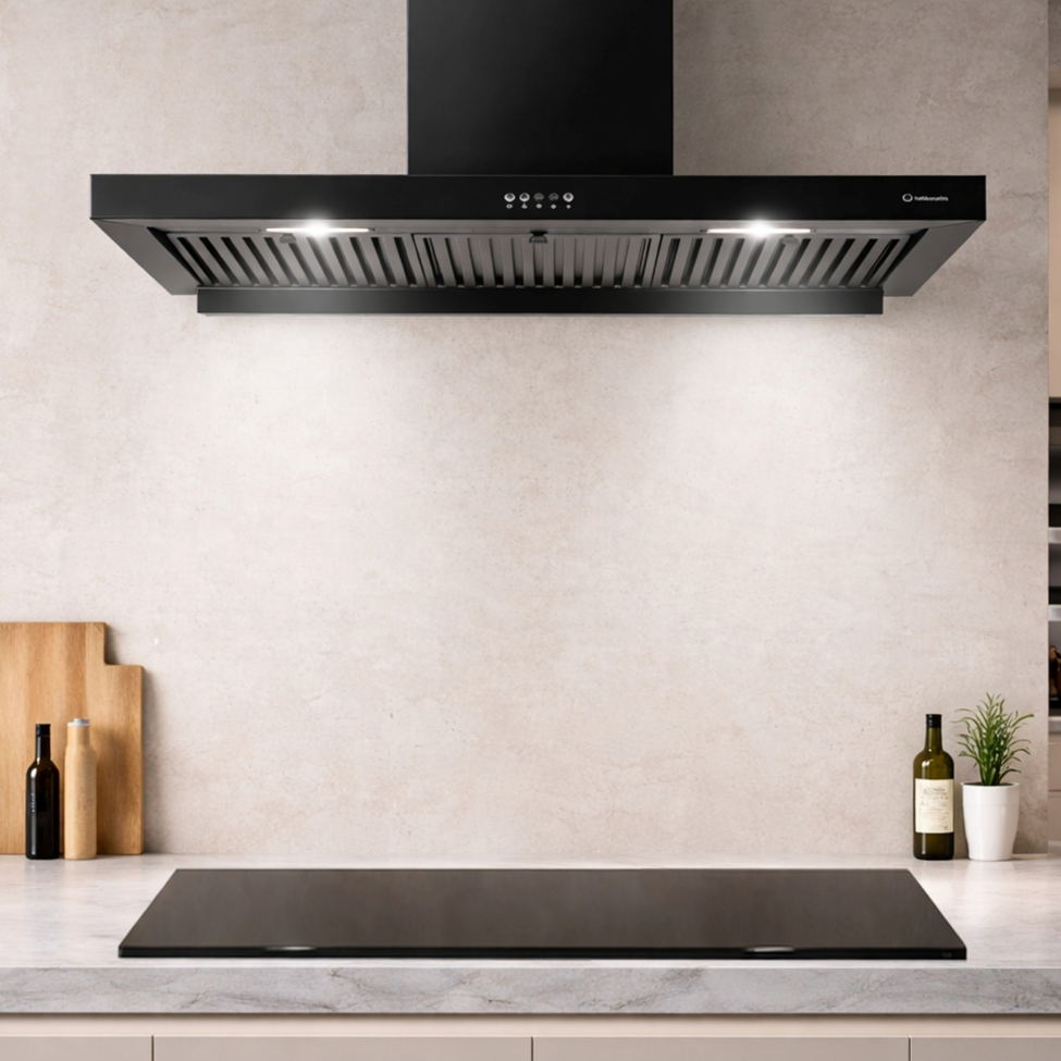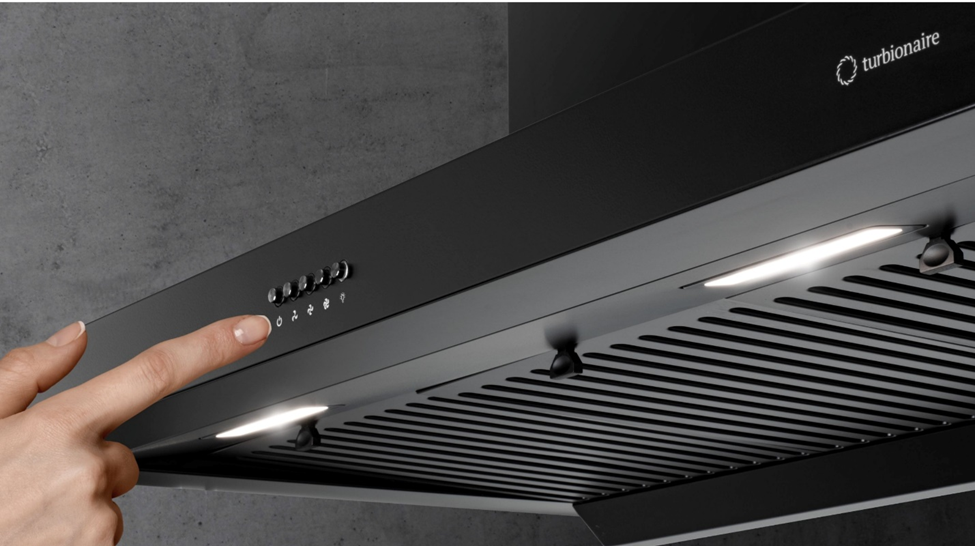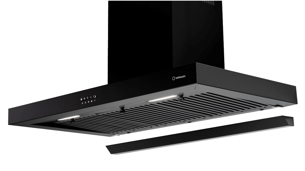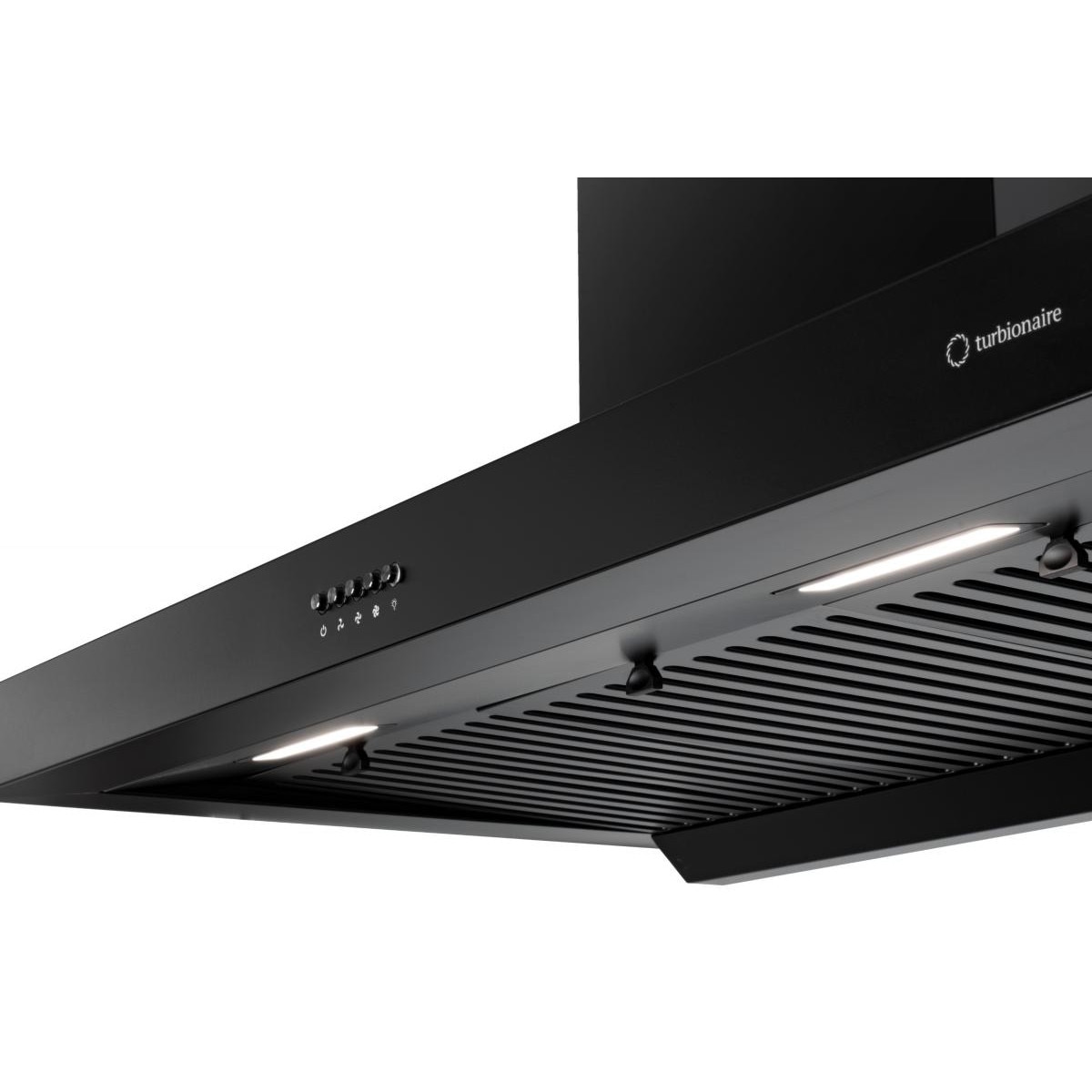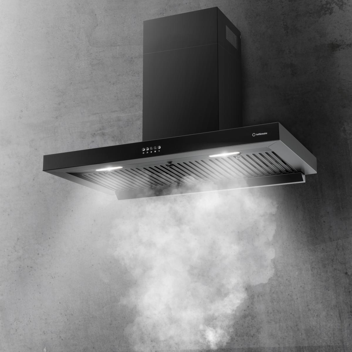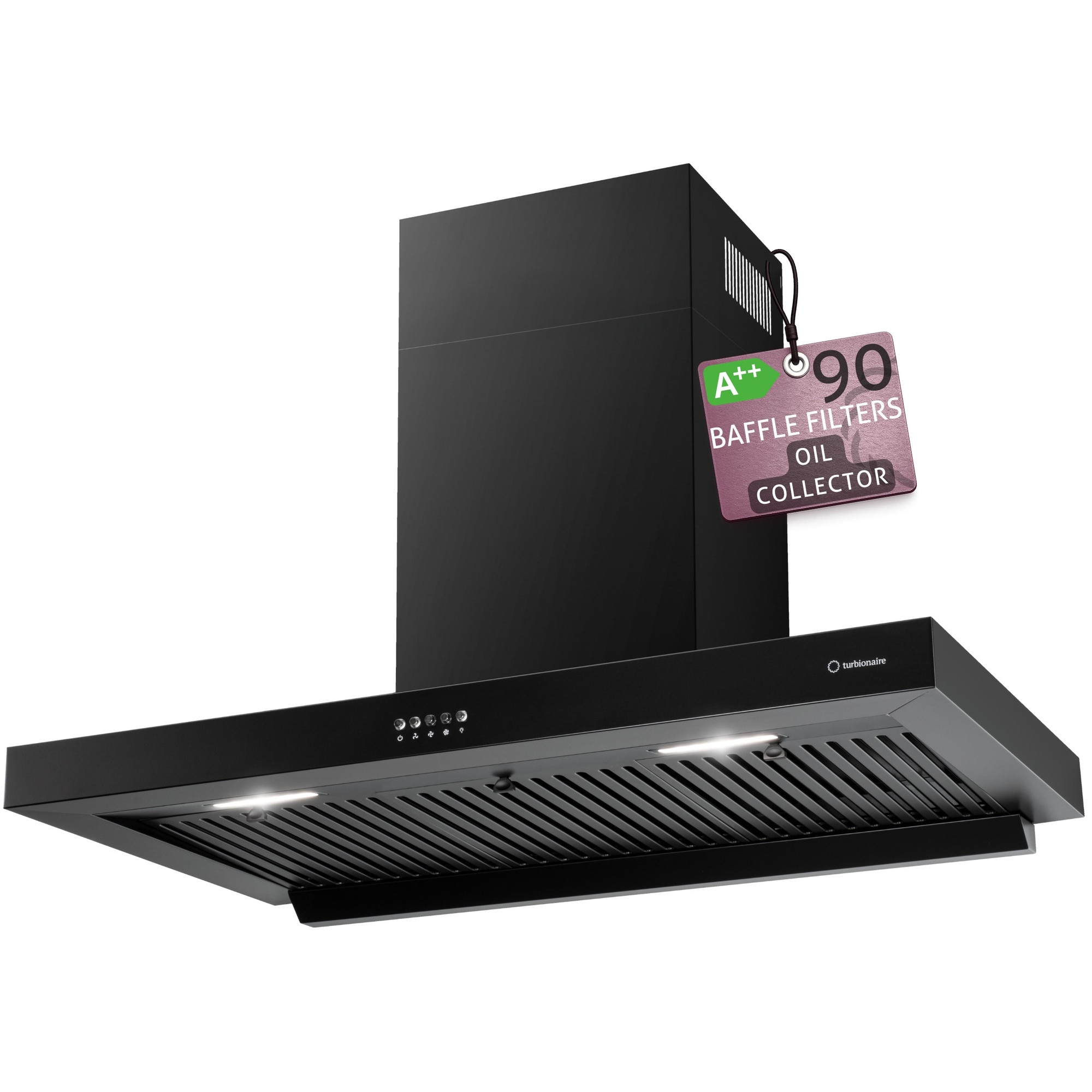 Hota de perete Turbionaire Chef 90 Wall Pro Black, Motor brushless 800 mc/h, Clasa A++, Colector de grasimi, Filtre Baffle Avansate, Control electronic, Iluminare LED 4000K, 3 viteze + Boost, Negru