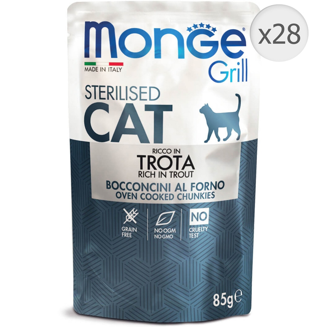 Hrana umeda pentru pisici, Monge Grill, Sterilised,Super-Premium, Pastrav, 28 x 85g