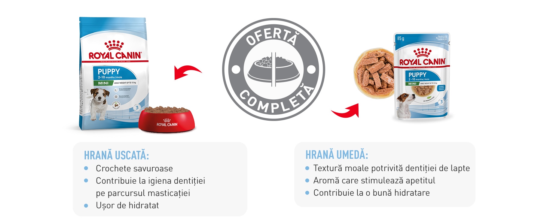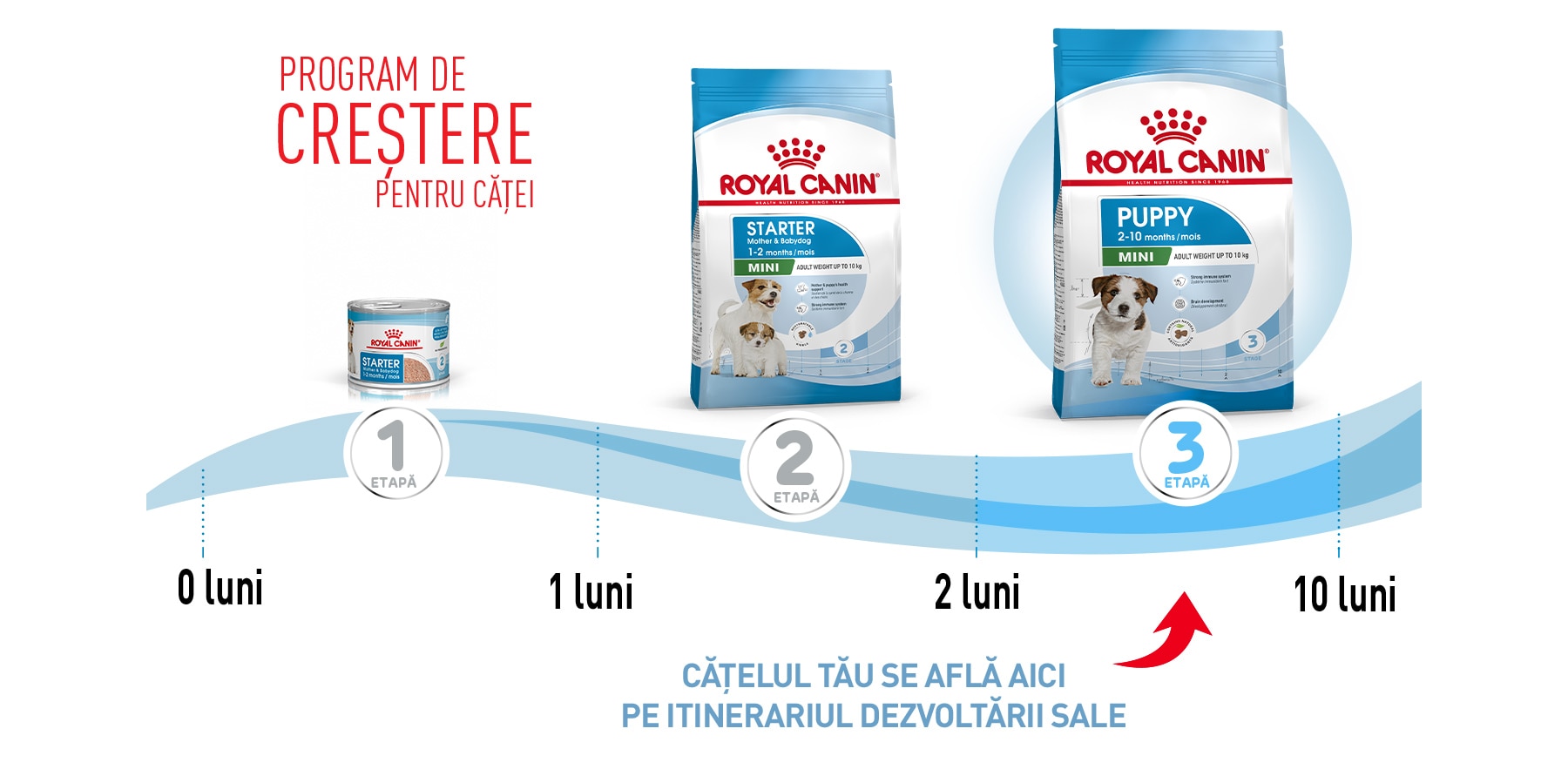 Pe perioada intarcarii si pana la varsta de 2 luni se recomanda hranirea cu Royal Canin, Mini, Starter Mother & Babydog. Intre 2 si 10 luni se poate folosi Mini Puppy.