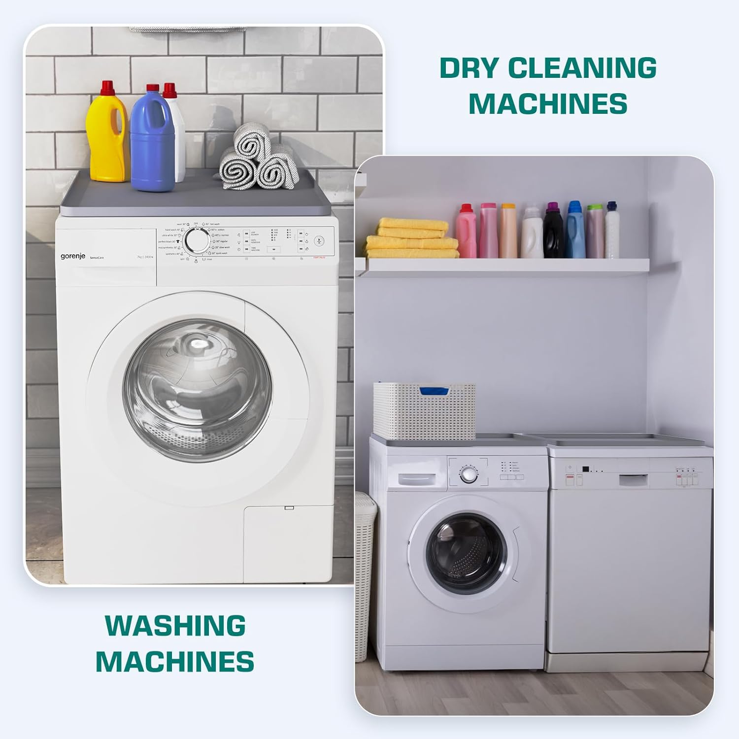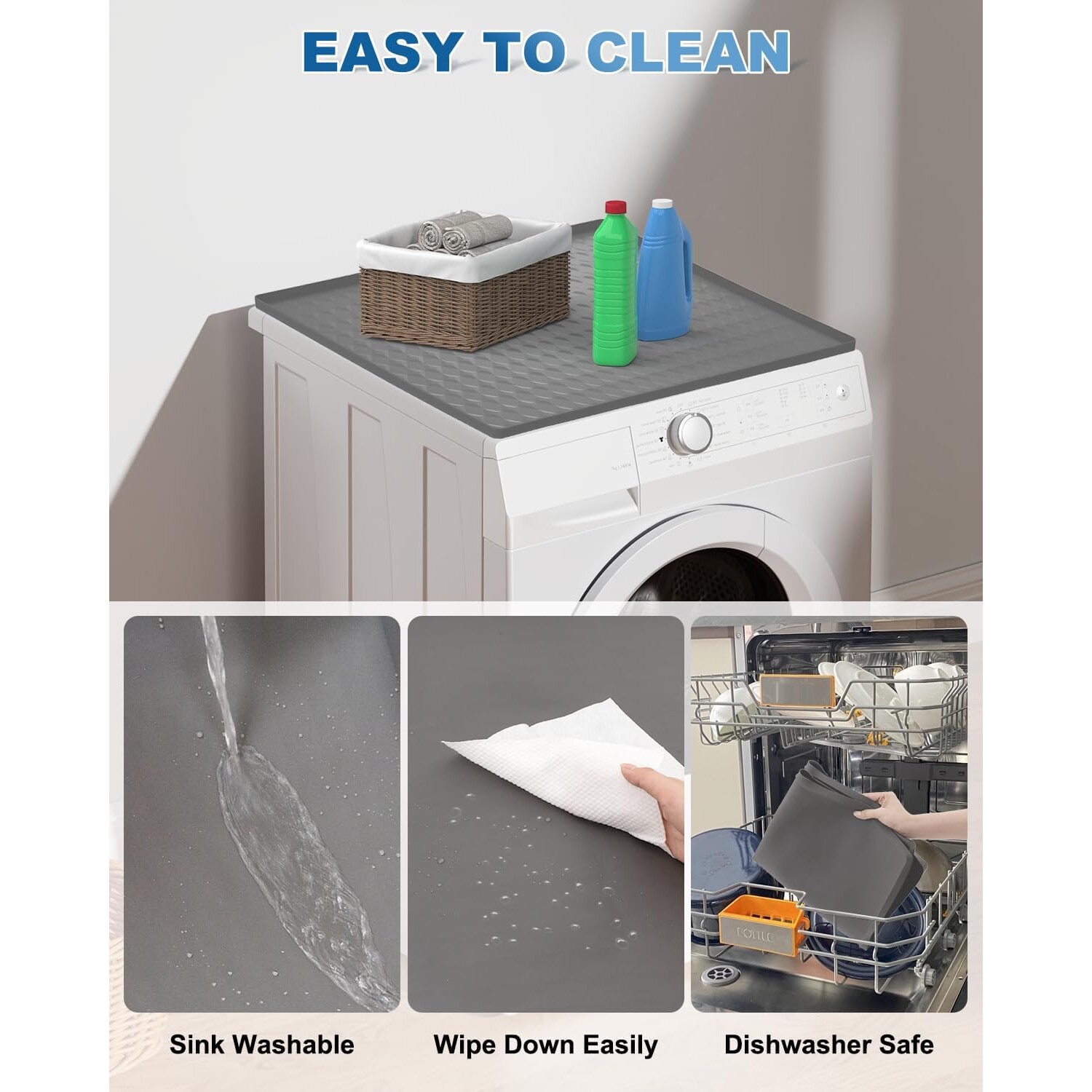 2. Silicon gros durabil, cu o aderenta buna - Padul superior pentru masina de spalat are o textura clara si o aderenta buna pentru a preveni alunecarea articolelor de pe masina. Acesta este un tampon de cauciuc siliconic rezistent, care este foarte durabil si rezistent la caldura, protejand aparatele dvs. de zgarieturi si absorbind bine caldura uscatorului.