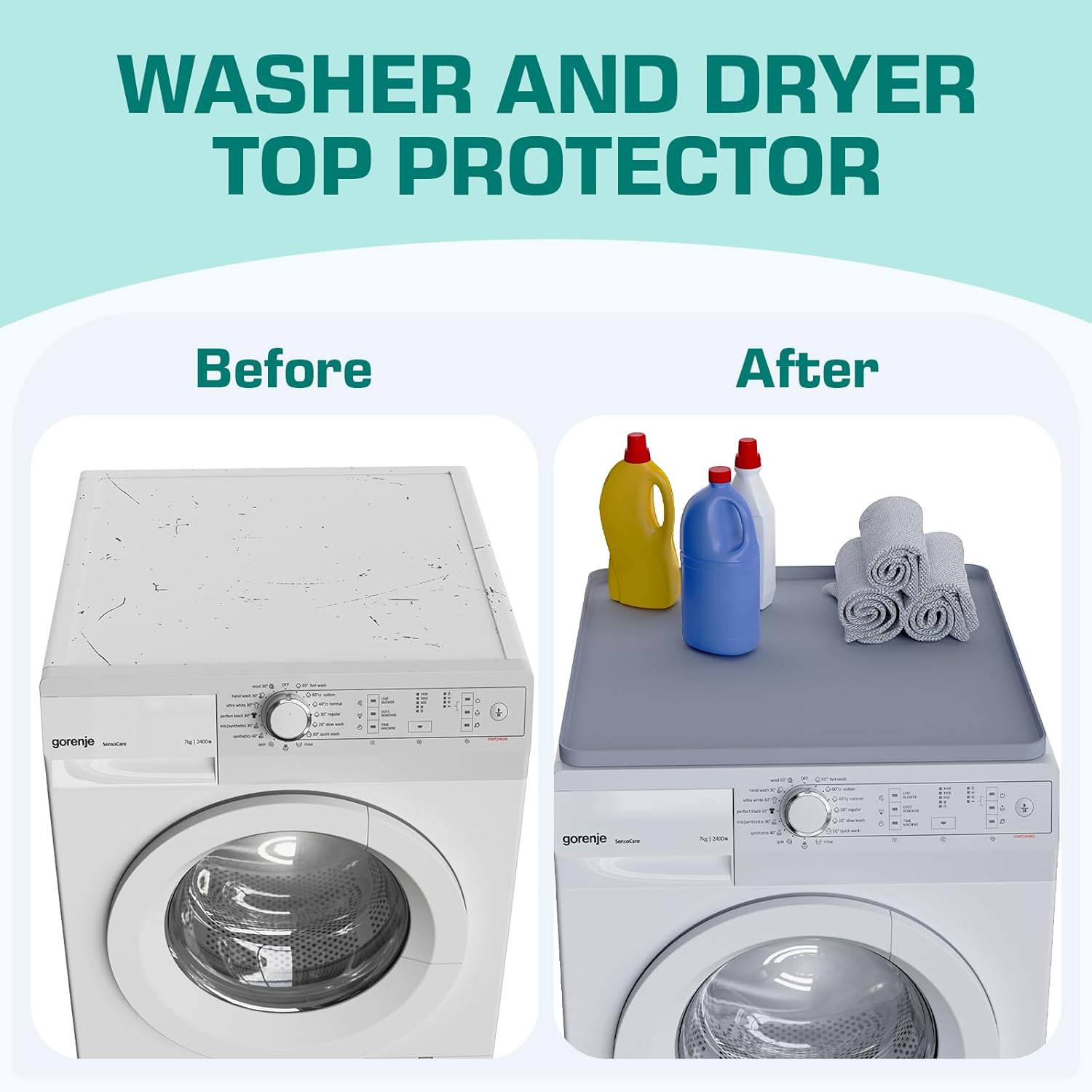 1. Potrivire perfecta - Padul nostru de protectie superior pentru masina de spalat si uscator masoara aproximativ 60*60 cm, o dimensiune mare perfecta pentru a proteja complet partea superioara a majoritatii uscatoarelor, masinilor de spalat sau altor aparate. Va rugam sa va masurati masina inainte de a cumpara.