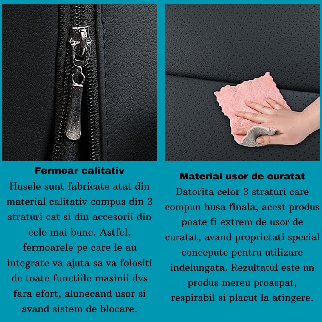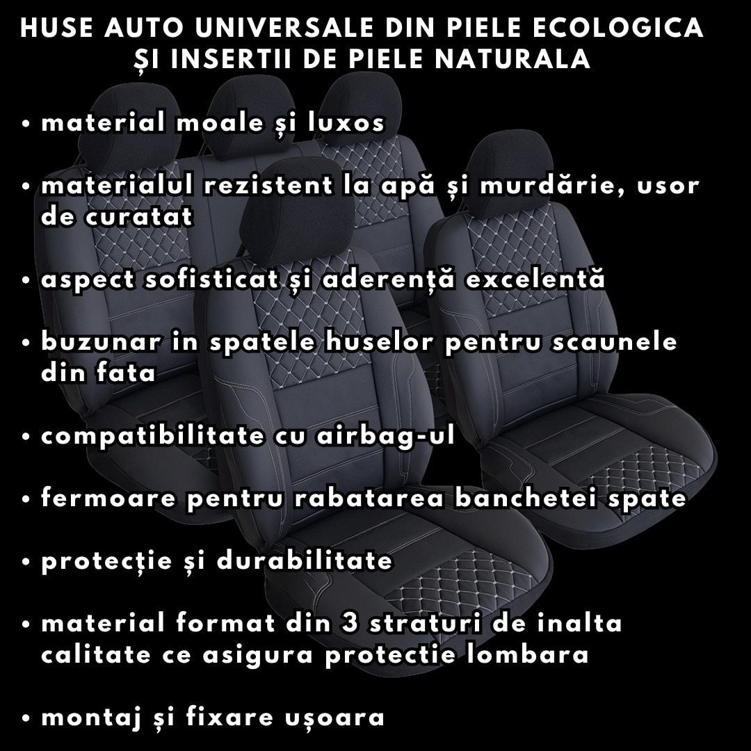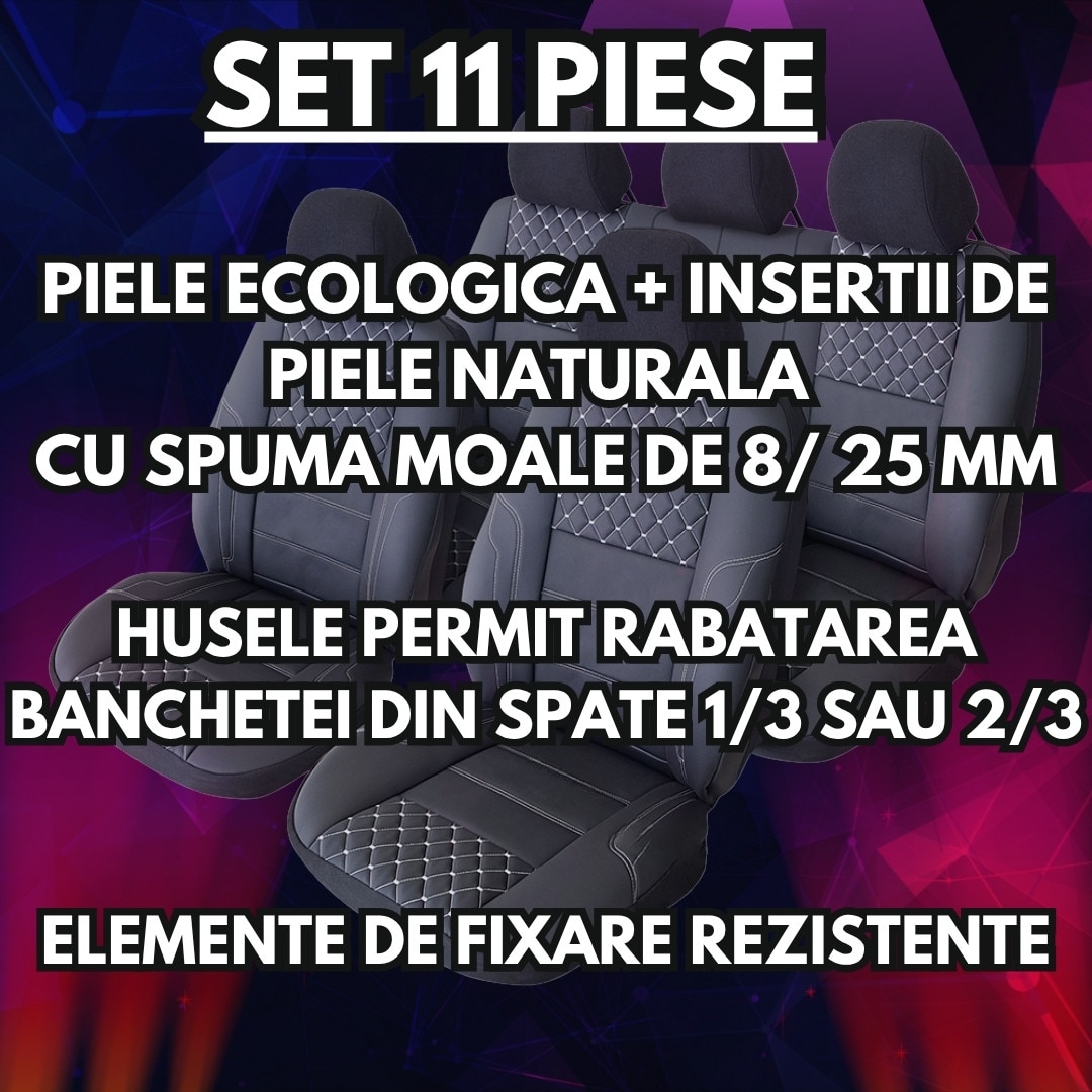 | Continut pachet | •pentru bancheta spate: husa sezut + husa spatar•pentru scaunele din fata: 2 huse sezut + 2 huse spatar•pentru tetierele scaunelor din fata si spate: 5 huse |