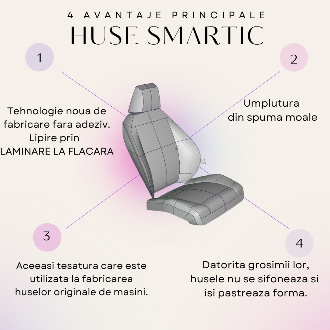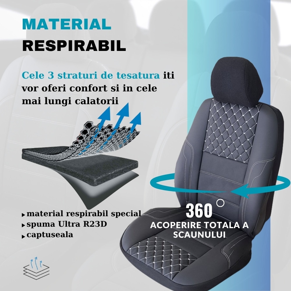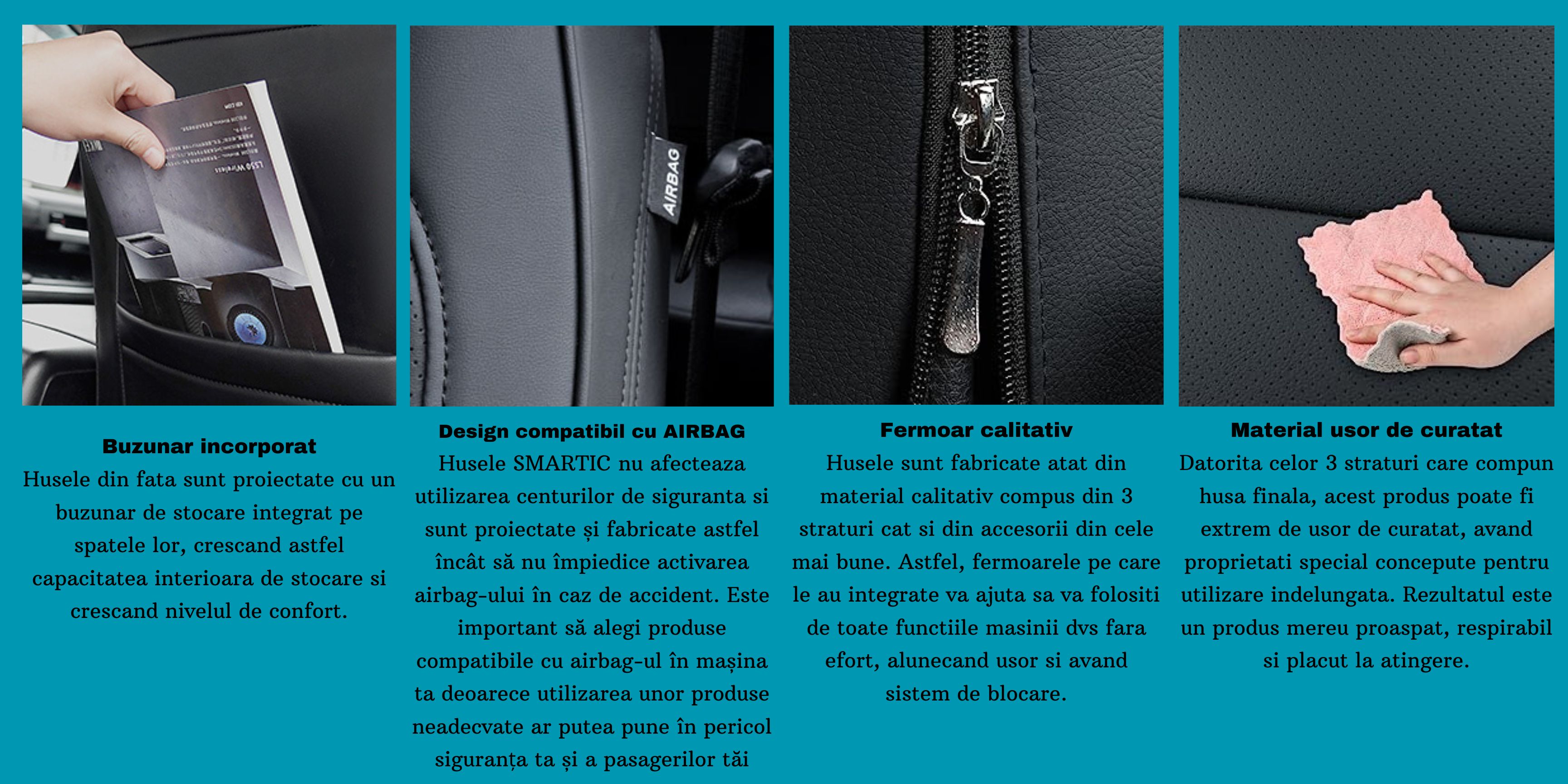 | Continut pachet | •pentru bancheta spate: husa sezut + husa spatar•pentru scaunele din fata: 2 huse sezut + 2 huse spatar•pentru tetierele scaunelor din fata si spate: 5 huse |
