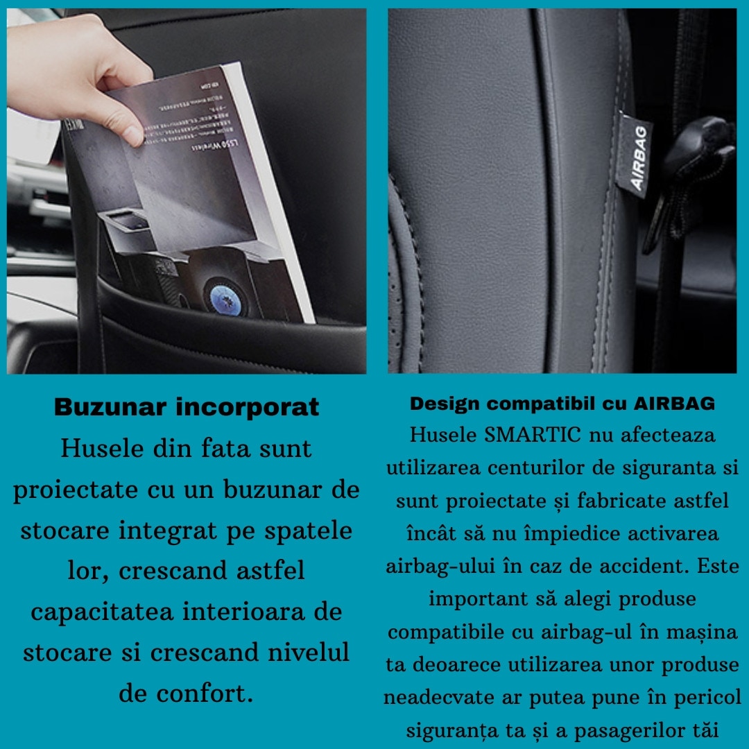 Huse scaune auto Smartic®, Queen, piele ecologica si insertii de piele naturala, 11 piese, compatibile cu airbag, rabatabile, 3 straturi de material, negru/gri