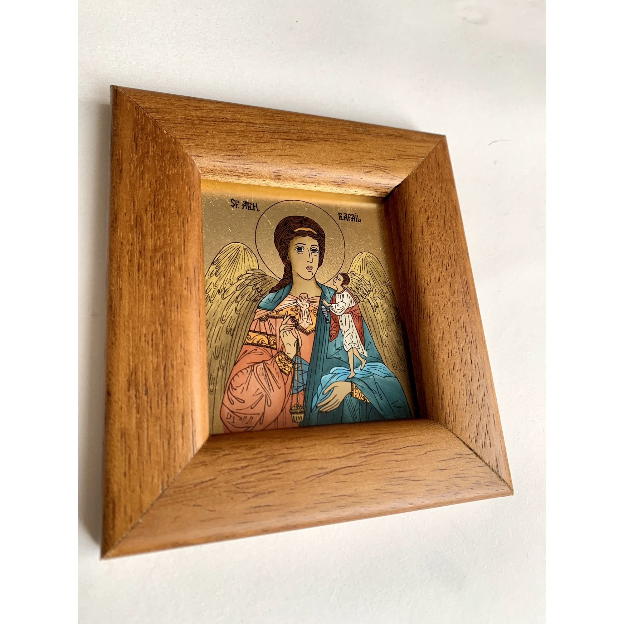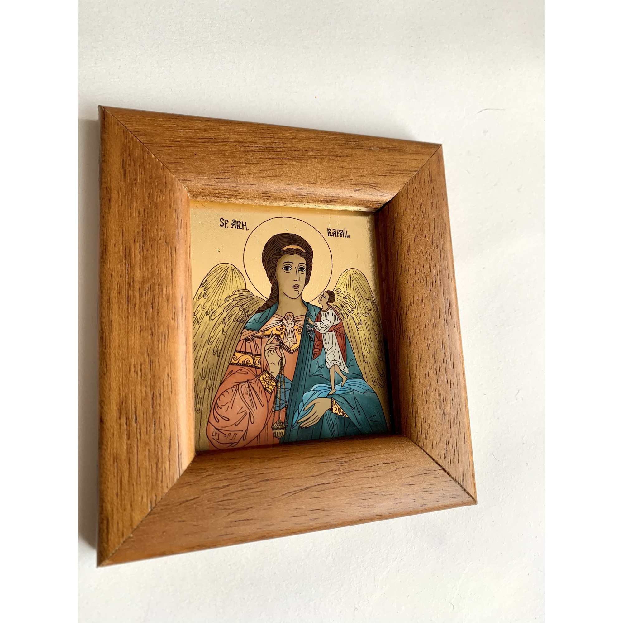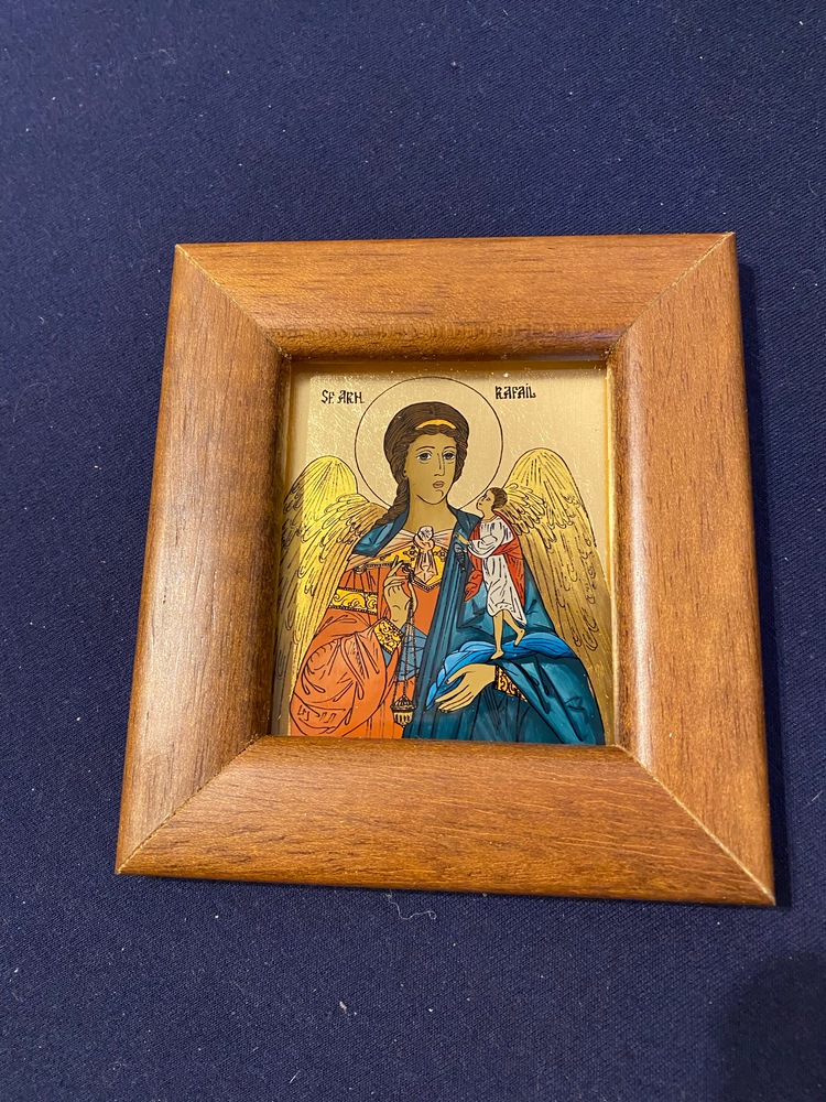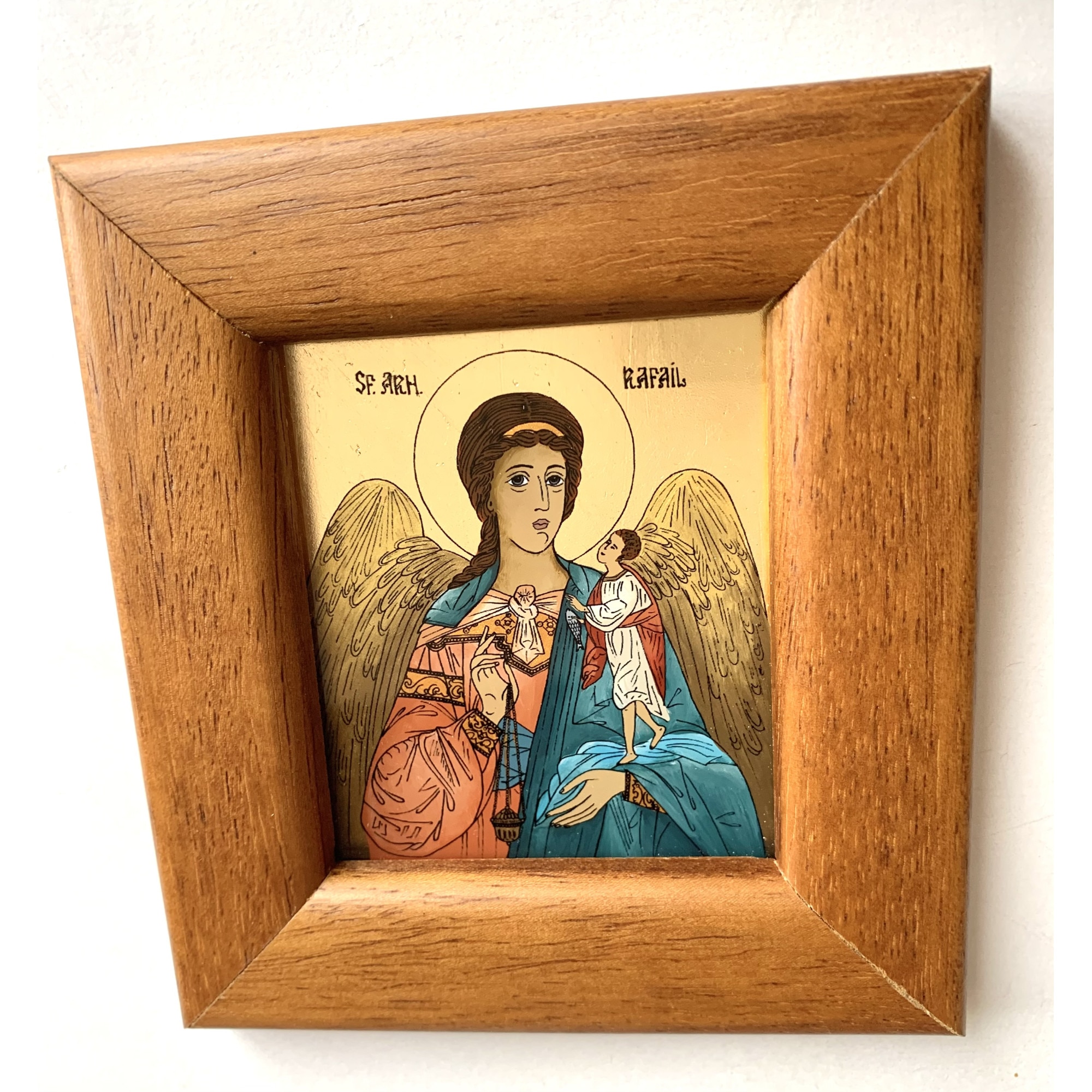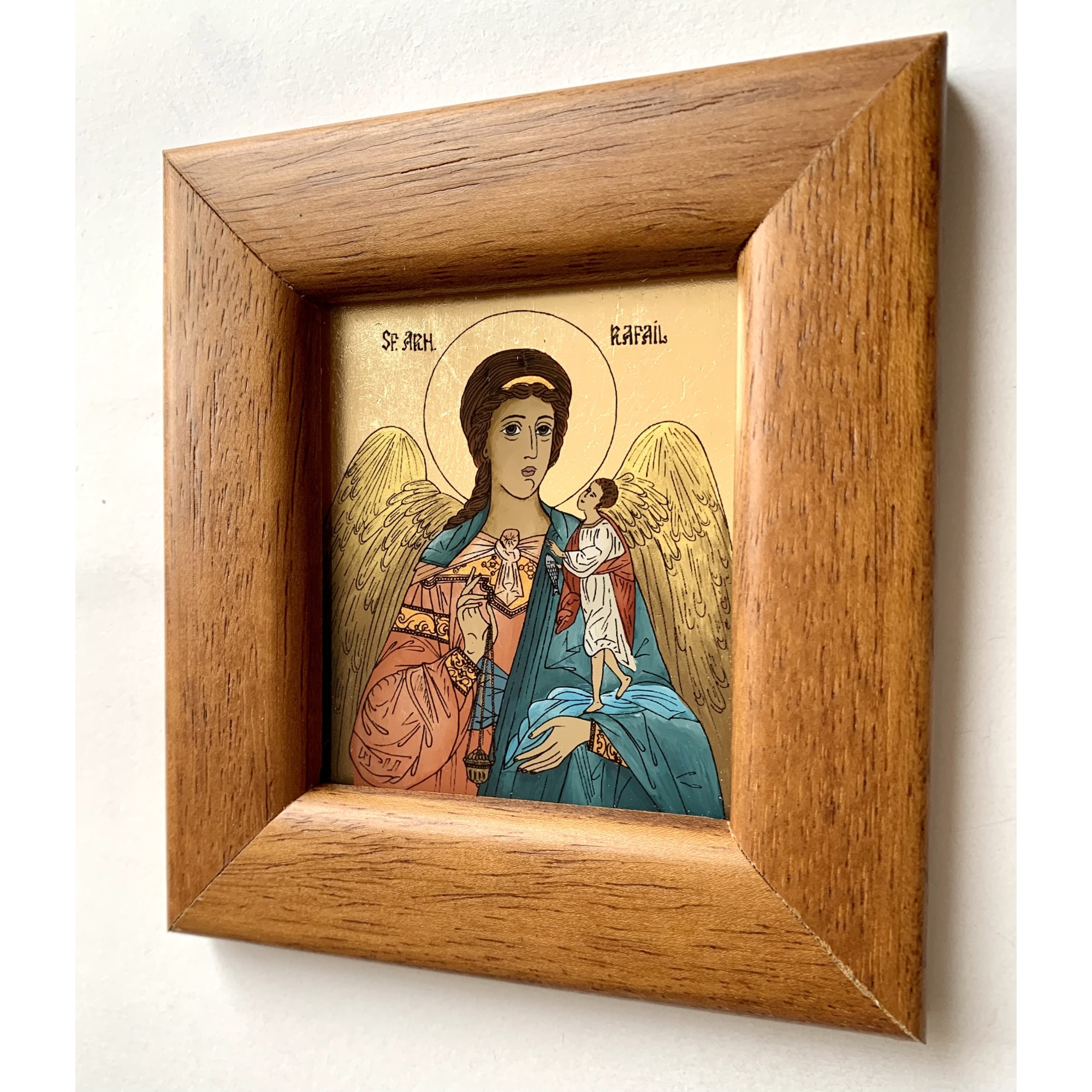 Icoana pictata manual pe sticla , Sfantul Arhanghel Rafail ,Sf Rafael, Pazitorul Cununiilor, 12x11 cm