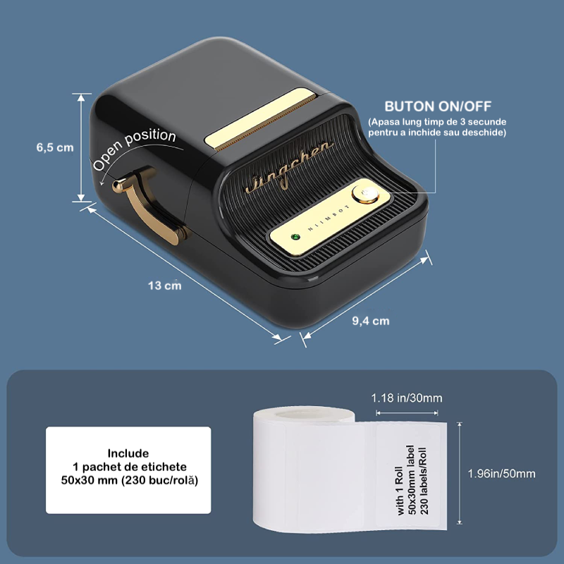 | Continut pachet | 1 x Cablu USB 1 x Imprimanta termica 1 x Rola de etichete 1 x Manual cu instructiuni |