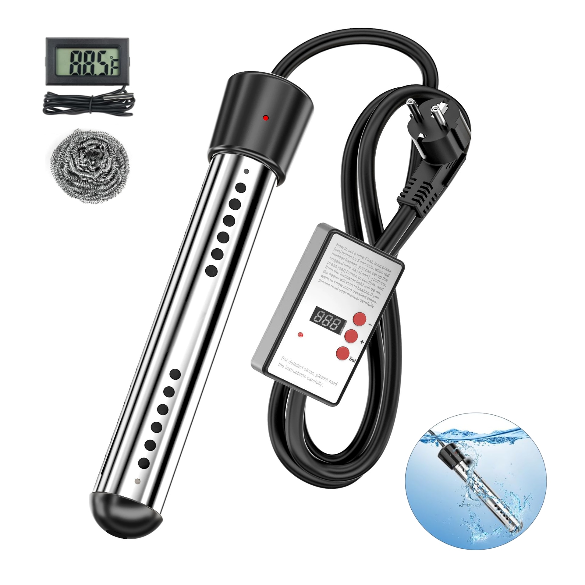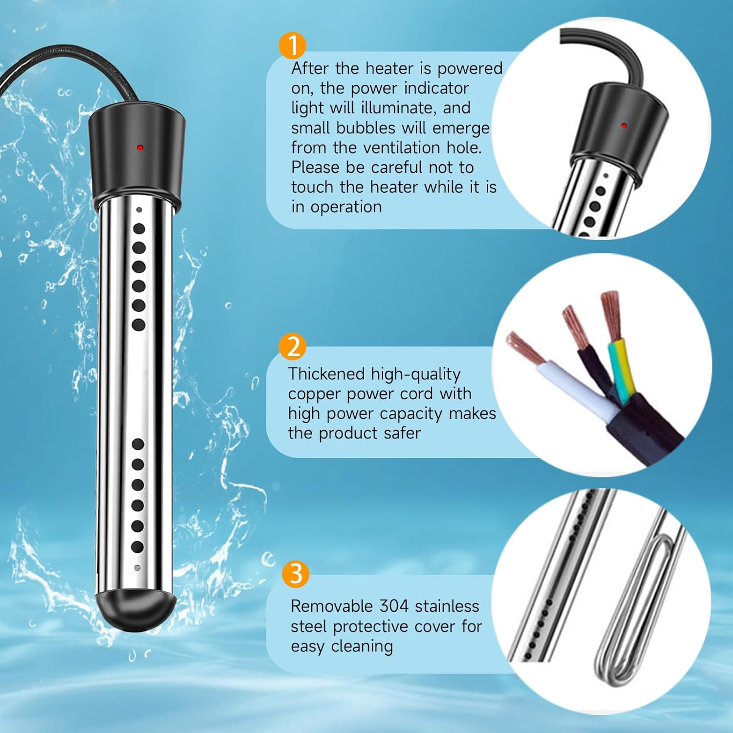 Incaltatorul imersibil are un fir de cupru groasa si o capaca de protectie din inox 304, care previne supra incalzirea si rugina. Lampa indicatora de putere si afisajul digital LCD al temperaturii va permit sa monitorizati usor temperatura apei in orice moment, asigurand o functionare sigura. Aceste caracteristici de siguranta va dau pace de minte in timpul folosirii incaltatorului.
