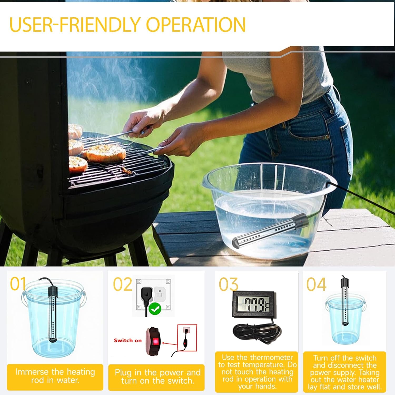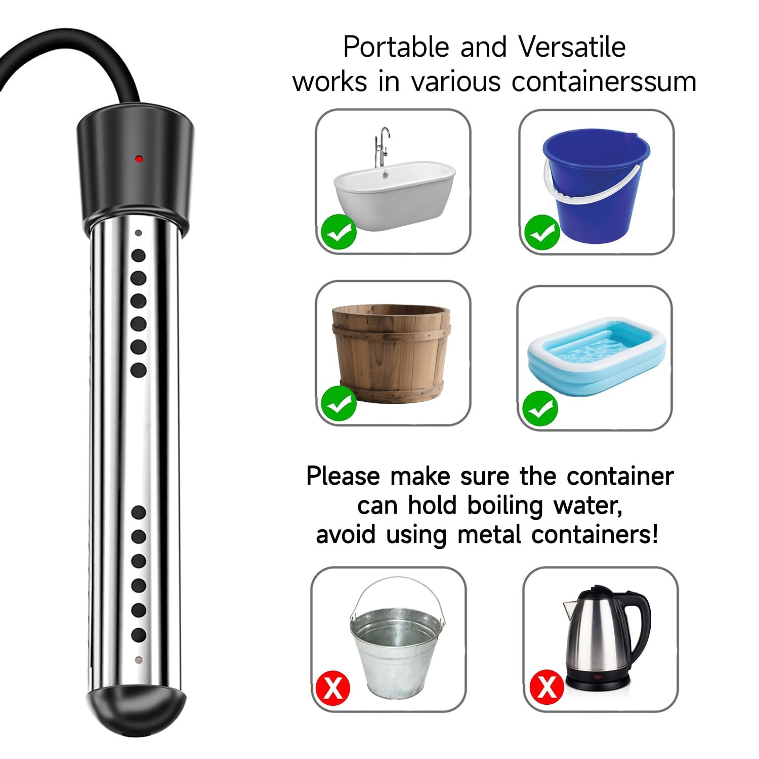 Acest incaltator imersibil este usor si portabil, potrivit pentru diferite recipiente precum galeti de plastic, baie si piscine inflabile mici (nu utilizati recipiente metalice). Este cel mai bun companiune pentru camping, calatorii sau orice activitati in aer liber, astfel incat puteti bucura de apa fierbinte oriunde sunteti. Portabilitatea sa il face o adaugare versatila la echipamentul dvs. de calatorie.