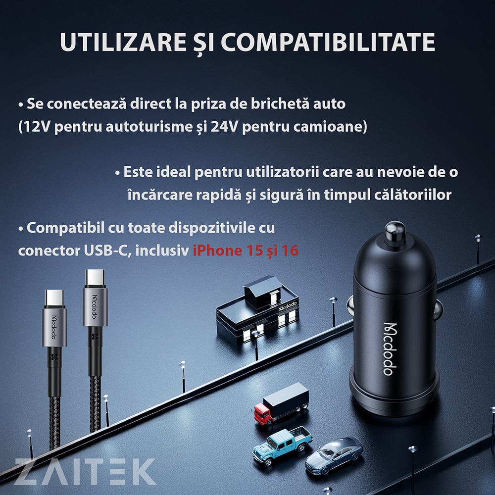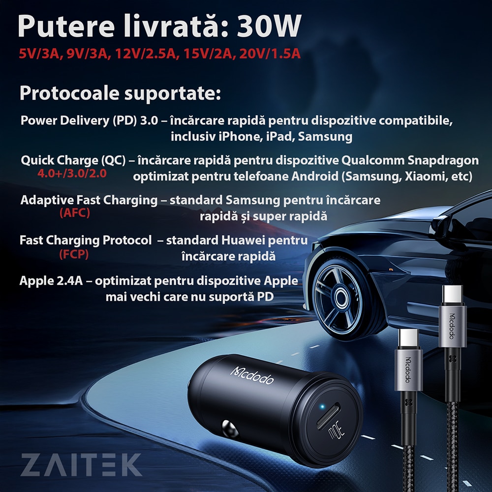 Acest incarcator auto compact impreuna cu cablul USB-C, cu CIP E-Marker, de 120cm este ideal pentru alimentarea rapida a dispozitivelor tale mobile in timpul calatoriilor. Cu o putere maxima de 30W si compatibilitate extinsa cu multiple protocoale de incarcare rapida, asigura o incarcare sigura si optimizata pentru telefoane, tablete, laptopuri compatibile si alte dispozitive electronice.