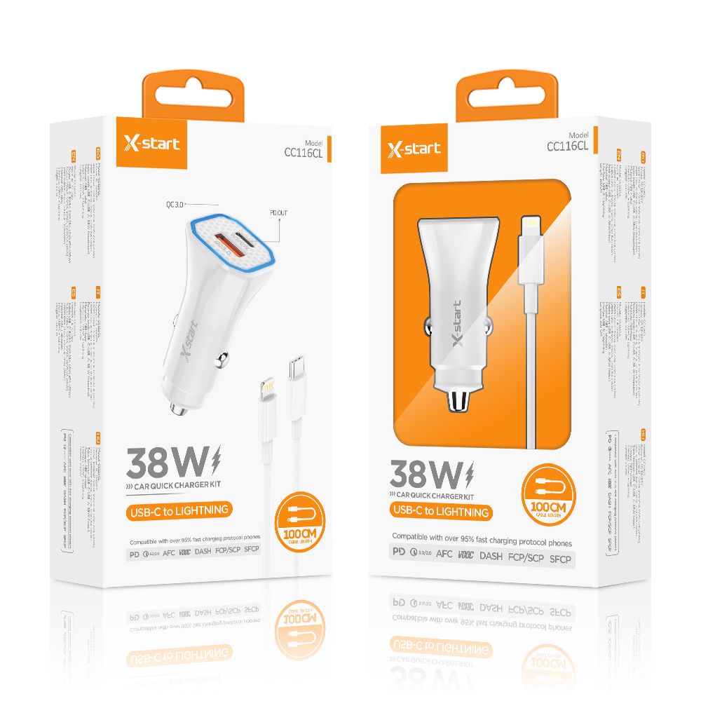 Incarcator auto X-Start Daden CC116CL + cablu de incarcare Lightning, Incarcare rapida, Quick Charge 3.0, 5V, 3A, Power Delivery 20W, 1xUSB-C, 1xUSB-A, Alb