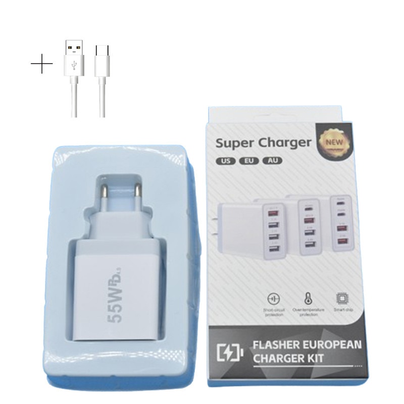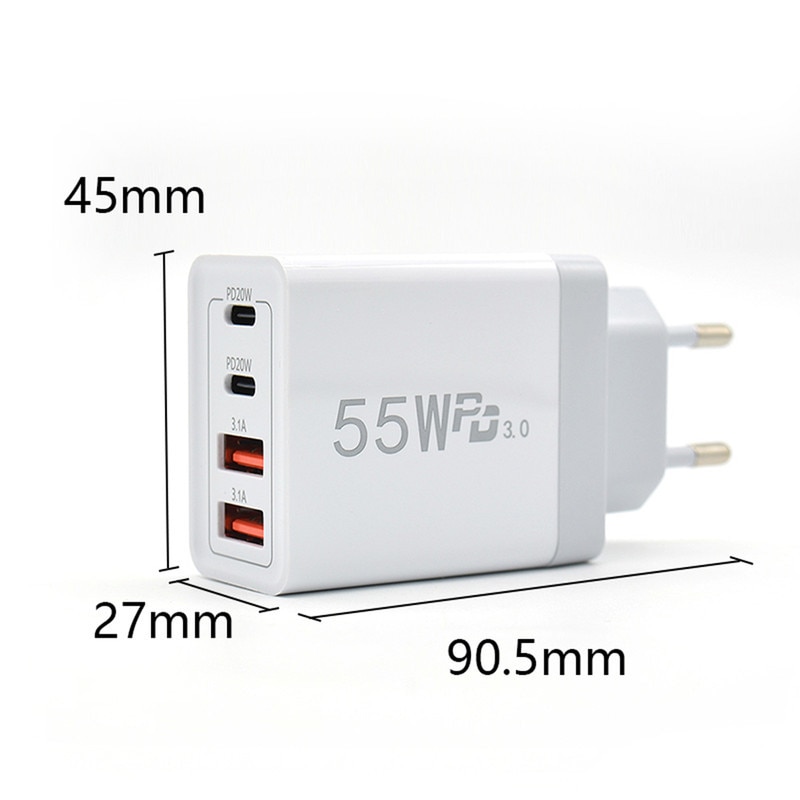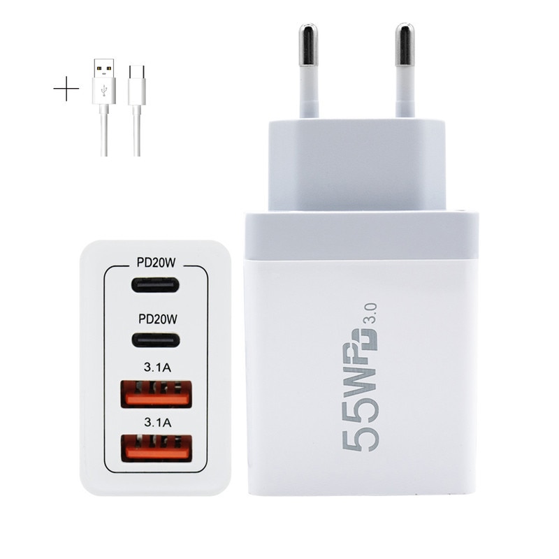 Incarcator Rapid EU 55W 4-Port, 2×20W Type-C & 2×7.5W Type-A, Pentru iPhone 16-11 Pro/Max/Plus/iPad/AirPods&Samsung&Android, Universal Bluetooth Headset/GPS/Gamepad/Cycling Light