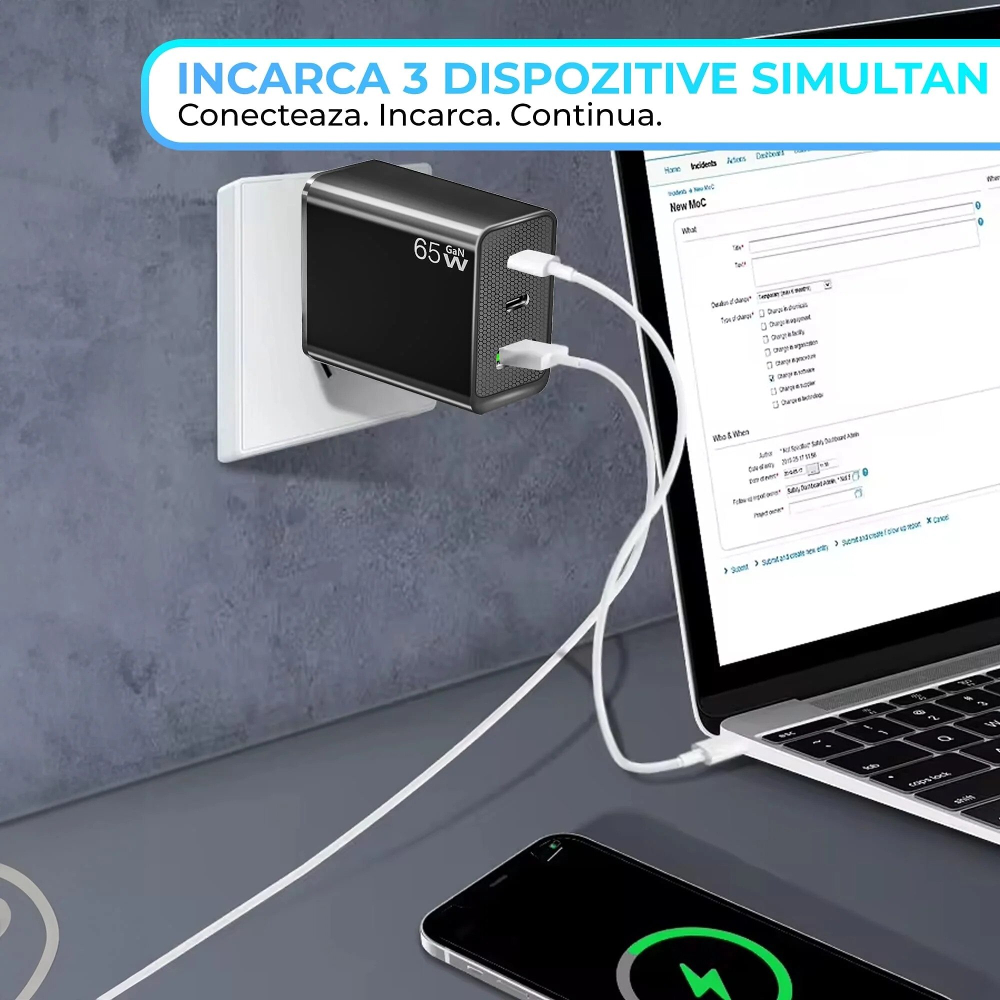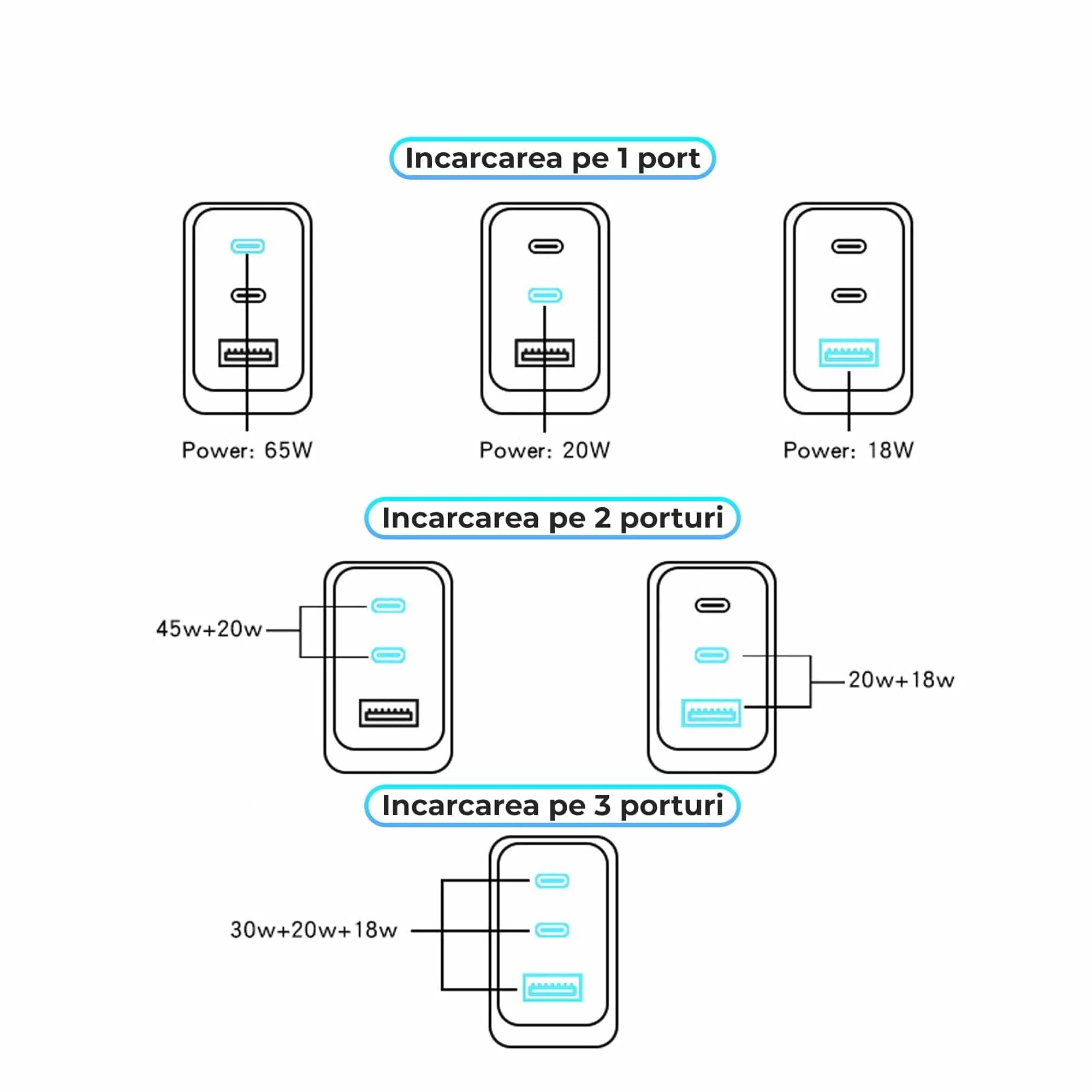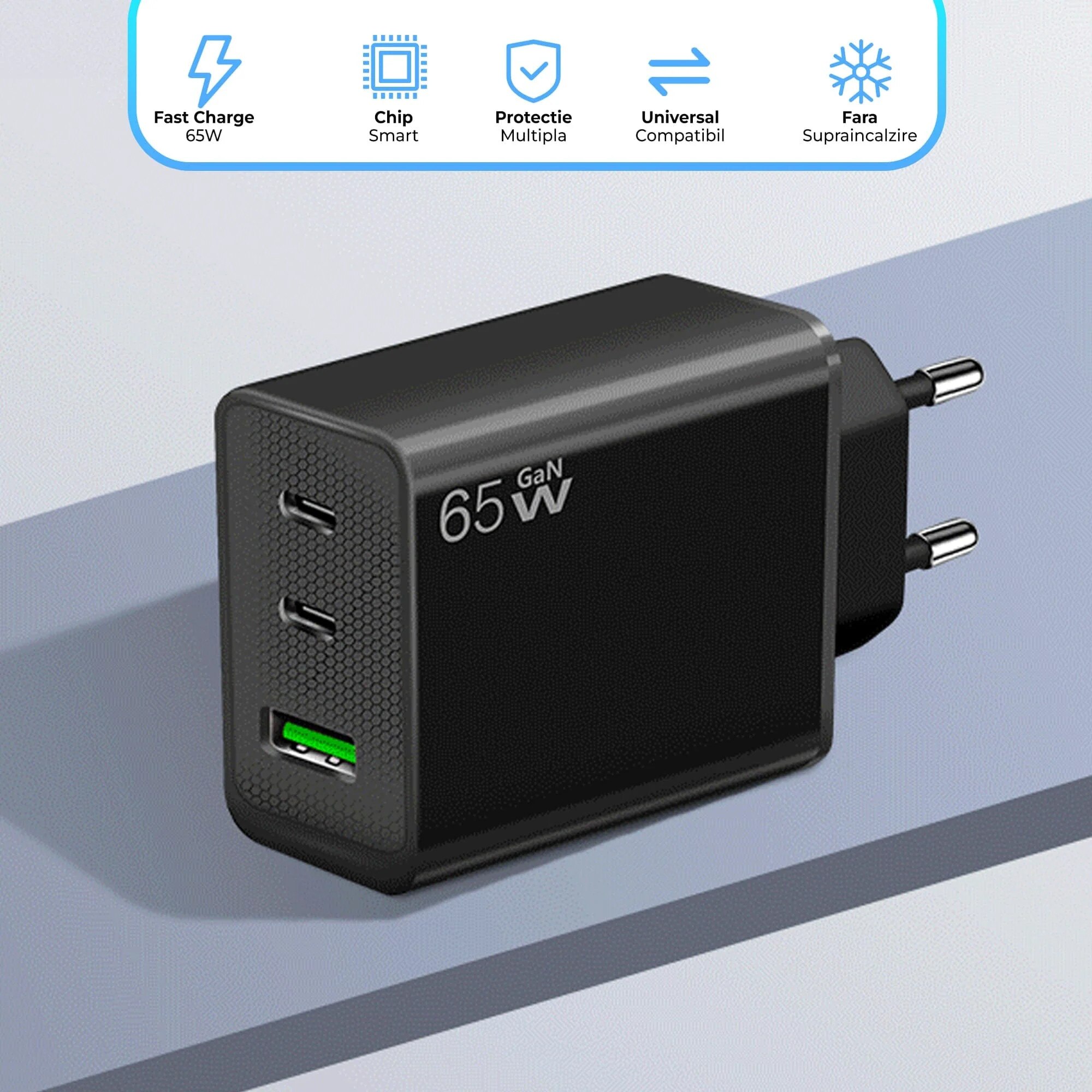| Functii | Ergonomic Protectie supratensiune Protectie la scurtcircuit Protectie la supra-incalzire Permite incarcarea simultana a 3 dispozitive 1 X USB QUICK CHARGE Fast Charge 65 W 2 x Type-C Quick Charge |