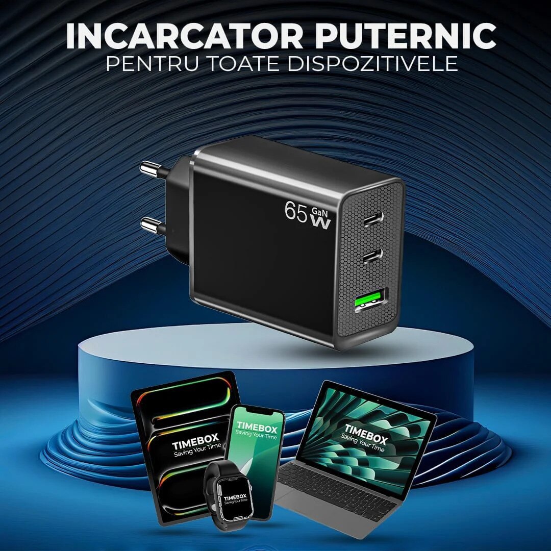 Incarcator Retea Timebox 65W Fast-Charge, 3 Porturi – 2 x Type-C si 1 x USB A, LED Indicator, Negru, Incarcare Rapida pentru Laptop MacBook, iPhone 13 14 15, Samsung Galaxy S22 S23, Huawei, Xiaomi, Design Compact