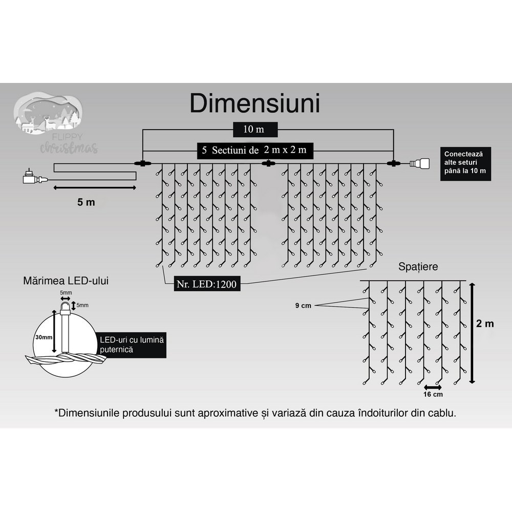 Instalatie Craciun, Tip Perdea, IP44, 10 m x 2 m, 1200 LED-uri, Albastru, 8 jocuri de lumini, Transformator, Interconectabila, Prelungitor 5 m inclus, Fir transparent, Interior/ Exterior, toolsy
