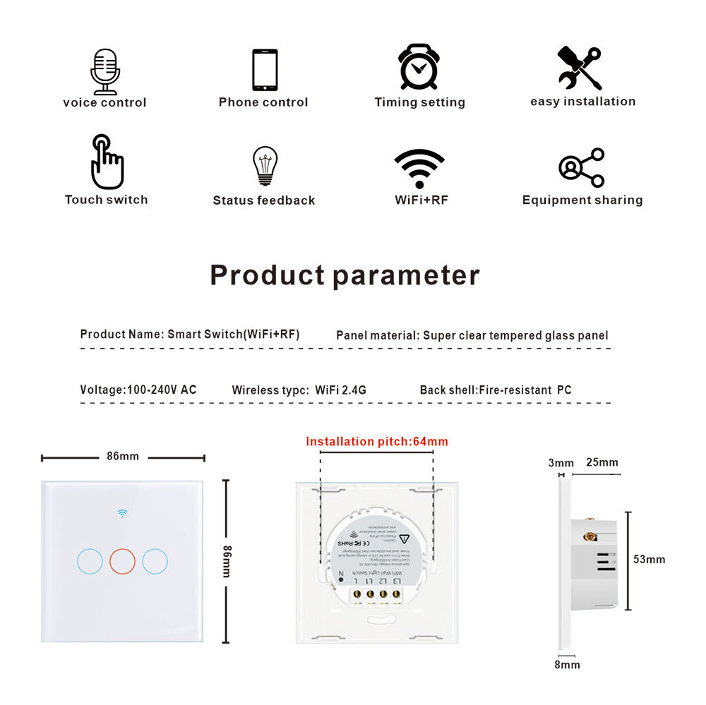 Intrerupator inteligent, CHIGOODS, Comutator tactil,3F, sticla securizata, RF 433MHz, Tuya Smart Life, compatibil Amazon Alexa/Google Assistant, LED, WIFI 2.4G, negru