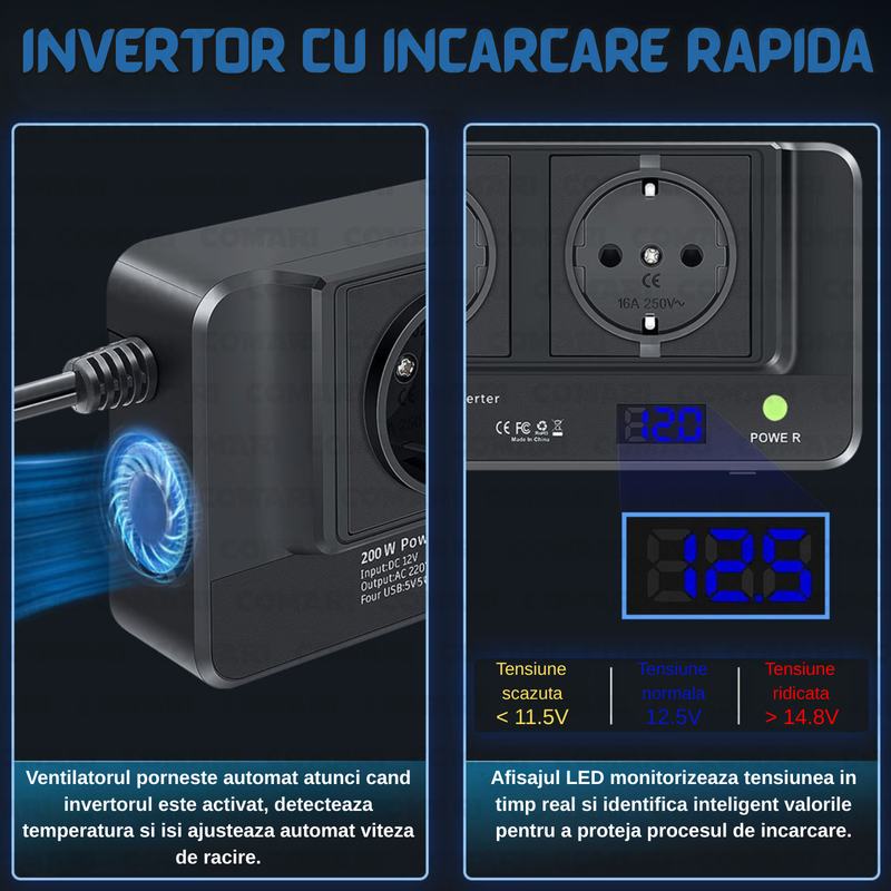 Invertor auto, Comari, 200W, priza 220V AC, 2 USB, Type-C, alimentare 12V, negru