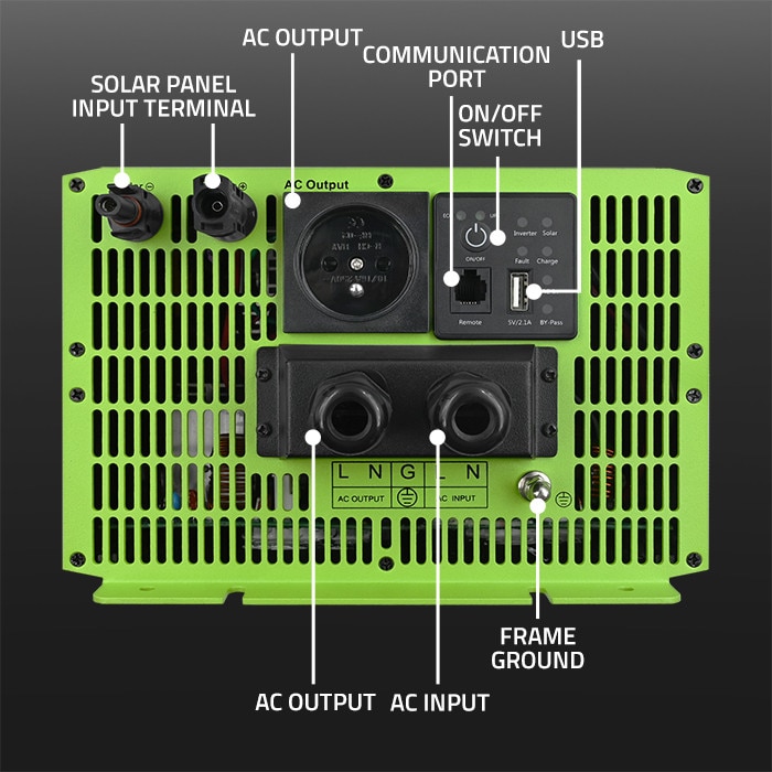 Invertor solar, Qoltec, Monolith, 3 in 1 cu functie de incarcare AC, MPPT, UPS, ATS, 1000W, 2000W, 12V la 230V, Sinus Pur, Negru/Verde