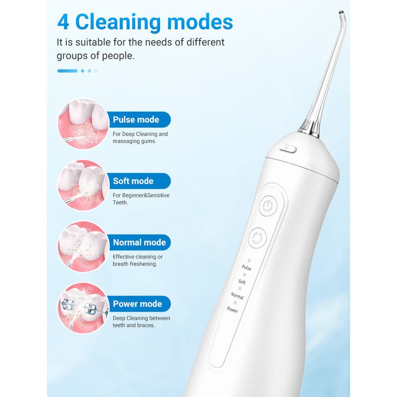 Irigator bucal electric, jet ultra-fin 0.6mm, 4 moduri inteligente, 4 duze, impermeabil IPX7, ABS ecologic, portabil, alb, 21x8.4x8.4cm