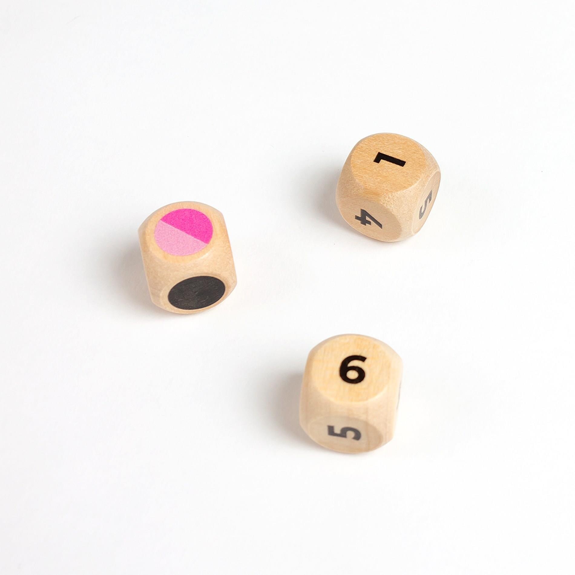 48 de blocuri de lemn in 4 culori (12 in fiecare culoare), 2 zaruri cu numere, 1 zar cu culori.
