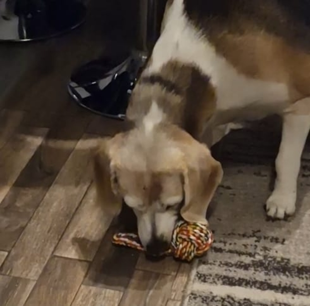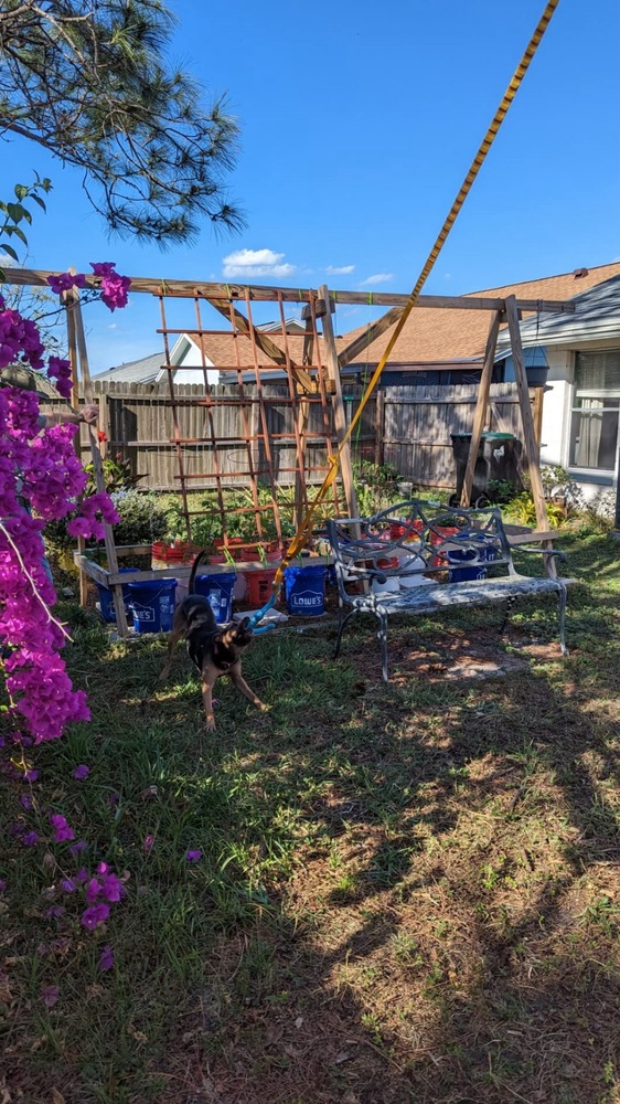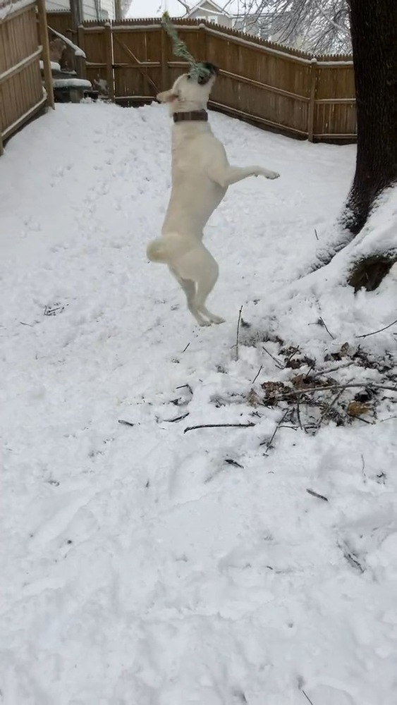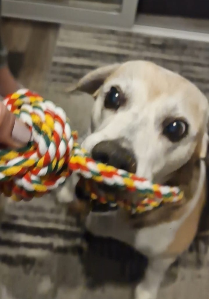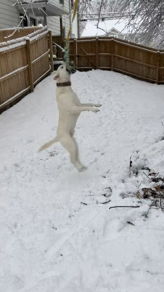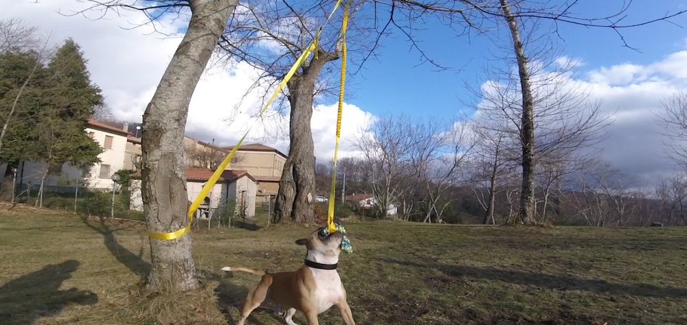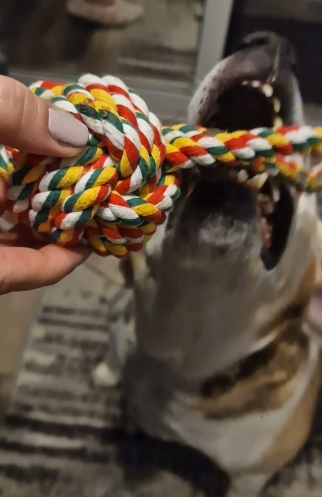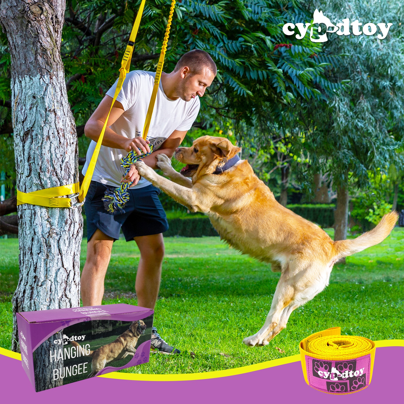 Inițial, bungee-ul a fost înfricoșător. A fost îngrozită când a revenit. Am legat într-un Kong și am înăbușit sau în unt de arahide timp de câteva zile, astfel încât ea să se obișnuiască cu mișcarea de balansare. Apoi m-am jucat la remorcher cu ea cu mâna ținând bungee-ul în mână, ca să-l pot da drumul lângă ea, ca să se obișnuiască cu săritura. Apoi urma să schimbăm de la jucăria ei preferată de remorcher cu frânghiile cu care a venit jucăria, dar ea se distra atât de mult încât am devenit creativi și ne-am îmbrăcat în jucăria ei preferată.