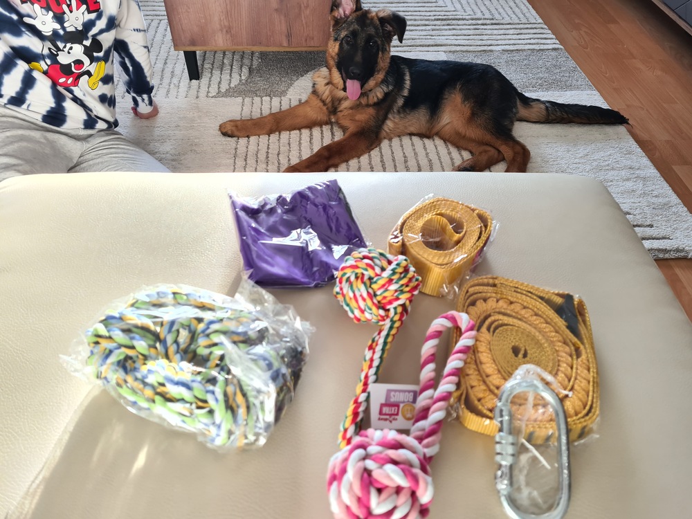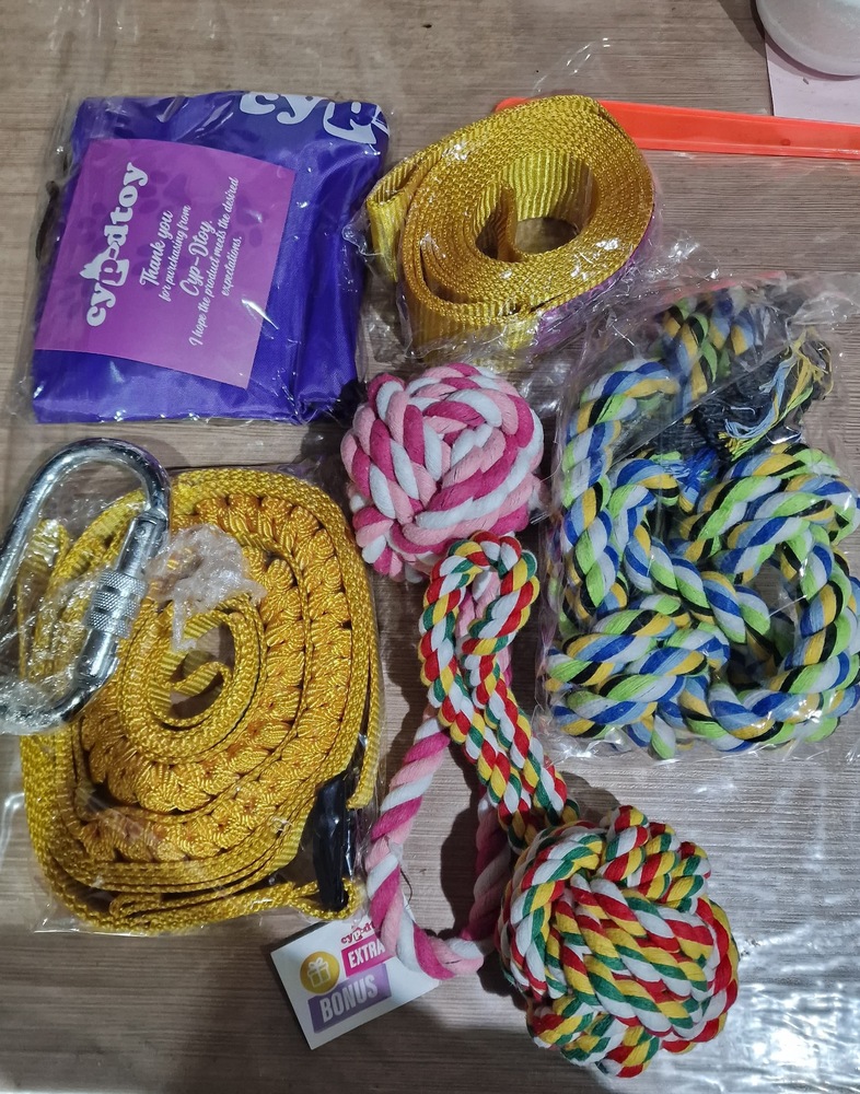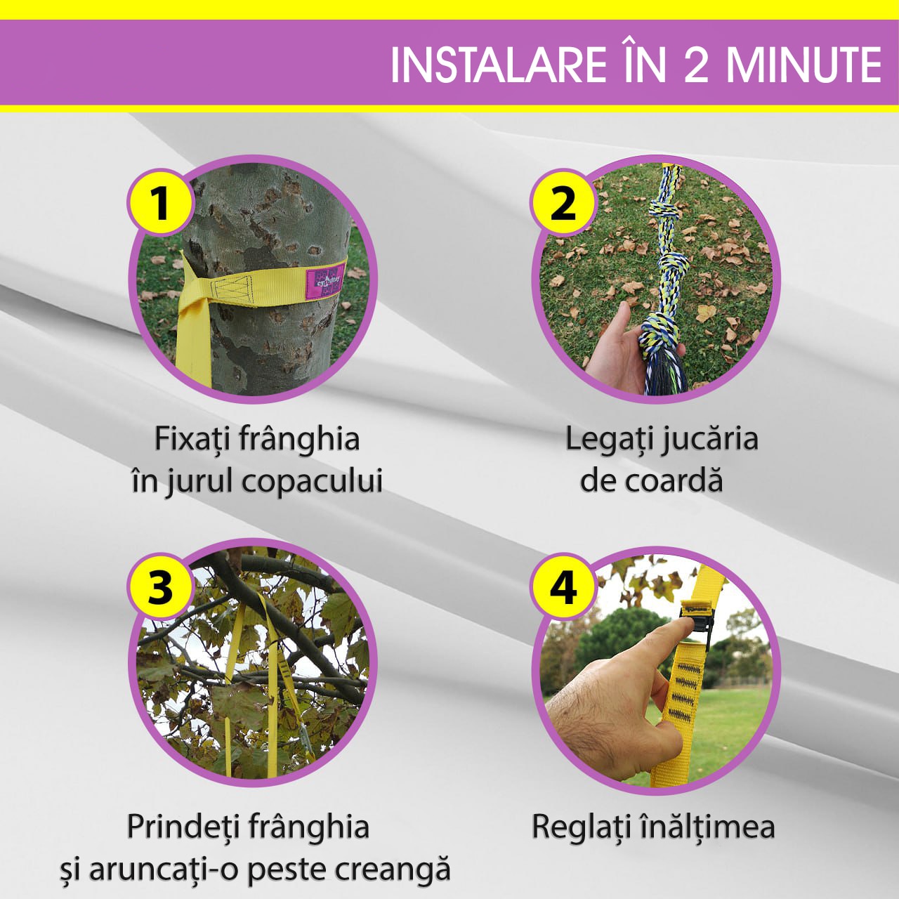 | Continut pachet | 1 saculet pentru depozitare si transport 2 Jucarii din franghie pentru caini din bumbac, usor de agatat 1 Cordon elastic ajustabil 1 carabina metalica 1 cutie de ambalaj (instructiunile sunt tiparite pe ea) |