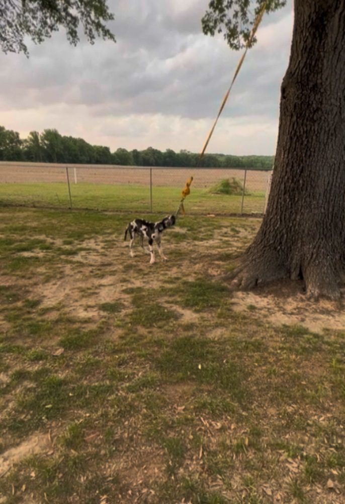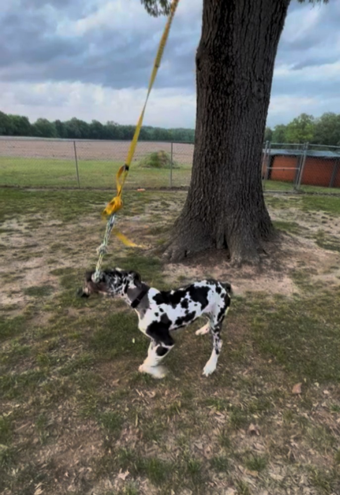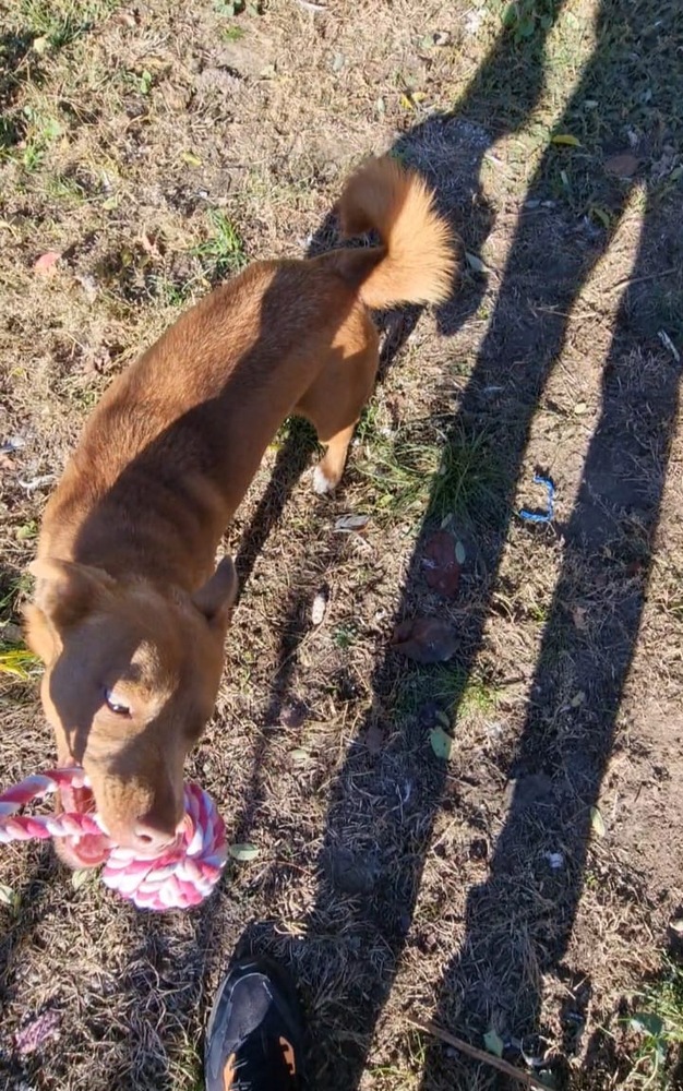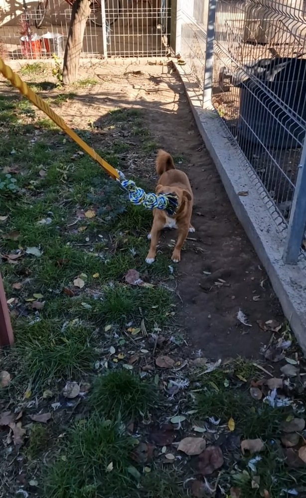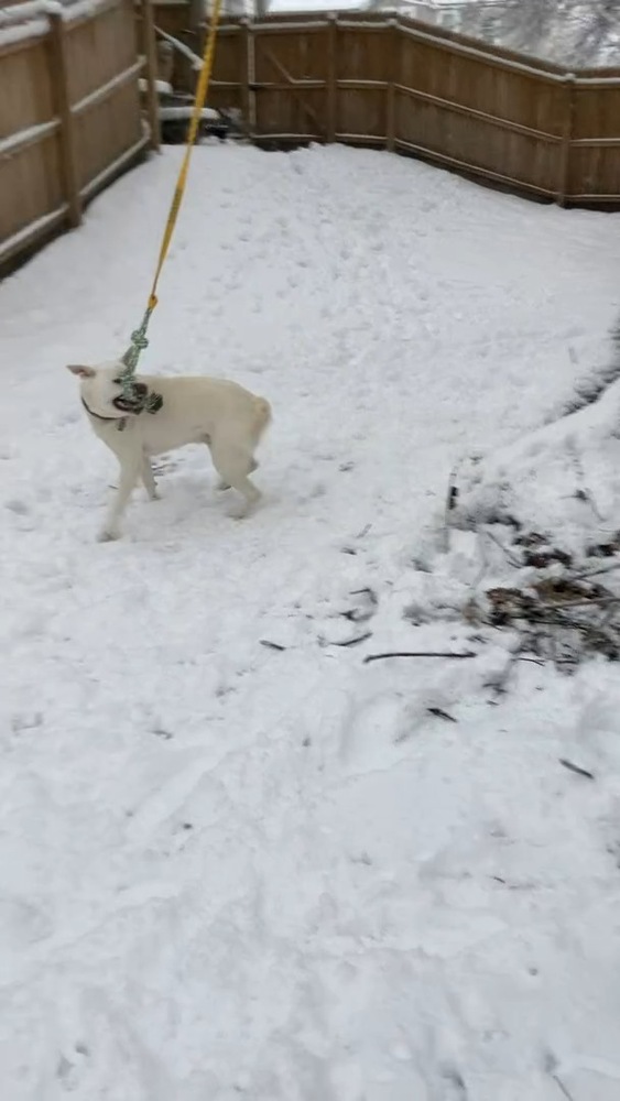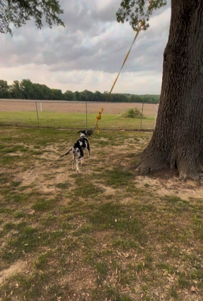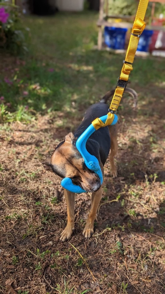 Acum, ori de câte ori devine prea zbuciumată sau începe să urmărească pisicile, o lăsăm afară să-și scoată energia pe bungee. Ea a oferit o mulțime de întăriri pozitive verbale. Următorul meu plan este să o învăț o modalitate de a ne spune când trebuie să tragă, care să nu includă urmărirea pisicilor ca precursor.