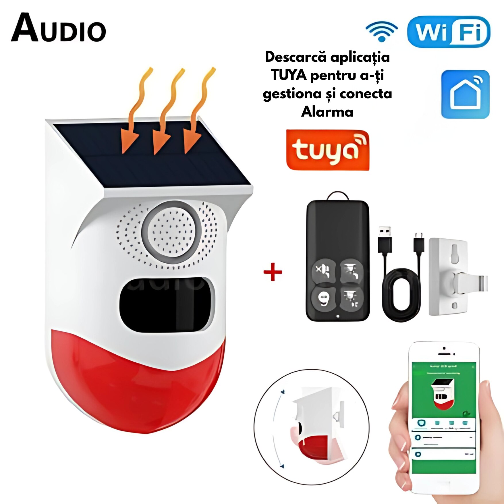 | Altele | Control de la distanta Material: ABS Sistemul poate fi controlat prin aplicatia de telefon mobil, disponibila pentru iOS si Android Sirena puternica Utilizare: Interior/exterior Semnal: Acustic si luminos Tuya (iOS si Android) Usor de instalat |