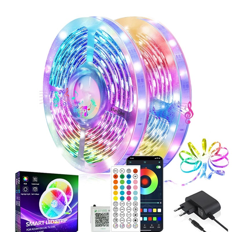 Kit Banda LED VIELLAN 40 metri (2X20M), Bluetooth, 16 leduri/m 3535 RGB, Adeziva, Aplicatie Telefon, Telecomanda, Mod Muzica, Timer, Interior IP20, Led Strip