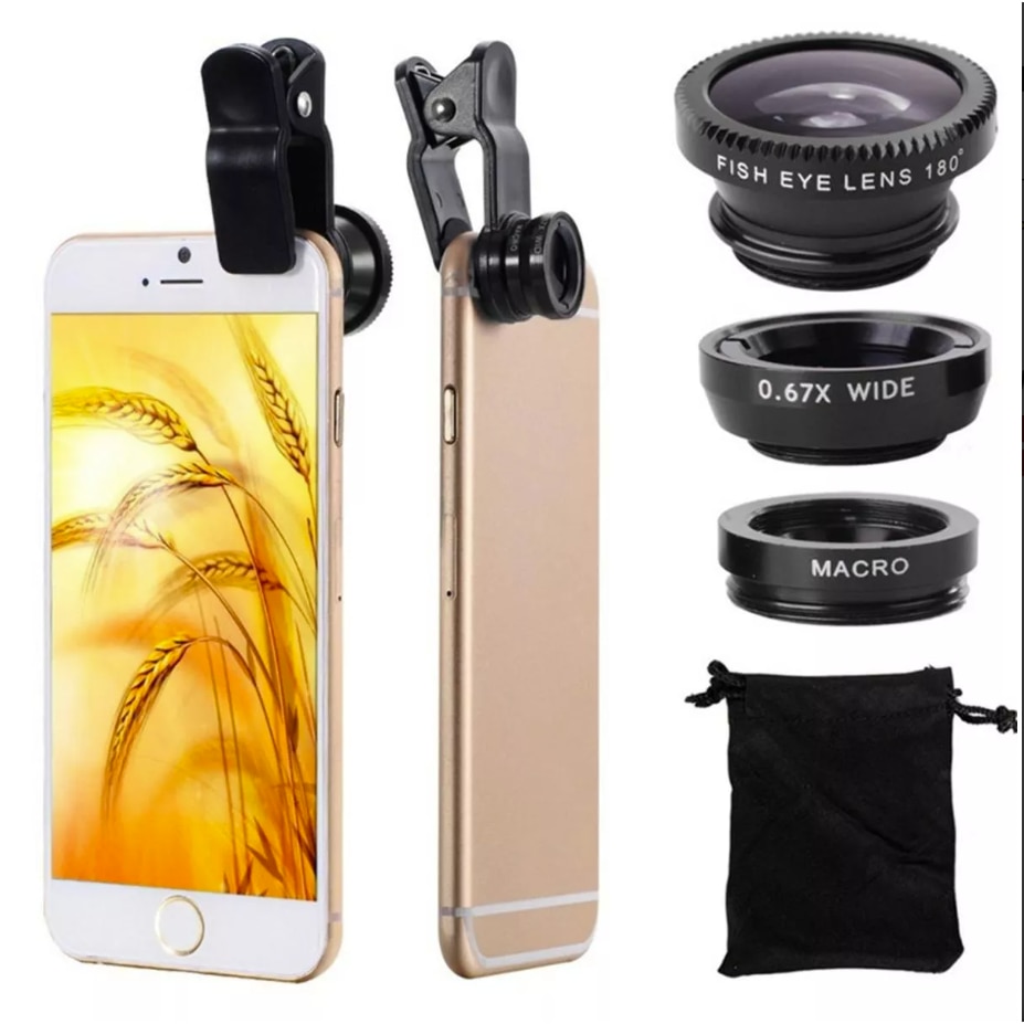 Kit lentile pentru camera foto telefon, Fish Eye, Macro si Wide, 2.5cm diametru lentila, cu clips, Negru