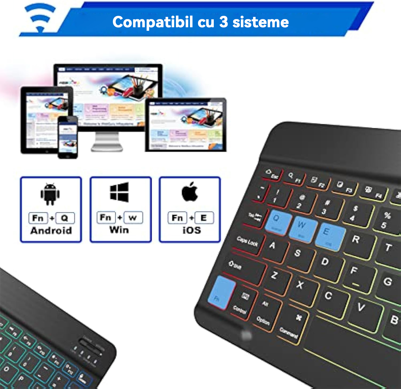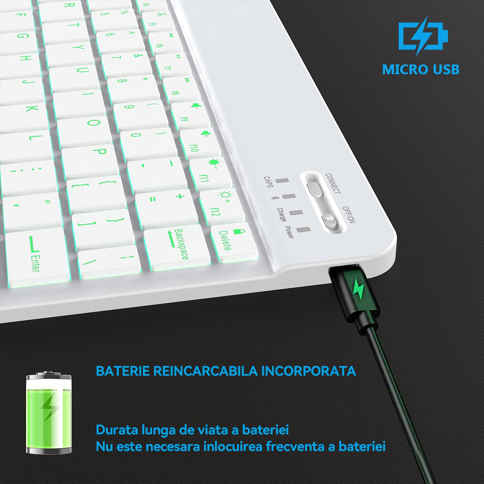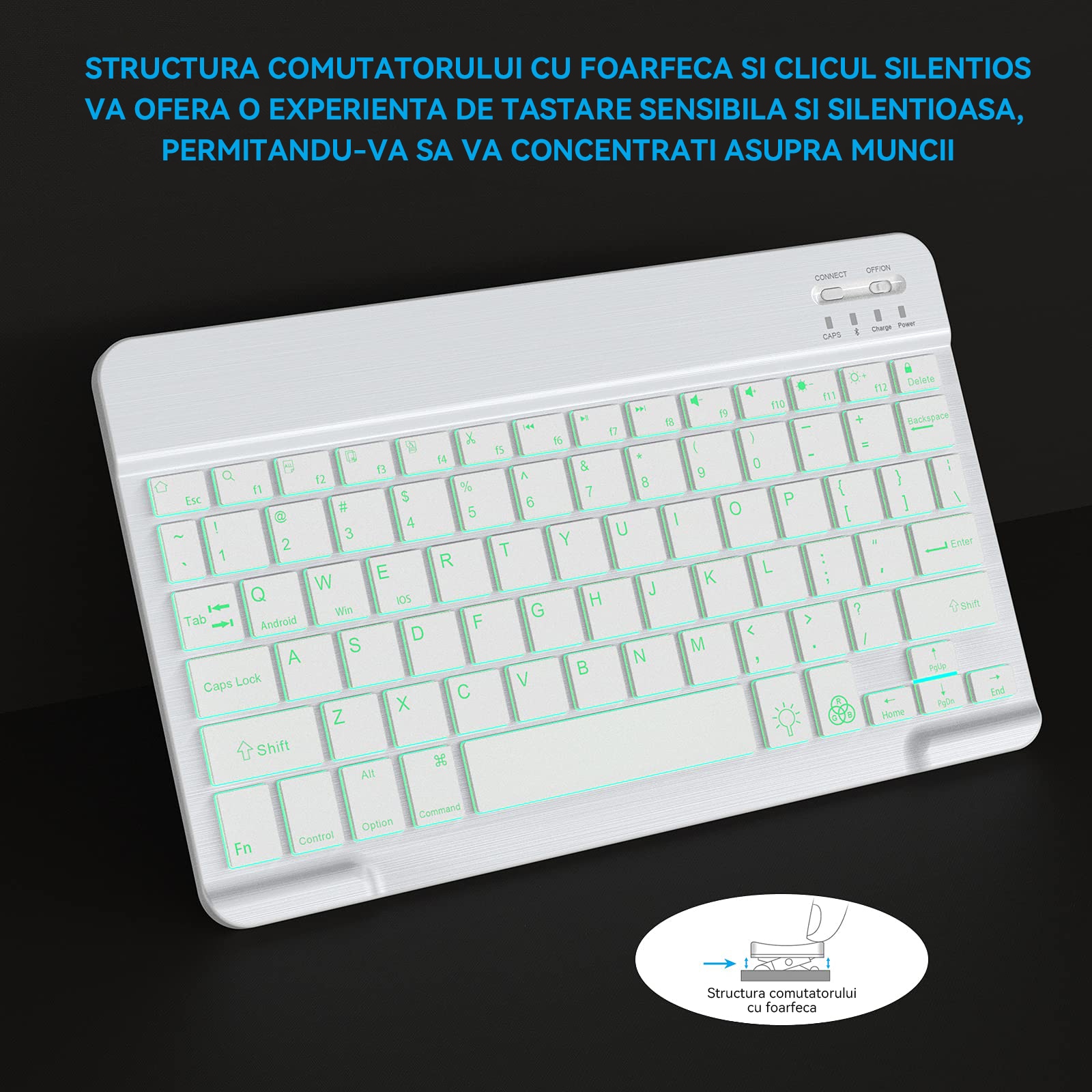 LED cu iluminare din spate in 7 culori: Aceasta tastatura Bluetooth are un mod de iluminare de fundal in 7 culori. Chiar si in intuneric, va face tastarea mai usoara si mai convenabila. Puteti comuta culorile intre rosu, galben, violet, verde, albastru de gheata, albastru si alb prin apasarea tastei RGB. Cand tastatura este inactiva, lumina se va opri automat pentru a economisi energie.
