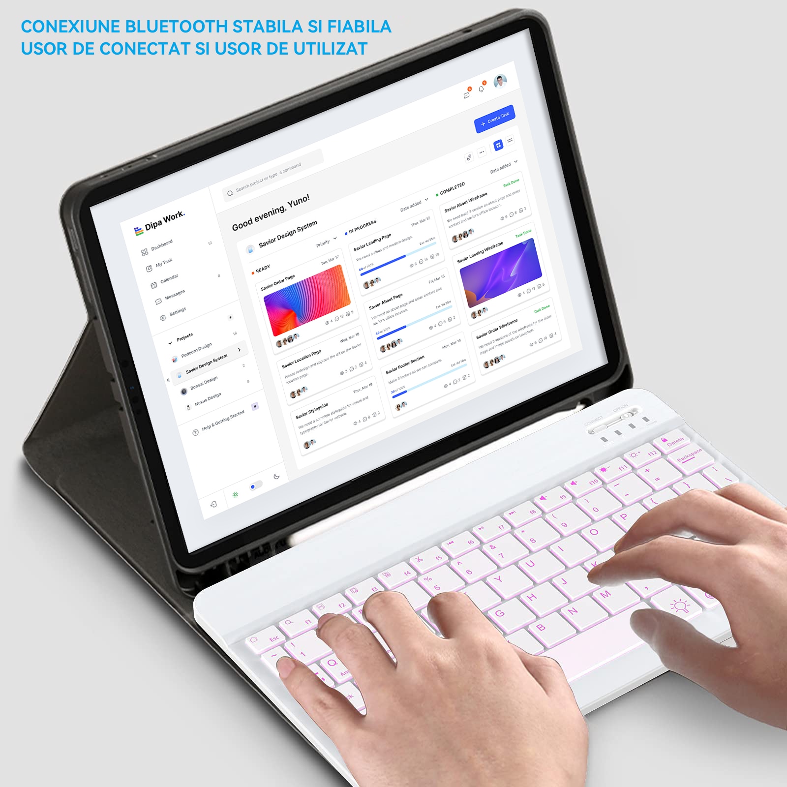 Compatibilitate larga: Tastatura Bluetooth este perfecta pentru tableta smartphone Android Windows, Samsung galaxy tab s7 plus a7 s6 lite, surface book pro x go 2 3 4 5 6 7, iOS iPhone, iPad mini 5 6 generation 7.9„ 8.3”, iPad 5th 6th 7th 8th 9th 10th gen 9.7in 10.2 in 10.9 inch, iPad Air 3rd 4th 5th generation 10.5 10.9 inch, iPad pro 1st 2nd 3rd 4th 5th generation 11 12.9 inch 2021 2022.