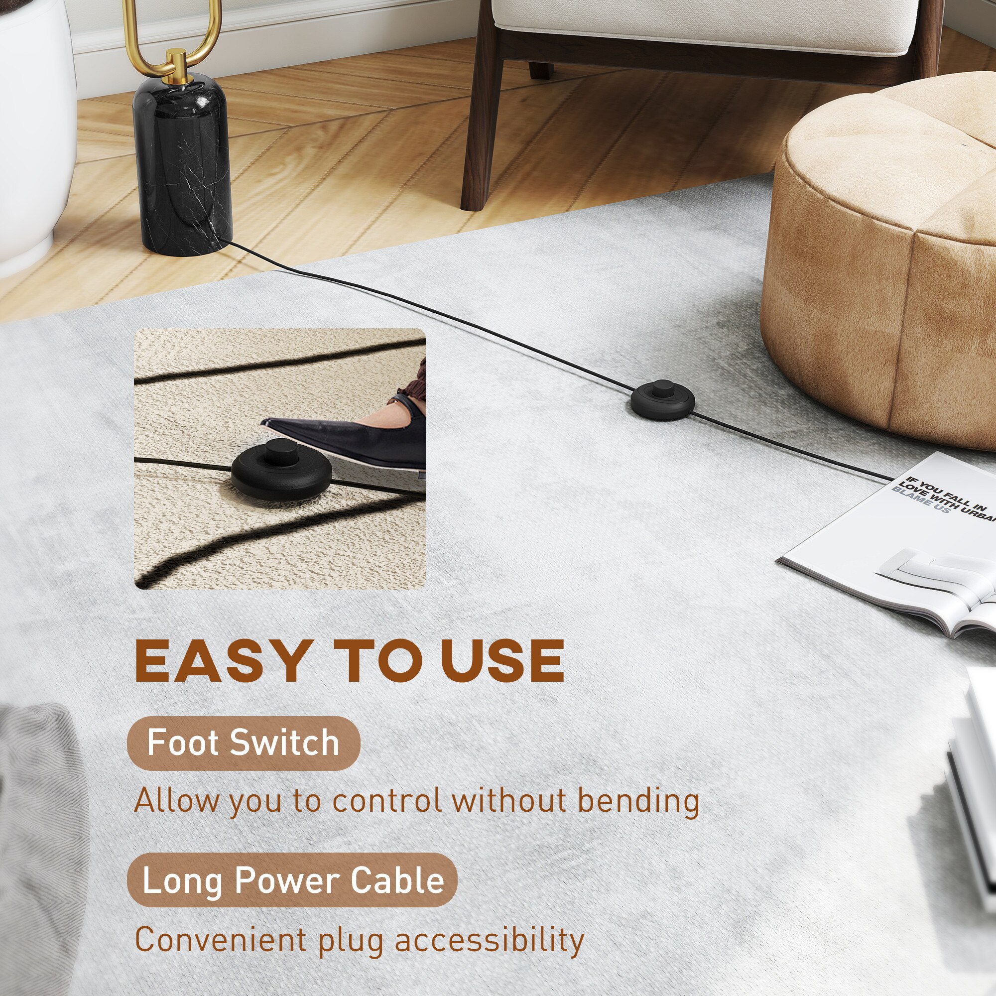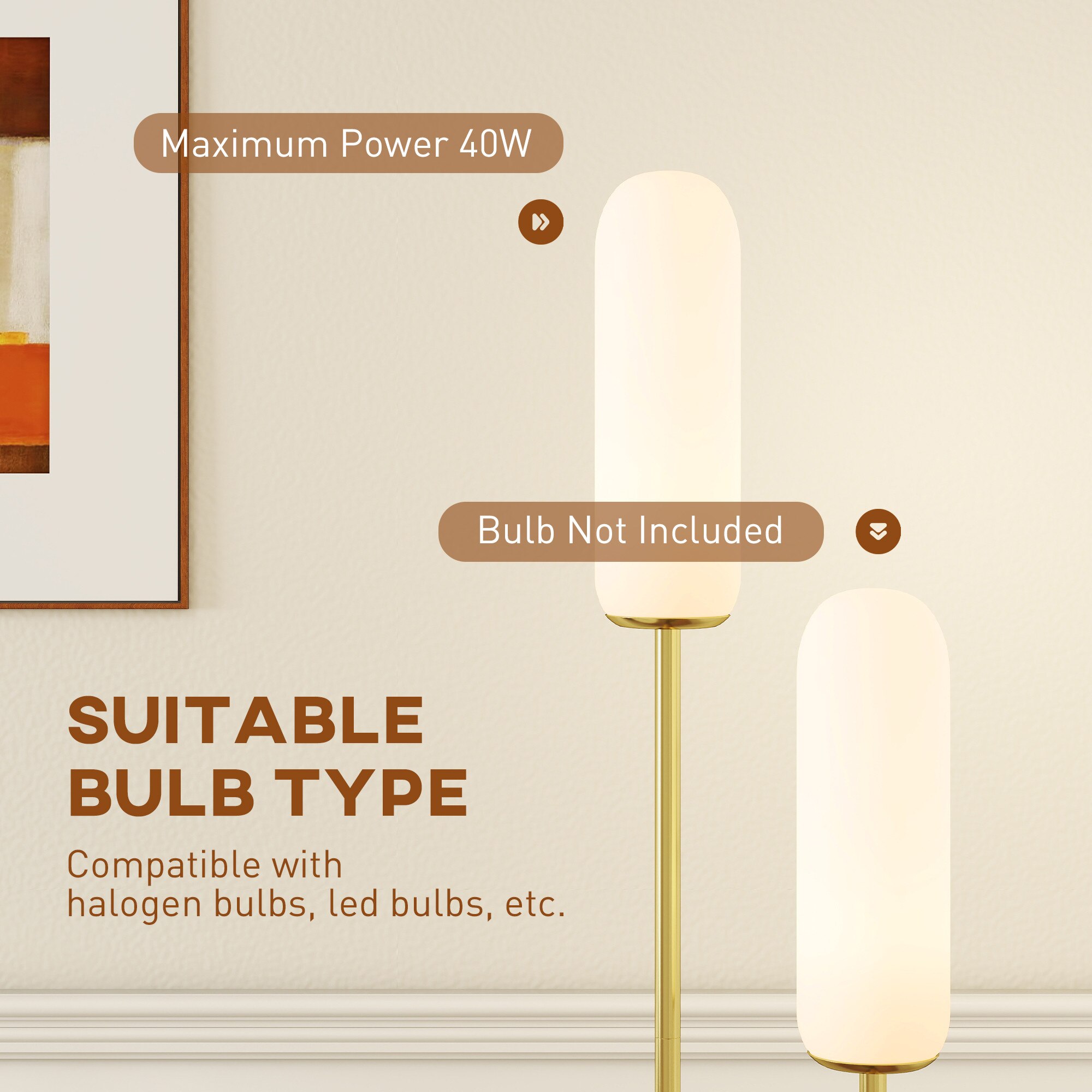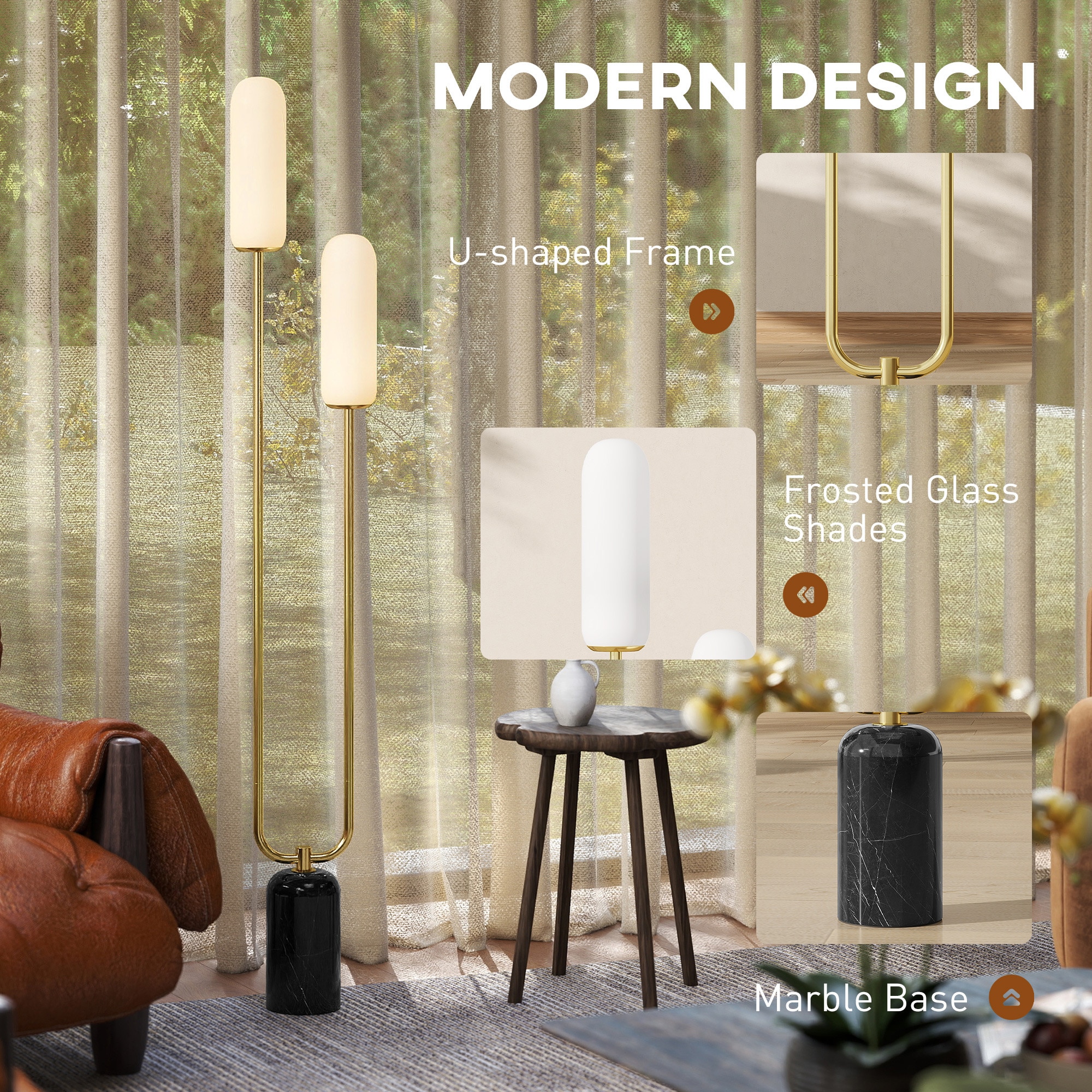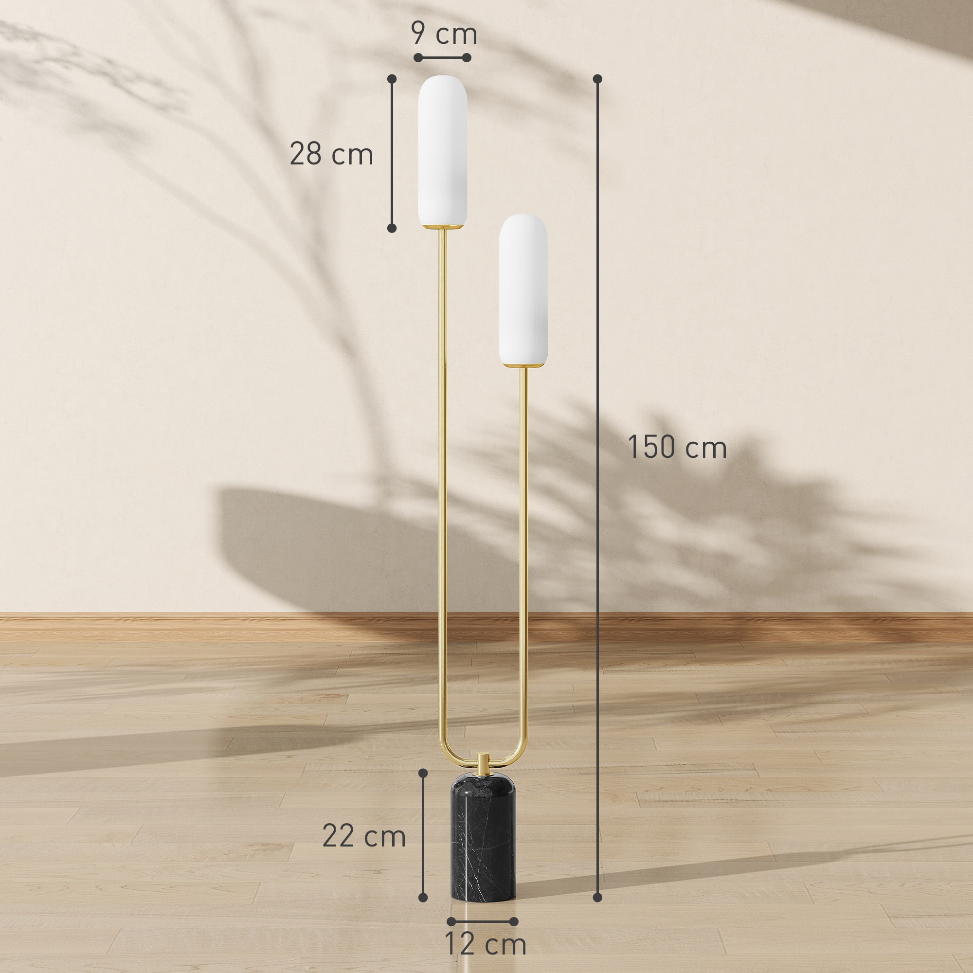 Înveseliți orice casă cu această lampă de podea rafinată HOMCOM, cu o ramă în formă de U și o bază robustă din marmură. Abajururile sale elegante din sticlă se îmbină perfect cu orice stil, în timp ce comutatorul de picior convenabil și cablul de alimentare de 1,8 metri asigură o poziționare flexibilă. Ideală pentru o varietate de becuri, această lampă modernă adaugă stil și caracter practic oricărei camere. LUMINĂ ELEGANTĂ: Rama în formă de U cu abajururi din sticlă mată a acestei lămpi de podea adaugă eleganță oricărei camere, cu o notă de stil modern. Designul metalic rafinat se combină armonios cu o bază robustă și stabilă din marmură. UȘOR DE PORNIT ȘI OPRIT: Datorită comutatorului de picior, puteți porni și opri lampa de podea chiar și fără a folosi mâinile. Cablul de alimentare de 1,8 m vă permite să o poziționați oriunde doriți. ILUMINARE ADAPTABILĂ: Soclul E14 al acestei lămpi moderne elegante este compatibil cu diverse tipuri de becuri, inclusiv LED și halogen, permițându-vă să alegeți iluminatul în funcție de nevoile dvs. ASAMBLARE RAPIDĂ: Asamblați cu ușurință lampa noastră de podea urmând instrucțiunile din manualul inclus și îmbunătățiți-vă camera de zi, dormitorul sau colțul de lectură. DIMENSIUNI: Dimensiuni totale: 26L x 12A x 150Î cm. Necesită asamblare - Designul modern al lămpii de podea îmbunătățește orice locuință; - Tubul de susținere în formă de U al lămpii de podea asigură o susținere robustă și elegantă; - Baza din marmură a lămpii moderne adaugă eleganță și stabilitate; - Două abajururi din sticlă distribuie frumos lumina; - Întrerupător de picior convenabil inclus; - Cablul de alimentare de 1,8 m vă permite să o amplasați oriunde doriți; - Soclul becului E14 acceptă becuri cu halogen și LED; - Necesită asamblare; - Designul modern al lămpii de podea îmbunătățește orice locuință; - Tubul de susținere în formă de U al lămpii de podea asigură o susținere robustă și elegantă; - Baza din marmură a lămpii moderne adaugă eleganță și stabilitate; - Două abajururi din sticlă distribuie frumos lumina; - Întrerupător de picior convenabil inclus; - Cablul de alimentare de 1,8 m vă permite să o amplasați oriunde doriți; - Soclul becului E14 acceptă becuri cu halogen și LED; - Necesită asamblare; - Culoare: Negru, alb, auriu; - Material: Metal, sticlă, marmură; - Dimensiuni totale: 26L x 12A x 150Î cm; - Dimensiuni abajur: Ø9 x 28Î cm; - Dimensiuni bază: Ø12 x 22Î cm; - Lungime cablu de alimentare: 1,8 m; - Soclu bec E14 (becul nu este inclus); - Putere bec: 40 W; - Tensiune: 220-240V, 50Hz; - 1 x Lampă de podea; - 1 x Manual de instrucțiuni;