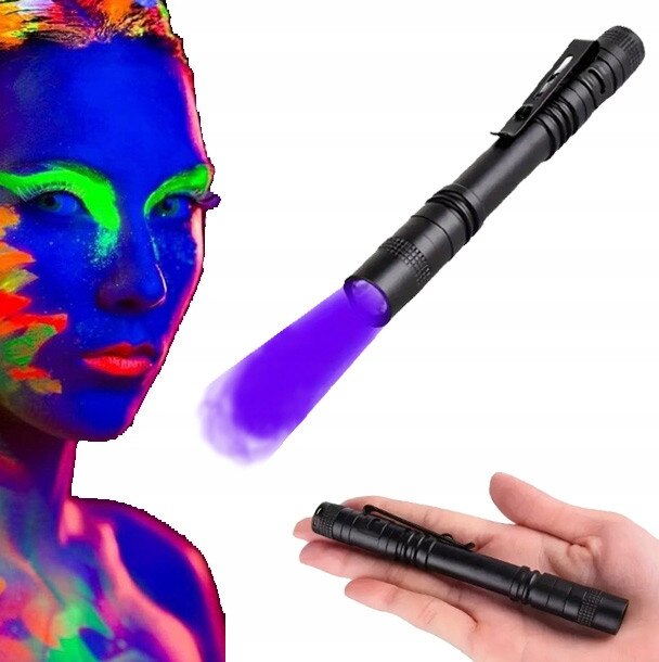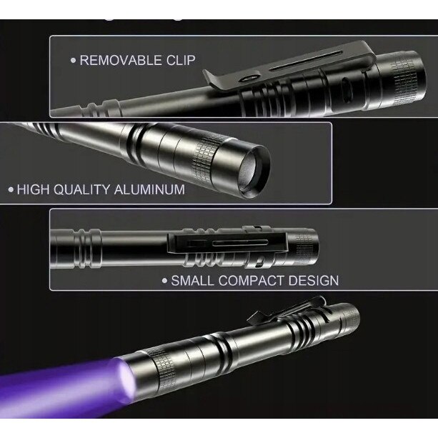 Lanterna UV 395nm super-practică, cu clemă tip pix, este un instrument indispensabil acasă și pe teren. Datorită luminii ultraviolete, permite detectarea: